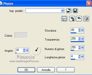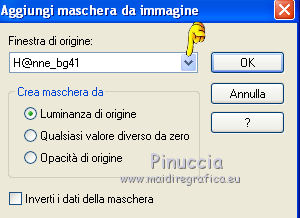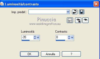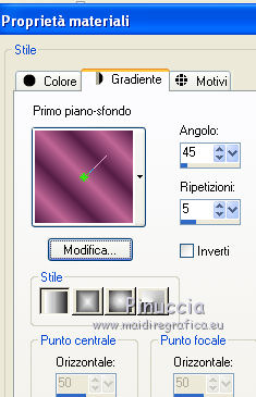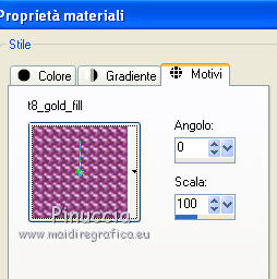 Apri la maschera e il motivo t8_gold fill in PSP e minimizzali con il resto del materiale. 1. Imposta il colore di primo piano con #541d47, e il colore di sfondo con #c06695. Apri una nuova immagine trasparente 700 x 500 pixels, e riempila con il colore di primo piano #541D47.2. Effetti>Plugins>Graphics Plus - Cross Shadow, con i settaggi standard. ![]() 3. Livelli>Nuovo livello raster. Riempi con il colore di sfondo #C06695.4. Livelli>Nuovo livello maschera>Da immagine. Apri il menu sotto la finestra di origine e vedrai la lista dei files aperti. Seleziona la maschera H@nne_bg41, con i seguenti settaggi: ![]() 5. Livelli>Elimina e rispondi sì alla domanda unire la maschera nel livello corrente. ![]() Livelli>Unisci>Unisci gruppo. 6. Apri il tube NS_05_0709 e vai a Modifica>Copia. Torna al tuo lavoro e vai a Modifica>Incolla come nuovo livello. Spostalo a sinistra.7. Livelli>Duplica. Immagine>Rifletti. 8. Apri il tube lizztish_pegasus e vai a Modifica>Copia. Torna al tuo lavoro e vai a Modifica>Incolla come nuovo livello. Spostalo in basso a sinistra.9. Cambia la modalità di miscelatura di questo livello in Luce netta. 10. Livelli>Duplica. Immagine>Rifletti. 11. Apri il tube TReagen_2714 e vai a Modifica>Copia. Torna al tuo lavoro e vai a Modifica>Incolla come nuovo livello. Spostalo in basso sul bordo.12. Livelli>Unisci>Unisci tutto (appiattisci). 13. Immagine>Aggiungi bordatura, 3 pixels, simmetriche, con il colore #C06695. Seleziona questo bordo con la bacchetta magica ![]() Passa il colore di sfondo a Motivi e seleziona il motivo t8_gold fill. ![]() Riempi la selezione con il motivo.Selezione>Deseleziona. 14. Immagine>Aggiungi bordatura, 25 pixels, simmetriche, con il colore #C06695. Seleziona questo bordo con la bacchetta magica ![]() Passa il colore di primo piano a Gradiente, stile Lineare. ![]() Riempi la selezione bordo con il gradiente.15. Regola>Luminosità e contrasto>Luminosità e contrasto. ![]() 16. Effetti>Effetti di trama>Nappa, con il colore #dcdcdc. ![]() Selezione>Deseleziona. 17. Immagine>Aggiungi bordatura, 3 pixels, simmetriche, con il colore #C06695. Seleziona questo bordo con la bacchetta magica ![]() e riempilo con il motivo t8_gold fill.Selezione>Deseleziona. 18. Apri il tube coin038 e vai a Modifica>Copia. Torna al tuo lavoro e vai a Modifica>Incolla come nuovo livello. Spostalo in alto a sinistra.19. Effetti>Plugins>Simple - Top left mirror. 20. Livelli>Unisci>Unisci tutto (appiattisci). Firma il tuo lavoro e salva in formato jpg. Se hai problemi o dubbi, o trovi un link non funzionante, o anche soltanto per un saluto, scrivimi. 23 Giugno 2012 |