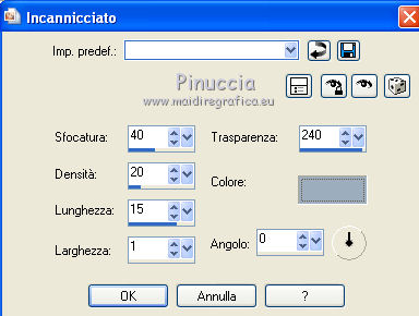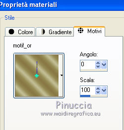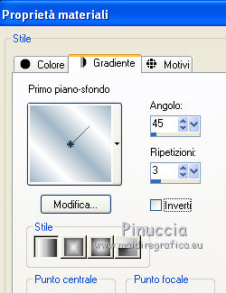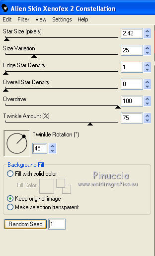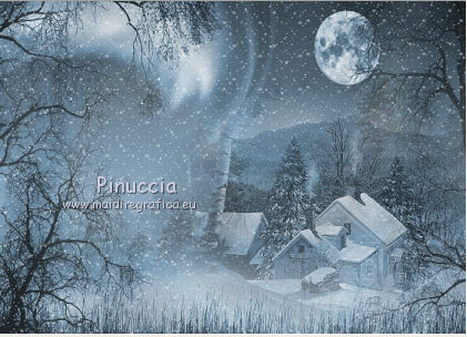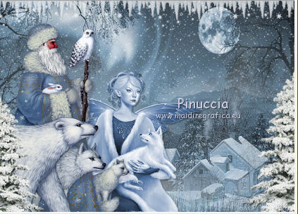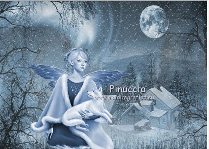 Apri tutto il materiale in PSP. 1. Apri una nuova immagine trasparente 700 x 500 pixels. 2. Imposta il colore di primo piano con #a2b6c5, e riempi l'immagine trasparente con questo colore.3. Effetti>Plugins>Graphics Plus - Cross Shadow. ![]() 4. Immagine>Rifletti. 5. Apri l'immagine "magie_hiver" e vai a Modifica>Copia. Torna al tuo lavoro e vai a Modifica>Incolla come nuovo livello. Abbassa l'opacità di questo livello all'80%. 6. Apri il tube "neige" e vai a Modifica>Copia. Torna al tuo lavoro e vai a Modifica>Incolla come nuovo livello. Abbassa l'opacità di questo livello al 50%. 7. Apri il tube "paysage_maison" e vai a Modifica>Copia. 11. Torna al tuo lavoro e vai a Modifica>Incolla come nuovo livello. Posiziona il tube in basso a destra.Cambia la modalità di miscelatura di questo livello in Luminanza, e abbassa l'opacità al 60%. ![]() 8. Apri il tube DL_RA_WinterFairySm e vai a Modifica>Copia. Torna al tuo lavoro e vai a Modifica>Incolla come nuovo livello. Regola>Tonalità e saturazione>Viraggio. ![]() Spostalo in basso a sinistra.![]() 9. Effetti>Effetti 3D>Sfalsa ombra, con il colore #28343e. ![]() 10. Apri il tube pere_animaux e vai a Modifica>Copia. Torna al tuo lavoro e vai a Modifica>Incolla come nuovo livello. Spostalo a sinistra.11. Apri il tube "glacons" e vai a Modifica>Copia. Torna al tuo lavoro e vai a Modifica>Incolla come nuovo livello. Spostalo in alto contro il bordo.Cambia la modalità di miscelatura di questo livello in Luminanza, e abbassa l'opacità all'85%. 12. Apri il tube "sapins" e vai a Modifica>Copia. Torna al tuo lavoro e vai a Modifica>Incolla come nuovo livello. Spostalo in basso.![]() 13. Apri il tube kz_day_17_wa e vai a Modifica>Copia. Torna al tuo lavoro e vai a Modifica>Incolla come nuovo livello. Spostalo il testo in alto a destra, come nel mio esempio.14. Livelli>Unisci>Unisci tutto (appiattisci). 15. Immagine>Aggiungi bordatura, 1 pixel, simmetriche, con il colore bianco. 16. Immagine>Aggiungi bordatura, 2 pixels, simmetriche, con il colore #435f85. Seleziona questo bordo con la bacchetta magica , sfumatura e tolleranza 0.17. Passa il colore di primo piano a Motivi e seleziona il motivo oro. ![]() Riempi la selezione con questo motivo.19. Immagine>Aggiungi bordatura, 25 pixels, simmetriche, con il colore #435f85. Seleziona questo bordo con la bacchetta magica ![]() Riporta il colore di primo piano al colore blu, e imposta il colore di sfondo con il bianco. Passa il colore di primo piano a Gradiente, stile lineare, ![]() Riempi la selezione con il gradiente.20. Effetti>Effetti di trama>Incannicciato, con il colore #9cadbd. ![]() 21. Selezione>Inverti. Effetti>Effetti 3D>Sfalsa ombra, con il colore #28343e. ![]() Selezione>Deseleziona. 22. Immagine>Aggiungi bordatura, 1 pixel, simmetriche, con il colore bianco. 23. Immagine>Aggiungi bordatura, 2 pixels, simmetriche, con il colore #435f85. Seleziona questo bordo con la bacchetta magica , sfumatura e tolleranza 0.e riempilo con il motivo oro.Selezione>Deseleziona. 24. Aggiungi il tuo nome e/o il tuo watermark su un nuovo livello. Livelli>Unisci>Unisci tutto (appiattisci). 25. Selezione>Seleziona tutto. Selezione>Modifica>Contrai - 31 pixels. 26. Livelli>Duplica - 2 volte. Attiva il livello inferiore. 27. Effetti>Plugins>Alien Skin Xenofex 2.0 - Constellation. ![]() 28. Attiva il livello della prima copia. Ripeti l'Effetto Constellation, cliccando una volta su Random Seed. 29. Attiva il livello della seconda copia. Ripeti l'Effetto Constellation, cliccando su Random Seed. Selezione>Deseleziona. Salva il lavoro in formato Animation Shop(*psp). ![]() 30. Apri Animation Shop e apri il lavoro che hai appena salvato. Modifica>Seleziona tutto. Animazione>Proprietà fotogramma, e imposta la velocità a 25. ![]() Controlla il risultato cliccando su Visualizza e salva in formato gif.Se hai problemi o dubbi, o trovi un link non funzionante, o anche soltanto per un saluto, scrivimi. 27 Novembre 2011 |