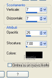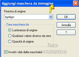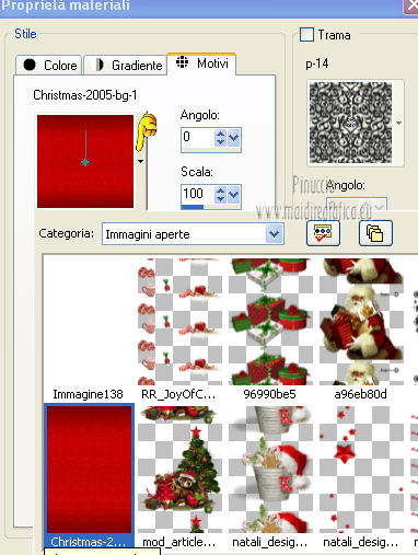 Apri la maschera in PSP e minimizzala con il resto del materiale. 1. Apri una nuova immagine bianca 670 x 590 pixels. ![]() 2. Livelli>Nuovo livello raster. Passa il colore di primo piano a Motivi, apri il menu e seleziona - nella categoria Immagini aperte - il motivo Christmas-2005-bg1. ![]() Riempi il livello con il motivo.3. Livelli>Nuovo livello maschera>Da immagine. Apri il menu sotto la finestra di origine e vedrai la lista dei files aperti. Seleziona la maschera bynbyn, con i seguenti settaggi. ![]() Livelli>Elimina, e rispondi sì alla domanda Unire la maschera nel livello corrente. ![]() Livelli>Unisci>Unisci gruppo. Immagine>Rifletti. 4. Effetti>Effetti 3D>Sfalsa ombra, con il colore nero. ![]() 5. Effetti>Effetti di bordo>Aumenta. 6. Apri il tube a96eb80d_Bagacum, e vai a Modifica>Copia. Torna al tuo lavoro e vai a Modifica>Incolla come nuovo livello. Spostalo come nell'esempio.![]() 7. Apri il tube mod_article5842 e vai a Modifica>Copia. Torna al tuo lavoro di partenza e vai a Modifica>Incolla come nuovo livello. Spostalo come nell'esempio.![]() 8. Effetti>Effetti 3D>Sfalsa ombra, con il colore nero. ![]() 9. Apri il tube natali_design_xmas10 e vai a Modifica>Copia. Torna al tuo lavoro di partenza e vai a Modifica>Incolla come nuovo livello. Spostalo nell'angolo in basso a destra.![]() 10. Apri il tube natali_design_xmas10add_twig3 e vai a Modifica>Copia. Torna al tuo lavoro e vai a Modifica>Incolla come nuovo livello. Spostalo in basso come nell'esempio.11. Effetti>Effetti 3D>Sfalsa ombra, con i settaggi precedenti. ![]() 12. Apri il tube 96990be5 e vai a Modifica>Copia. Torna al tuo lavoro e vai a Modifica>Incolla come nuovo livello. Sposta il tube sotto il sacco di babbo natale.![]() 13. Effetti>Effetti 3D>Sfalsa ombra, con i settaggi precedenti. ![]() 14. Apri il tube RR_JoyOf_Christmas_Element(mix) e vai a Modifica>Copia. Torna al tuo lavoro e vai a Modifica>Incolla come nuovo livello. Spostalo in basso.![]() 15. Apri il tube natali_design_xmas10add_star e vai a Modifica>Copia. Torna al tuo lavoro e vai a Modifica>Incolla come nuovo livello. Spostalo come nell'esempio.(cancella la stellina sul viso di Babbo Natale)![]() 16. Effetti>Effetti 3D>Sfalsa ombra, con il colore nero. ![]() 17. Livelli>Duplica. Immagine>Rifletti. 18. Firma il tuo lavoro. Livelli>Unisci>Unisci visibile e salva in formato jpg. Se vuoi conservare lo sfondo trasparente, chiudi il livello bianco di sfondo, e salva in formato png. ![]() ![]() Se hai problemi o dubbi, o trovi un link non funzionante, o anche soltanto per un saluto, scrivimi. 2 Dicembre 2012 |