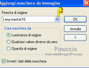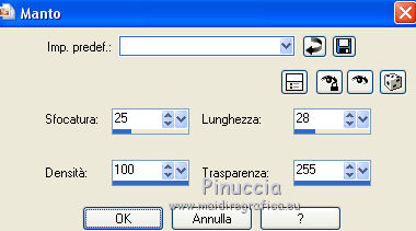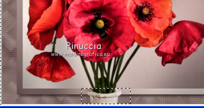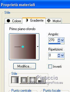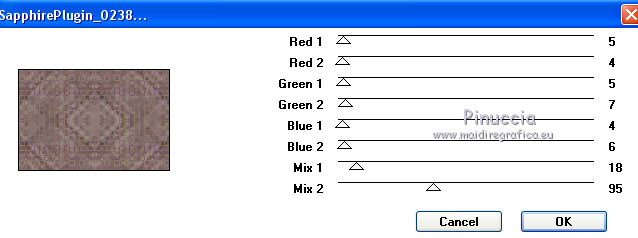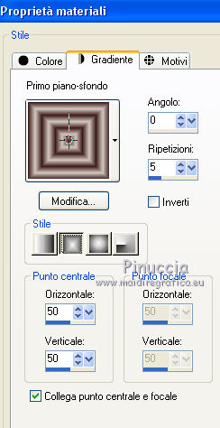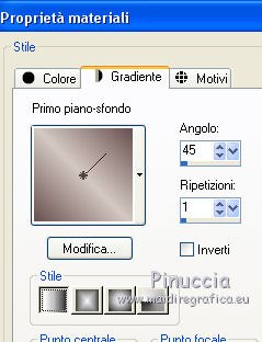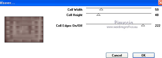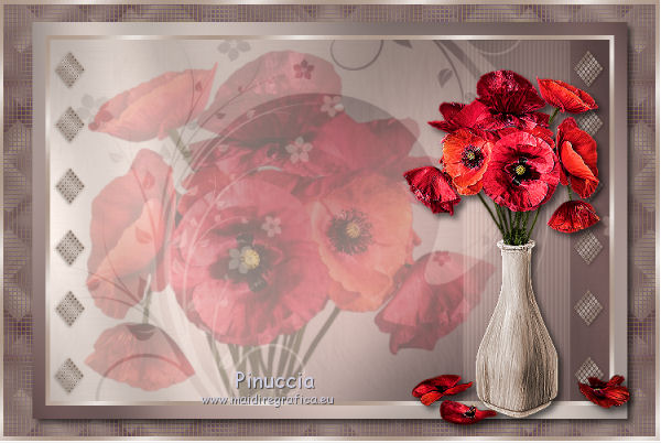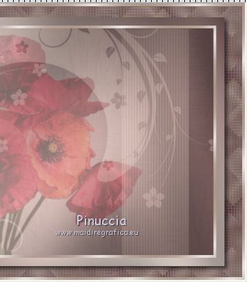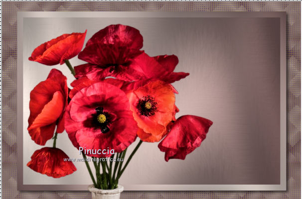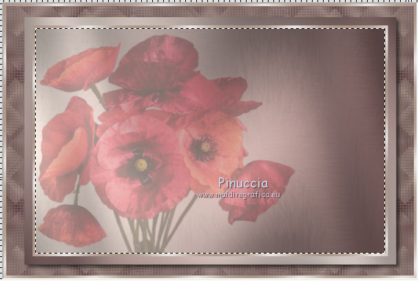 Apri la maschera in PSP e minimizzala con il resto del materiale. 1. Apri una nuova immagine trasparente 750 x 500 pixels. Imposta il colore di primo piano con #3d1d1b, e il colore di sfondo con #d4c9c2. Passa il colore di primo piano a Gradiente di primo piano/sfondo, stile Rettangolare. ![]() Riempi l'immagine trasparente con il gradiente.2. Regola>Sfocatura>Sfocatura gaussiana - raggio 25. ![]() 3. Effetti>Plugins>Toadies - Weaver. ![]() 4. Effetti>Plugins>Simple - Diamonds. 5. Effetti>Plugins>Sapphire Filters 03 - Sapphire Plugin 0238. ![]() 6. Imposta il colore di primo piano con #68504f, il colore di sfondo è sempre #d4c9c2. Passa il colore di primo piano a Gradiente di primo piano/sfondo, Stile Lineare. ![]() Livelli>Nuovo livello raster. Riempi con il gradiente.7. Immagine>Ridimensiona, al 90%, tutti i livelli non selezionato. 8. Effetti>Plugins>Graphics Plus - Cross Shadow. ![]() 9. Selezione>Seleziona tutto. Selezione>Mobile. Selezione>Modifica>Contrai - 15 pixels. 10. Riporta il colore di primo piano al colore iniziale #3d1d1b (il colore di sfondo è sempre #d4c9c2). e cambia i settaggi del gradiente. ![]() Riempi la selezione con il gradiente.11. Effetti>Plugins>Graphics Plus - Cross Shadow, con i settaggi precedenti. ![]() 12. Effetti>Effetti di trama>Manto. ![]() Selezione>Deseleziona. 13. Effetti>Effetti 3D>Sfalsa ombra, colore nero. ![]() 14. Apri il tube Dorien_Vase_with_RedFlowers e vai a Modifica>Copia. Torna al tuo lavoro e vai a Modifica>Incolla come nuovo livello. Immagine>Rifletti. Spostalo a sinistra.![]() 15. Attiva lo strumento Gomma ,e cancella la parte del tube che deborda in basso la cornice. ![]() Abbassa l'opacità di questo livello al 30%. 16. Apri il tube cadre_deco_marielou e vai a Modifica>Copia. Torna al tuo lavoro e vai a Modifica>Incolla come nuovo livello. 17. Attiva lo strumento Bacchetta magica , sfumatura e tolleranza 0,e clicca al centro della cornice per selezionarla. ![]() 18. Livelli>Nuovo livello raster. Riempi la selezione con il colore di sfondo #d4c9c2Livelli>Nuovo livello maschera>Da immagine. Apri il menu sotto la finestra di origine e vedrai la lista dei files aperti. Seleziona la maschera Leny-masker16, con i seguenti settaggi. ![]() Livelli>Elimina e rispondi sì alla domanda unire la maschera nel livello corrente. ![]() Livelli>Unisci>Unisci gruppo. Selezione>Deseleziona. Cambia la modalità di miscelatura di questo livello in Luce diffusa. 19. Apri il tube cadre2_deco_marielou, e vai a Modifica>Copia. Torna al tuo lavoro e vai a Modifica>Incolla come nuovo livello. Spostalo a destra.![]() 20. Apri il tube decoro1_moschino, e vai a Modifica>Copia. Torna al tuo lavoro e vai a Modifica>Incolla come nuovo livello. Posiziona a destra vicino al bordo della cornice interna.21. Livelli>Duplica. Immagine>Rifletti. 22. Apri il tube Dorien_Vase_with_RedFlowers e vai a Modifica>Copia. Torna al tuo lavoro e vai a Modifica>Incolla come nuovo livello. Immagine>Ridimensiona, al 48%, tutti i livelli non selezionato. Effetti>Effetti di bordo>Aumenta. Spostalo a destra sopra il tube deco2.![]() 23. Effetti>Effetti 3D>Sfalsa ombra, colore nero. ![]() 24. Apri il tube créalios 12220, e vai a Modifica>Copia. Torna al tuo lavoro e vai a Modifica>Incolla come nuovo livello. Spostalo a sinistra ben centrato.Livelli>Disponi>Sposta giù. 25. Livelli>Unisci>Unisci tutto. Firma il tuo lavoro e salva in formato jpg. Le vostre versioni ![]() Olimpia ![]() Se hai problemi o dubbi, o trovi un link non funzionante, o anche soltanto per un saluto, scrivimi. 20 Aprile 2014 |