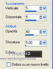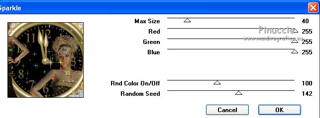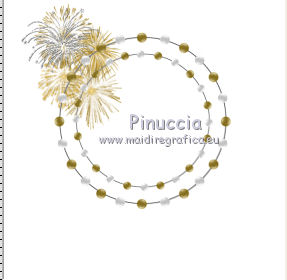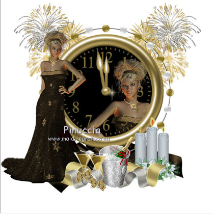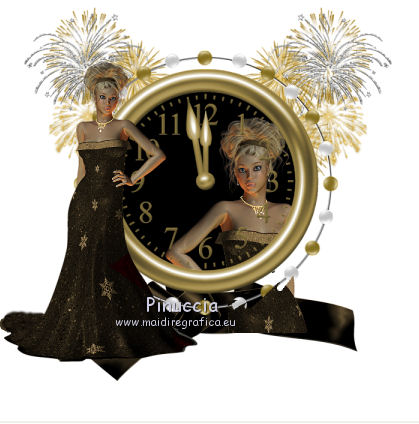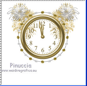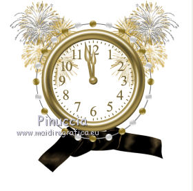 Apri tutto il materiale in PSP. 1. Apri una nuova immagine bianca 700 x 700 pixels. 2. Apri il tube FM-Happy New Year element-46 e vai a Modifica>Copia. Torna al tuo lavoro e vai a Modifica>Incolla come nuovo livello. Sposta il tube un po' pių a destra.3. Apri il tube FM-Happy New Year Element-28 e vai a Modifica>Copia. Torna al tuo lavoro e vai a Modifica>Incolla come nuovo livello. Spostalo in alto a sinistra.4. Livelli>Disponi>Sposta gių. ![]() 5. Livelli>Duplica. Immagine>Rifletti. Sposta questo tube un po' pių all'esterno - vedi il mio esempio.6. Apri il tube FM-Happy New Year Element-3 e vai a Modifica>Copia. Torna al tuo lavoro e vai a Modifica>Incolla come nuovo livello. Spostalo al centro del cerchio.![]() 7. Apri il tube FM-Happy New Year Element-4 e vai a Modifica>Copia. Torna al tuo lavoro e vai a Modifica>Incolla come nuovo livello. Spostalo sotto l'orologio.8. Livelli>Disponi>Sposta gių. ![]() 9. Attiva lo strumento Selezione a mano libera ![]() e seleziona il contorno dell'orologio. Livelli>Nuovo livello raster. Imposta il colore di primo piano con #1a150e, e riempi la selezione con questo colore.10. Apri il tube BNB-poser-new-year-freebie2 e vai a Modifica>Copia. Torna al tuo lavoro e vai a Modifica>Incolla come nuovo livello. Spostalo nell'orologio, a destra.11. Livelli>Disponi>Sposta gių. 12. Attiva lo strumento Gomma ![]() e cancella la parte del tube all'esterno dell'orologio. 13. Apri il tube BNB-poser-new-year-freebie e vai a Modifica>Copia. Torna al tuo lavoro e vai a Modifica>Incolla come nuovo livello. Spostalo a sinistra dell'orologio.14. Livelli>Disponi>Porta in alto. ![]() 15. Apri il tube "étoile" e vai a Modifica>Copia. Torna al tuo lavoro e vai a Modifica>Incolla come nuovo livello. Posiziona la stella sull'orologio.16. Apri il tube FM-Happy New Year Element-6 e vai a Modifica>Copia. Torna al tuo lavoro e vai a Modifica>Incolla come nuovo livello. Spostalo sotto l'orologio.![]() 17. Chiudi il colore di sfondo bianco. Livelli>Unisci>Unisci visibile. 18. Effetti>Effetti 3D>Sfalsa ombra, con il colore #302c26. ![]() 19. Riapri il livello di sfondo. 20. Apri il tube "texte" e vai a Modifica>Copia. Torna al tuo lavoro e vai a Modifica>Incolla come nuovo livello. Posiziona il testo in basso - vedi il mio esempio.21. Attiva lo strumento Bacchetta magica , sfumatura e tolleranza 0,e clicca all'interno dell'orologio per selezionarlo. se preferisci, puoi anche usare lo strumento Selezione , cerchio22. Effetti>Plugins>VM Natural - Sparkle. ![]() 23. Livelli>Unisci>Unisci tutto. Firma il tuo lavoro e salva in formato jpg. Se hai problemi o dubbi, o trovi un link non funzionante, o anche soltanto per un saluto, scrivimi.