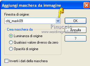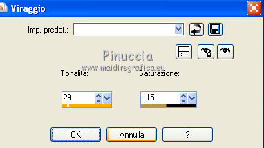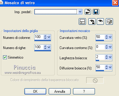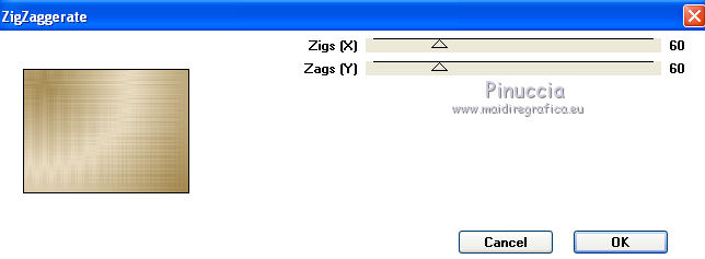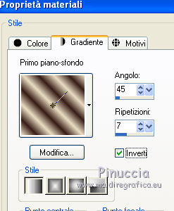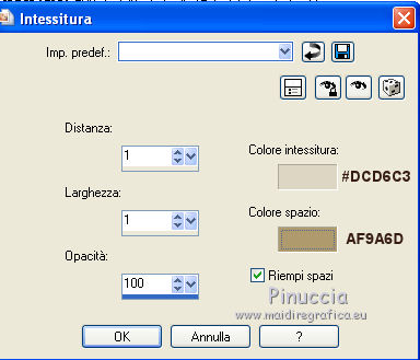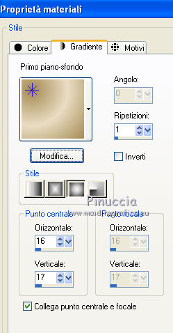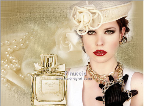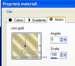 Apri la maschera in PSP e minimizzala con il resto del materiale. 1. Imposta il colore di primo piano con #A48A52, e il colore di sfondo con #E9DDC3. Passa il colore di primo piano a Gradiente, con i seguenti settaggi. ![]() 2. Apri una nuova immagine trasparente 600 x 450 pixels, e riempila con il gradiente.3. Effetti>Plugins>Funhouse - ZigZaggerate. ![]() 4. Effetti>Plugins>FM Tile Tools - Blend Emboss, con i settaggi standard. ![]() 5. Passa il colore di primo piano a Motivi e tra i motivi troverai la lista dei files aperti. Seleziona il motivo oro cmv-gold. ![]() Livelli>Nuovo livello raster. Riempi con il motivo oro.6. Livelli>Nuovo livello maschera>Da immagine. Apri il menu sotto la finestra di origine e vedrai la lista dei files aperti. Tra questi la maschera. Seleziona la maschera cbj_mask09, con i seguenti settaggi: ![]() Livelli>Elimina e rispondi sì alla domanda unire la maschera nel livello corrente. ![]() Livelli>Unisci>Unisci gruppo. 7. Effetti>Effetti di trama>Mosaico di vetro. ![]() 8. Effetti>Effetti 3D>Sfalsa ombra, con il colore #483b1e. ![]() 9. Apri il tube rose_perles e vai a Modifica>Copia. Torna al tuo lavoro e vai a Modifica>Incolla come nuovo livello. Spostalo a sinistra.10. Regola>Tonalità e saturazione>Viraggio. ![]() 11. Livelli>Duplica. Livelli>Unisci>Unisci giù. 12. Apri il tube face07bymido e vai a Modifica>Copia. Torna al tuo lavoro e vai a Modifica>Incolla come nuovo livello. Spostalo a destra.13. Apri il tube parfum_miss_dior_cherie e vai a Modifica>Copia. Torna al tuo lavoro e vai a Modifica>Incolla come nuovo livello. Sposta a sinistra del tube della donna, coprendo il taglio netto del braccio della donna.![]() 14. Apri il tube anello_dior e vai a Modifica>Copia. Torna al tuo lavoro e vai a Modifica>Incolla come nuovo livello. Immagine>Ridimensiona, all'85%, tutti i livelli non selezionato. Effetti>Effetti di bordo>Aumenta. 15. Spostalo a sinistra, a fianco del profumo.16. Regola>Tonalità e saturazione>Viraggio. ![]() 17. Effetti>Effetti 3D>Sfalsa ombra, con il colore #483b1e. ![]() 18. Apri il tube texte_miss_dior e vai a Modifica>Copia. Torna al tuo lavoro e vai a Modifica>Incolla come nuovo livello. Spostalo in alto a sinistra.19. Livelli>Unisci>Unisci tutto (appiattisci). 20. Immagine>Aggiungi bordatura, 2 pixels, simmetriche, con il colore #371c16. Immagine>Aggiungi bordatura, 2 pixels, simmetriche, con un colore qualsiasi, purchè non presente nell'immagine. Seleziona questo bordo con la bacchetta magica , sfumatura e tolleranza 0,e riempilo con il motivo oro.Selezione>Deseleziona. Immagine>Aggiungi bordatura, 2 pixels, simmetriche, con il colore #371c16. 21. Imposta il colore di primo piano con #371c16, e il colore di sfondo con #e9ddc3. Passa il colore di primo piano a Gradiente lineare, con i seguenti settaggi. ![]() 22. Immagine>Aggiungi bordatura, 20 pixels, simmetriche, con il colore #e9ddc3. Seleziona questo bordo con la bacchetta magica ![]() e riempilo con il gradiente.23. Effetti>Effetti di trama>Intessitura. ![]() Selezione>Deseleziona. 24. Immagine>Aggiungi bordatura, 2 pixels, simmetriche, con il colore #371c16. Immagine>Aggiungi bordatura, 2 pixels, simmetriche, con un colore qualsiasi, purchè non presente nell'immagine. Seleziona questo bordo con la bacchetta magica , sfumatura e tolleranza 0,e riempilo con il motivo oro.Selezione>Deseleziona. Immagine>Aggiungi bordatura, 2 pixels, simmetriche, con il colore #371c16. 25. Apri il tube deco027 e vai a Modifica>Copia. Torna al tuo lavoro e vai a Modifica>Incolla come nuovo livello. Spostalo nell'angolo in alto a sinistra.23. Effetti>Plugins>Simple - Top Left Mirror. 24. Livelli>Unisci>Unisci tutto (appiattisci). Firma il tuo lavoro e salva in formato jpg. Se hai problemi o dubbi, o trovi un link non funzionante, o anche soltanto per un saluto, scrivimi. 27 Giugno 2011 |