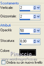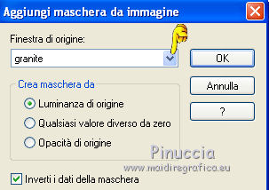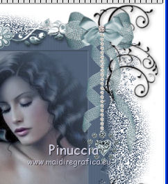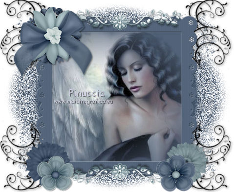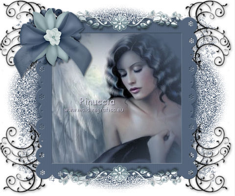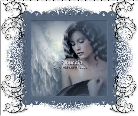 Apri la maschera in PSP e minimizzala con il resto del materiale. 1. Imposta il colore di primo piano con il colore bianco #ffffff. Apri una nuova immagine trasparente 600 x 500 pixels, e riempila con il colore bianco.2. Imposta il colore di primo piano con #3c4e65. Livelli>Nuovo livello raster. Riempi il livello con il colore di primo piano.3. Livelli>Nuovo livello maschera>Da immagine. Apri il menu sotto la finestra di origine e vedrai la lista dei files aperti. Tra questi la maschera. Seleziona la maschera granite, con i seguenti settaggi: ![]() Effetti>Effetti di bordo>Aumenta. Livelli>Unisci>Unisci gruppo. 4. Apri il tube doodle_aj06 e vai a Modifica>Copia. Torna al tuo lavoro e vai a Modifica>Incolla come nuovo livello. Spostalo nell'angolo in alto a sinistra.![]() 5. Effetti>Plugins>Simple - Top Left mirror. 6. Effetti>Effetti 3D>Sfalsa ombra, con il colore nero. ![]() 7. Effetti>Effetti di bordo>Aumenta. 8. Apri l'immagine "ange" e vai a Modifica>Copia. Torna al tuo lavoro e vai a Modifica>Incolla come nuovo livello. 9. Apri il tube LC_DBD_Frame e vai a Modifica>Copia. Torna al tuo lavoro e vai a Modifica>Incolla come nuovo livello. E la cornice sarà correttamente posizionata sull'immagine. ![]() 10. Apri il tube deco_barre e vai a Modifica>Copia. Torna al tuo lavoro e vai a Modifica>Incolla come nuovo livello. Spostalo in alto al centro, sulla cornice.11. Livelli>Duplica. Immagine>Capovolgi. 12. Apri il tube LC_DBD_Satin_Flower e vai a Modifica>Copia. Torna al tuo lavoro e vai a Modifica>Incolla come nuovo livello. Spostalo nell'angolo in alto a sinistra della cornice.![]() 13. Apri il tube LC_DBD_Flower1 e vai a Modifica>Copia. Torna al tuo lavoro e vai a Modifica>Incolla come nuovo livello. Spostalo nell'angolo in basso a sinistra.14. Apri il tube LC_DBD_Flower2 e vai a Modifica>Copia. Torna al tuo lavoro e vai a Modifica>Incolla come nuovo livello. Spostalo nell'angolo in basso a destra.![]() 15. Apri il tube bow1 e vai a Modifica>Copia. Torna al tuo lavoro e vai a Modifica>Incolla come nuovo livello. Spostalo nell'angolo in alto a destra.16. Apri il tube ceco_coeur e vai a Modifica>Copia. Torna al tuo lavoro e vai a Modifica>Incolla come nuovo livello. Spostalo sul nodo del nastro.![]() 17. Livelli>Unisci>Unisci tutto (appiattisci). Firma il tuo lavoro e salva in formato jpg. Se hai problemi o dubbi, o trovi un link non funzionante, o anche soltanto per un saluto, scrivimi. 29 Giugno 2011 |