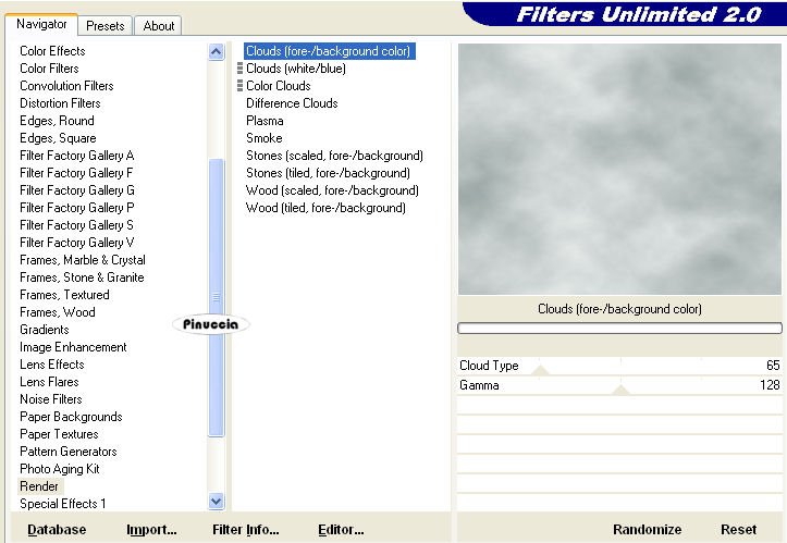 4. Effetti>Plugins>Filters Unlimited 2.0 - Render - Clouds(for/background).