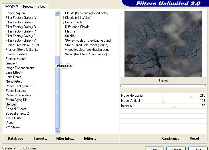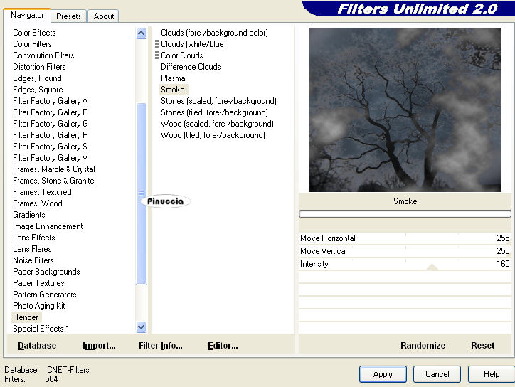 12. Effetti>Plugins>Filters Unlimited - Render - Smoke, con i seguenti settaggi.