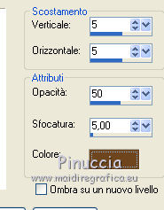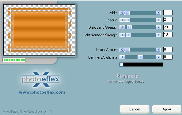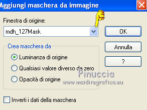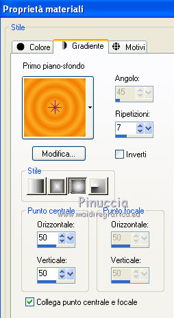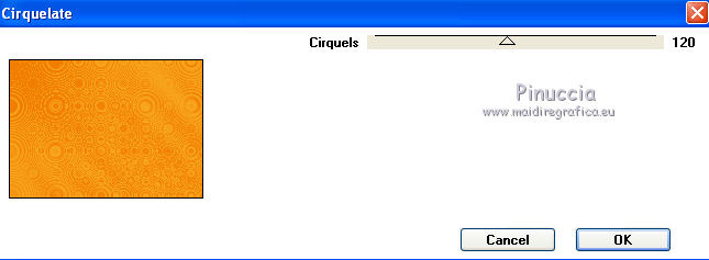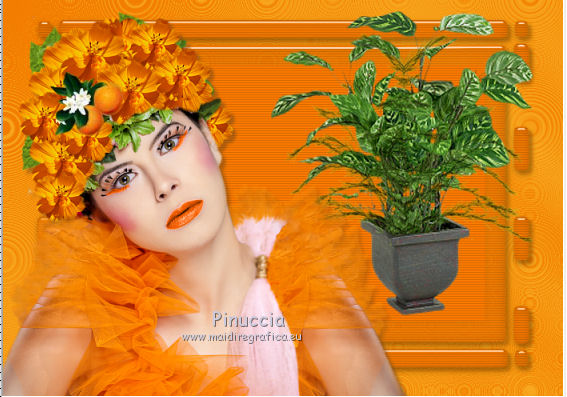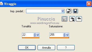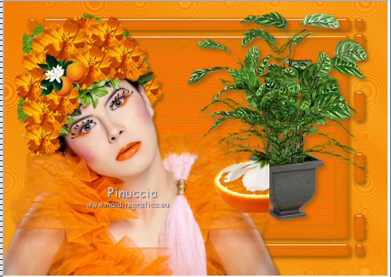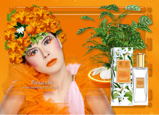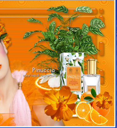 Apri la maschera in PSP e minimizzala con il resto del materiale. 1. Imposta il colore di primo piano con #f27d00, e il colore di sfondo con #f8ab22. Passa il colore di primo piano a Gradiente, con i seguenti settaggi. ![]() 2. Apri una nuova immagine trasparente 700 x 500 pixels, e riempila con il gradiente.3. Effetti>Plugins>Funhouse - Cirquelate. ![]() 4. Livelli>Nuovo livello raster. Imposta il colore di primo piano con #ff8800. Riempi con il colore di primo piano.5. Livelli>Nuovo livello maschera>Da immagine. Apri il menu sotto la finestra di origine e vedrai la lista dei files aperti. Tra questi la maschera. Seleziona la maschera mdh_127Mask, con i seguenti settaggi: ![]() Livelli>Elimina e rispondi sì alla domanda unire la maschera nel livello corrente. ![]() Livelli>Unisci>Unisci gruppo. 6. Immagine>Ridimensiona, al 90%, tutti i livelli non selezionato. 7. Effetti>Plugins>Alien Skin Eye Candy 5 Impact - Glass. ![]() 8. Effetti>Plugins>Photo Effex - Scanlines. ![]() 9. Effetti>Effetti 3D>Sfalsa ombra, con il colore #6e461e. ![]() 11. Regola>Tonalità e saturazione>Viraggio. ![]() 12. Apri il tube Anny_orange_blossom e vai a Modifica>Copia. Torna al tuo lavoro e vai a Modifica>Incolla come nuovo livello. Spostalo a sinistra.13. Effetti>Effetti 3D>Sfalsa ombra, con il colore #6e461e. ![]() 14. Apri il tube plant02 e vai a Modifica>Copia. Torna al tuo lavoro e vai a Modifica>Incolla come nuovo livello. Livelli>Disponi>Sposta giù. Spostalo a destra, come nell'esempio.![]() 15. Effetti>Effetti 3D>sfalsa ombra, con il colore #6e461e. ![]() 16. Attiva il livello superiore. Apri il tube orange blossom by bluewave e vai a Modifica>Copia. Torna al tuo lavoro e vai a Modifica>Incolla come nuovo livello. Sposta questo tube a destra, come nell'esempio.![]() 17. Apri il tube YARDLEY_orange_blossom e vai a Modifica>Copia. Torna al tuo lavoro e vai a Modifica>Incolla come nuovo livello. Sposta il tube a destra.![]() 18. Apri il tube LD_fleur_orange e vai a Modifica>Copia. Torna al tuo lavoro e vai a Modifica>Incolla come nuovo livello. Sposta il fiore in basso a destra.![]() 19. Apri il tube LD_parfum_orange e vai a Modifica>Copia. Torna al tuo lavoro e vai a Modifica>Incolla come nuovo livello. Spostalo nell'angolo in basso a destra, come nell'esempio.![]() 20. Livelli>Unisci>Unisci tutto (appiattisci). 21. Immagine>Aggiungi bordatura, 2 pixels, simmetriche, con il colore #fcc233. Immagine>Aggiungi bordatura, 20 pixels, simmetriche, con il colore #f27d00. Seleziona questo bordo con la bacchetta magica ![]() 22. Livelli>Nuovo livello raster. 23. Effetti>Plugins>Alien Skin Eye Candy 5 Impact - Glass, con i settaggi precedenti. 24. Regola>Tonalità e saturazione>Viraggio, con i settaggi precedenti. ![]() 25. Effetti>Plugins>Photo Effex - Scanlines, con i settaggi precedenti. Selezione>Deseleziona. 26. Immagine>Aggiungi bordatura, 2 pixels, simmetriche, con il colore #fcc233. 27. Apri il tube etoiles, e vai a Modifica>Copia. Torna al tuo lavoro e vai a Modifica>Incolla come nuovo livello. Cambia la modalità di miscelatura di questo livello in Filtra. 28. Livelli>Unisci>Unisci tutto (appiattisci). Firma il tuo lavoro e salva in formato jpg. Se hai problemi o dubbi, o trovi un link non funzionante, o anche soltanto per un saluto, scrivimi. 27 Giugno 2011 |