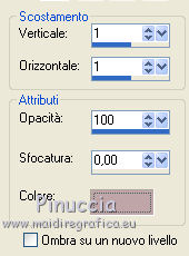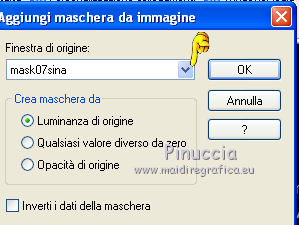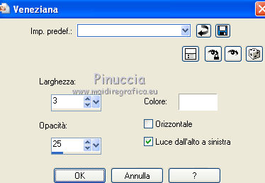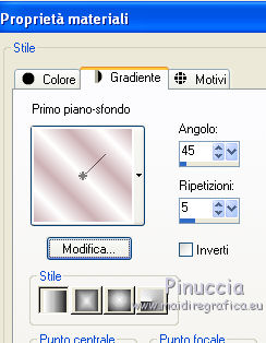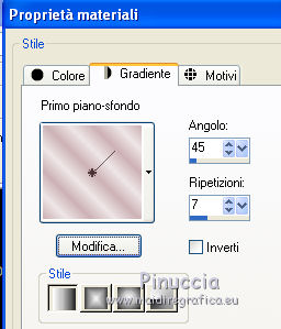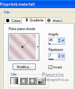 Apri la maschera in PSP e minimizzala con il resto del materiale. 1. Imposta il colore di primo piano con #CCB1B5, e il colore di sfondo con #EEE6E7. Passa il colore di primo piano a Gradiente, stile Lineare, con i seguenti settaggi. ![]() 2. Apri una nuova immagine trasparente 640 x 490 pixels, e riempila con il gradiente.3. Effetti>Effetti di trama>Trama, con i seguenti settaggi. ![]() 4. Livelli>Nuovo livello raster. 5. Cambia il colore di sfondo con il bianco #FFFFFF. Cambia le ripetizioni del Gradiente. ![]() 6. Riempi il nuovo livello con il gradiente.7. Livelli>Nuovo livello maschera>Da immagine. Apri il menu sotto la finestra di origine e vedrai la lista dei files aperti. Tra questi la maschera. Seleziona la maschera mask07, con i seguenti settaggi: ![]() Livelli>Elimina e rispondi sì alla domanda unire la maschera nel livello corrente. ![]() Livelli>Unisci>Unisci gruppo. 8. Effetti>Effetti 3D>Sfalsa ombra, con il colore #BFA5A8. ![]() Immagine>Capovolgi. 9. Apri il tube "cadre dentelle" e vai a Modifica>Copia. Torna al tuo lavoro e vai a Modifica>Incolla come nuovo livello. 10. Apri l'immagine "lilas" e vai a Modifica>Copia. Torna al tuo lavoro e vai a Modifica>Incolla come nuovo livello. 11. Livelli>Nuovo livello raster. 12. Riporta nuovamente il colore #EEE6E7 a colore di sfondo. Riporta le ripetizioni del gradiente a 7. ![]() Riempi il livello con questo gradiente.13. Immagine>Ridimensiona, al 75%, tutti i livelli non selezionato. ![]() 14. Selezione>Seleziona tutto. Selezione>Mobile. Selezione>Modifica>Contrai - 5 pixels. Premi sulla tastiera il tasto CANC. 15. Effetti>Effetti 3D>Sfalsa ombra, come al punto 8. ![]() Ripeti l'Effetto Sfalsa ombra, cambiando verticale e orizzontale con -1. 16. Apri il tube "perles" e vai a Modifica>Copia. Torna al tuo lavoro e vai a Modifica>Incolla come nuovo livello. 17. Apri il tube "strik" e vai a Modifica>Copia. Torna al tuo lavoro e vai a Modifica>Incolla come nuovo livello. Spostalo nell'angolo in basso a sinistra.Livelli>Duplica. Immagine>Rifletti. Immagine>Capovolgi. 18. Apri il tube KittyS-Dewie e vai a Modifica>Copia. Torna al tuo lavoro e vai a Modifica>Incolla come nuovo livello. Spostalo in basso a sinistra.19. Apri il tube "lilas1" e vai a Modifica>Copia. Torna al tuo lavoro e vai a Modifica>Incolla come nuovo livello. Spostalo nell'angolo in basso a destra.20. Apri il tube "boucle" e vai a Modifica>Copia. Torna al tuo lavoro e vai a Modifica>Incolla come nuovo livello. Spostalo nell'angolo in alto a destra.21. Apri il tube "papillons" e vai a Modifica>Copia. Torna al tuo lavoro e vai a Modifica>Incolla come nuovo livello. Spostalo come nel mio esempio.22. Livelli>Unisci>Unisci tutto (appiattisci). 23. Immagine>Aggiungi bordatura, 1 pixel, simmetriche, con il colore #5A3C40. Immagine>Aggiungi bordatura, 2 pixes, simmetriche, con il colore #BFA5A8. Immagine>Aggiungi bordatura, 1 pixel, simmetriche, con il colore #5A3C40. Immagine>Aggiungi bordatura, 7 pixels, simmetriche, con il colore #BFA5A8. 24. Seleziona questo bordo con la bacchetta magica , sfumatura e tolleranza 0.25. Effetti>Effetti di trama>Veneziana, come al punto 3. ![]() Selezione>Deseleziona. 26. Immagine>Aggiungi bordatura, 1 pixel, simmetriche, con il colore #5A3C40. Firma il tuo lavoro e salva in formato jpg. Se hai problemi o dubbi, o trovi un link non funzionante, o anche soltanto per un saluto, scrivimi. 31 Luglio 2011 |