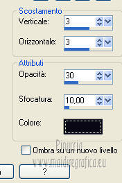 Apri la maschera in PSP e minimizzala con il resto del materiale. 1. Apri una nuova immagine bianca 630 x 630 pixels. 2. Livelli>Nuovo livello raster. Selezione>Seleziona tutto. 3. Apri SD QE PAPER 2 e vai a Modifica>Copia. Torna al tuo lavoro e vai a Modifica>Incolla nella selezione. Selezione>Deseleziona. 4. Livelli>Nuovo livello maschera>Da immagine. Apri il menu sotto la finestra di origine e vedrai la lista dei files aperti. Seleziona la maschera cbj_Mask09, con i seguenti settaggi: ![]() Livelli>Elimina e rispondi sì alla domanda unire la maschera nel livello corrente. ![]() Livelli>Unisci>Unisci gruppo. 5. Apri il tube SD QE FRAME e vai a Modifica>Copia. Torna al tuo lavoro e vai a Modifica>Incolla come nuovo livello. 6. Apri il tube SD QE ROSE GARDEN e vai a Modifica>Copia. Torna al tuo lavoro e vai a Modifica>Incolla come nuovo livello. Sposta il tube a sinistra.7. Effetti>Effetti 3D>Sfalsa ombra, con il colore #0a0816. ![]() 8. Apri il tube SD QE JEWELRY e vai a Modifica>Copia. Torna al tuo lavoro e vai a Modifica>Incolla come nuovo livello. Spostalo nell'angolo destro della cornice.![]() Effetti>Effetti 3D>Sfalsa ombra, con i settaggi precedenti. ![]() 9. Apri il tube 03beauty141007 e vai a Modifica>Copia. Torna al tuo lavoro e vai a Modifica>Incolla come nuovo livello. Spostalo un po' più in alto.10. Apri il tube SD QE FEATHER e vai a Modifica>Copia. Torna al tuo lavoro e vai a Modifica>Incolla come nuovo livello. Spostalo in basso a destra.11. Apri il tube SD QE GLITTER BITS e vai a Modifica>Copia. Torna al tuo lavoro e vai a Modifica>Incolla come nuovo livello. Sposta in basso, sopra il bordo.12. Apri il SD QE LEAVES2 e vai a Modifica>Copia. Torna al tuo lavoro e vai a Modifica>Incolla come nuovo livello. Spostalo in basso, a coprire la base del tube.![]() 13. Apri il tube SD QE HAT e vai a Modifica>Copia. Torna al tuo lavoro e vai a Modifica>Incolla come nuovo livello. Spostalo nell'angolo in basso a destra.![]() 14. Effetti>Effetti 3D>Sfalsa ombra, con il colore #0a0816. ![]() 15. Apri il tube SD QE RIBBON 2 e vai a Modifica>Copia. Torna al tuo lavoro e vai a Modifica>Incolla come nuovo livello. Spostalo in basso.Effetti>Effetti 3D>Sfalsa ombra, con il colore #0a0816. ![]() 16. Apri il tube SD QE BOTTLE e vai a Modifica>Copia. Torna al tuo lavoro e vai a Modifica>Incolla come nuovo livello. Sposta il tube in basso a sinistra.Effetti>Effetti 3D>Sfalsa ombra - colore #0a0816. ![]() 17. Apri il tube SD QE ROSES GARDEN 2 e vai a Modifica>Copia. Torna al tuo lavoro e vai a Modifica>Incolla come nuovo livello. Sposta il tube in basso.![]() Effetti>Effetti 3D>Sfalsa ombra, colore #0a0816. ![]() 18. Livelli>Unisci>Unisci tutto. Firma il tuo lavoro e salva in formato jpg. Se hai problemi o dubbi, o trovi un link non funzionante, o anche soltanto per un saluto, scrivimi. 9 Novembre 2012 |