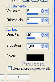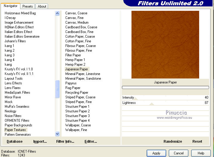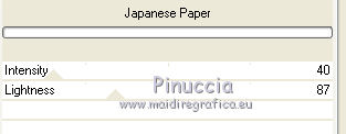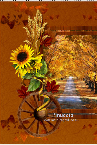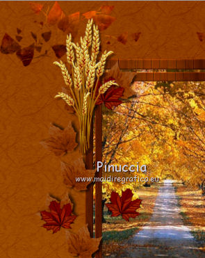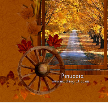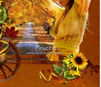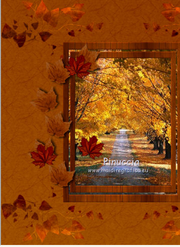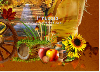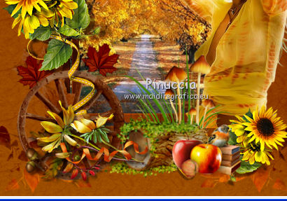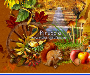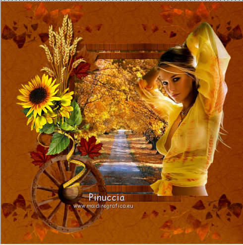 Apri tutto il materiale in PSP. 1. Imposta il colore di primo piano con #8b3700, e il colore di sfondo con #dd9f09. Passa il colore di primo piano a Gradiente, stile Radiale. ![]() 2. Apri una nuova immagine trasparente 650 x 650 pixels, e riempila con il gradiente.3. Effetti>Plugins>Filters Unlimited 2.0 - Paper Textures - Japanese Paper. ![]() 4. Apri il tube feuilles_Lea2 e vai a Modifica>Copia. Torna al tuo lavoro e vai a Modifica>Incolla come nuovo livello. Spostalo in alto a sinistra,non troppo vicino ai bordi. ![]() 5. Effetti>Plugins>Simple - Top Left Mirror. Cambia la modalità di miscelatura di questo livello in Sovrapponi. 6. Apri l'immagine paysage e vai a Modifica>Copia. Torna al tuo lavoro e vai a Modifica>Incolla come nuovo livello. 7. Apri cadre_bois_Lea e vai a Modifica>Copia. Torna al tuo lavoro e vai a Modifica>Incolla come nuovo livello. La cornice si posizionerà esattamente sopra il paesaggio. 8. Apri il tube feuilles_Lea e vai a Modifica>Copia. Torna al tuo lavoro e vai a Modifica>Incolla come nuovo livello. Spostalo a sinistra.![]() 9. Apri il tube HighFour_Autumn_Element12 e vai a Modifica>Copia. Torna al tuo lavoro e vai a Modifica>Incolla come nuovo livello. Sposta anche questo tube a sinistra.![]() 10. Effetti>Effetti 3D>Sfalsa ombra, con il colore nero. ![]() 11. Apri il tube florju_autumnfairyland_elmt (14) e vai a Modifica>Copia. Torna al tuo lavoro e vai a Modifica>Incolla come nuovo livello. Sposta il tube a sinistra.![]() 12. Apri il tube RRD_EK_CountrySunshine2 Cluster C3, e vai a Modifica>Copia. Torna al tuo lavoro e vai a Modifica>Incolla come nuovo livello. Sposta a sinistra.![]() 13. Apri il tube calguisdouceur29610 e vai a Modifica>Copia. Torna al tuo lavoro e vai a Modifica>Incolla come nuovo livello. Spostalo a destra.![]() 14. Apri il tube RRD_EK_CountrySunshine2 cluster C2 e vai a Modifica>Copia. Torna al tuo lavoro e vai a Modifica>Incolla come nuovo livello. Sposta il tube a destra.![]() 15. Apri il tube Element61 e vai a Modifica>Copia. Torna al tuo lavoro e vai a Modifica>Incolla come nuovo livello. Sposta questo tube in basso al centro.![]() 16. Apri il tube Cluster8 e vai a Modifica>Copia. Torna al tuo lavoro e vai a Modifica>Incolla come nuovo livello. Spostalo a sinistra.![]() 17. Effetti>Effetti 3D>Sfalsa ombra, con il colore nero. ![]() 18. Apri il tube Element3 e vai a Modifica>Copia. Torna al tuo lavoro e vai a Modifica>Incolla come nuovo livello. Sposta questo tube in basso al centro.![]() Effetti>Effetti 3D>Sfalsa ombra, con i settaggi precedenti. 19. Chiudi i livelli 1 e 2, e attiva uno degli altri livelli. Livelli>Unisci>Unisci visibile. Sposta Livelli>Visualizza>Tutto. 20. Livelli>Unisci>Unisci tutto. 21. Immagine>Aggiungi bordatura, 2 pixels, simmetriche, con il colore #dd9f09. Immagine>Aggiungi bordatura, 12 pixels, simmetriche, con il colore #8b370. Seleziona questo bordo con la bacchetta magica ![]() sfumatura e tolleranza 0, 22. Effetti>Plugins>Filters Unlimited 2.0 - Paper Textures - Japanese Paper, come al punto 3. attenzione: Unlimited non tiene in memoria i settaggi ![]() 23. Immagine>Aggiungi bordatura, 2 pixels, simmetriche, con il colore #dd9f09. Firma il tuo lavoro e salva in formato jpg. Se hai problemi o dubbi, o trovi un link non funzionante, o anche soltanto per un saluto, scrivimi. 9 Settembre 2012 |