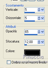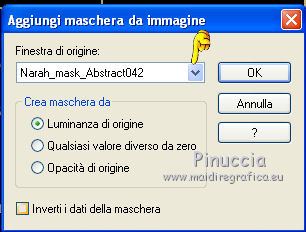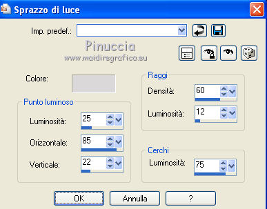 Apri la maschera in PSP e minimizzala con il resto del materiale. 1. Apri una nuova immagine trasparente 700 x 500 pixels. 2. Apri l'immagine "shooting" e vai a Modifica>Copia. Torna al tuo lavoro e vai a Modifica>Incolla come nuovo livello. 3. Imposta il colore di primo piano con #b0c0da. Livelli>Nuovo livello raster. Riempi il livello con il colore di primo piano.4. Livelli>Nuovo livello maschera>Da immagine. Apri il menu sotto la finestra di origine e vedrai la lista dei files aperti. Tra questi la maschera. Seleziona la maschera Narah_mask_abstract042, con i seguenti settaggi: ![]() Livelli>Elimina e rispondi sì alla domanda unire la maschera nel livello corrente. ![]() Livelli>Unisci>Unisci gruppo. Cambia la modalità di miscelatura di questo livello in Sovrapponi. 5. Apri il tube voile_Mariel e vai a Modifica>Copia. Torna al tuo lavoro e vai a Modifica>Incolla come nuovo livello. Spostalo un po' più in basso.Cambia la modalità di miscelatura di questo livello in Sovrapponi. 6. Apri il tube LD_Bulles e vai a Modifica>Copia. Torna al tuo lavoro e vai a Modifica>Incolla come nuovo livello. Spostalo in alto contro il bordo.Cambia la modalità di miscelatura di questo livello in Luce netta. 7. Apri il tube LD_Spotlight e vai a Modifica>Copia. Torna al tuo lavoro e vai a Modifica>Incolla come nuovo livello. Sposta il tube nell'angolo in alto a destra.![]() 8. Livelli>Unisci>Unisci visibile. 9. Effetti>Effetti di illuminazione>Sprazzo di luce, con il colore #DAD8D9. ![]() 10. Apri il tube Anny_Cullinan e vai a Modifica>Copia. Torna al tuo lavoro e vai a Modifica>Incolla come nuovo livello. Spostalo nell'angolo in basso a sinistra.Effetti>Effetti 3D>Sfalsa ombra, con il colore nero. ![]() 11. Livelli>Unisci>Unisci tutto (appiattisci). 12. Immagine>Aggiungi bordatura, 1 pixel, simmetriche, con il colore #CBD4E3. Immagine>Aggiungi bordatura, 15 pixels, simmetriche, con il colore #192C52. Seleziona questo bordo con la bacchetta magica ![]() 13. Effetti>Plugins>Graphics Plus - Cross shadow, con i settaggi standard. ![]() Selezione>Deseleziona. 14. Immagine>Aggiungi bordatura, 1 pixel, simmetriche, con il colore #CBD4E3. Firma il tuo lavoro e salva in formato jpg. Se hai problemi o dubbi, o trovi un link non funzionante, o anche soltanto per un saluto, scrivimi. 27 Giugno 2011 |