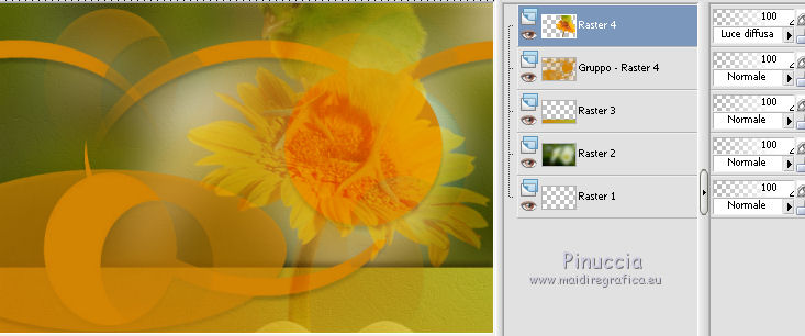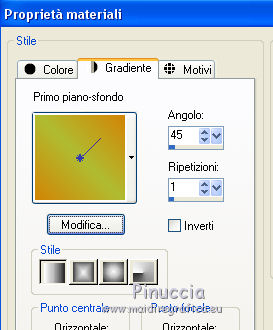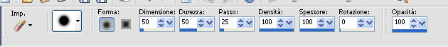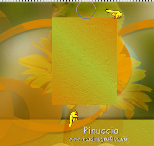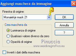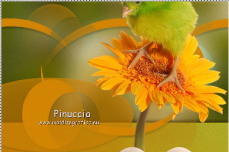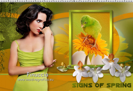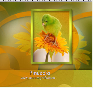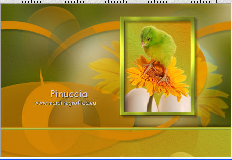 Apri la maschera in PSP e minimizzala con il resto del materiale. 1. Apri una nuova immagine trasparente 750 x 500 pixels. 2. Apri l'immagine fleur-blanche-de-printemps, e vai a Modifica>Copia. Torna al tuo lavoro e vai a Modifica>Incolla come nuovo livello. 3. Regola>Sfocatura>Sfocatura gaussiana - raggio 35. ![]() 4. Effetti>Effetti di trama>Nappa - con il colore standard dell'effetto #c0c0c0 ![]() 5. Apri il tube deco1_sdp e vai a Modifica>Copia. Torna al tuo lavoro e vai a Modifica>Incolla come nuovo livello. Spostalo sul bordo inferiore.6. Effetti>Effetti 3D>Sfalsa ombra, colore nero. ![]() 7. Imposta il colore di primo piano con #d28406. Livelli>Nuovo livello raster. Riempi con il colore di primo piano.8. Livelli>Nuovo livello maschera>Da immagine. Apri il menu sotto la finestra di origine e vedrai la lista dei files aperti. Seleziona la maschera Monaiekje mask 21, con i seguenti settaggi. ![]() Livelli>Elimina e rispondi sì alla domanda Unire la maschera nel livello corrente. ![]() Livelli>Unisci>Unisci gruppo. 9. Effetti>Effetti 3D>Sfalsa ombra, colore nero. ![]() 10. Apri il tube MR_Green Bird on Yellow Flower e vai a Modifica>Copia. Torna al tuo lavoro e vai a Modifica>Incolla come nuovo livello. Posiziona il tube come nell'esempio.![]() Cambia la modalità di miscelatura di questo livello in Luce diffusa. ![]() 12. Apri una nuova immagine trasparente 222 x 300 pixels. Colore di primo piano #d28406. Imposta il colore di sfondo con #b0bc31. Passa il colore di primo piano a Gradiente di primo piano/sfondo, stile Lineare. ![]() Riempi l'immagine con il gradiente.13. Effetti>Effetti di trama>Nappa, come al punto 4. ![]() Modifica>Copia. Torna al tuo lavoro e vai a Modifica>Incolla come nuovo livello. Sposta l'immagine come nell'esempio.![]() 14. Attiva il livello del pulcino. Attiva lo strumento Gomma , con i seguenti settaggi.![]() Cancella il pulcino che deborda dal quadro e lo stelo del fiore. ![]() 15. Attiva nuovamente il livello superiore. 16. Apri il tube deco2_sdp, e vai a Modifica>Copia. Torna al tuo lavoro e vai a Modifica>Incolla come nuovo livello. Sposta la cornice sul quadro.![]() 17. Apri il tube MR_Green Bird on Yellow Flower modifier, e vai a Modifica>Copia. Torna al tuo lavoro e vai a Modifica>Incolla come nuovo livello. Sposta il tube al centro del quadro.Livelli>Disponi>Sposta giù. Cancella eventuali tracce del tube che debordano dalla cornice.![]() 18. Attiva nuovamente il livello superiore. Apri il tube barre_sdp, e vai a Modifica>Copia. Torna al tuo lavoro e vai a Modifica>Incolla come nuovo livello. Spostalo sul bordo in basso.![]() 19. Apri il tube deco3_sdp_auteur_inconnu, e vai a Modifica>Copia. Torna al tuo lavoro e vai a Modifica>Incolla come nuovo livello. Spostalo nell'angolo in alto a sinistra.20. Apri il tube colacao_jennifer-connelly, e vai a Modifica>Copia. Torna al tuo lavoro e vai a Modifica>Incolla come nuovo livello. Spostalo a sinistra.21. Apri il tube text_sdp, e vai a Modifica>Copia. Torna al tuo lavoro e vai a Modifica>Incolla come nuovo livello. Spostalo in basso a destra.22. Apri il tube MD~orchid0817, e vai a Modifica>Copia. Torna al tuo lavoro e vai a Modifica>Incolla come nuovo livello. Sposta il tube sotto il quadro con il pulcino.![]() 23. Effetti>Effetti 3D>Sfalsa ombra, colore nero. ![]() 24. Livelli>Unisci>Unisci tutto. 25. Immagine>Aggiungi bordatura, 2 pixels, simmetriche, colore #ede9e4. Immagine>Aggiungi bordatura, 25 pixels, simmetriche, colore #b0bc31. 26. Attiva lo strumento Bacchetta magica , sfumatura e tolleranza 0,e clicca nel bordo da 25 pixels per selezionarlo. 27. Effetti>Plugins>Graphics Plus - Cross Shadow. ![]() Selezione>Deseleziona. 28. Immagine>Aggiungi bordatura, 2 pixels, simmetriche, con il colore #ede9e4. 29. Firma il tuo lavoro e salva in formato jpg. ![]() Se hai problemi o dubbi, o trovi un link non funzionante, o anche soltanto per un saluto, scrivimi. 16 Aprile 2014 |