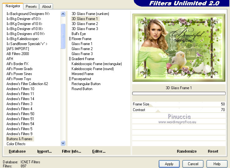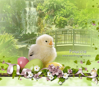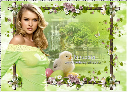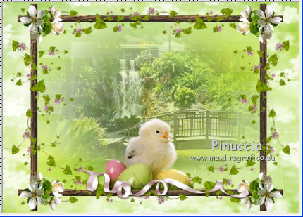 1. Apri l'immagine "emka_mini_spring_paper02". Duplicala usando la combinazione di tasti maiuscola+D e chiudi l'originale. La copia sarà la base del tuo lavoro. 2. Apri il tube "frame_wood_LD" e vai a Modifica>Copia. Torna al tuo lavoro e vai a Modifica>Incolla come nuovo livello. 3. Apri il tube "printemps_betty1953" e vai a Modifica>Copia. Torna al tuo lavoro e vai a Modifica>Incolla come nuovo livello. Abbassa l'opacità di questo livello al 60%. 4. Apri il tube "Element40" e vai a Modifica>Copia. Torna al tuo lavoro e vai a Modifica>Incolla come nuovo livello. 5. Apri il tube "WS_Springblossom" e vai a Modifica>Copia. Torna al tuo lavoro e vai a Modifica>Incolla come nuovo livello. Spostalo nell'angolo in alto a sinistra della cornice di legno.![]() 6. Effetti>Plugins>Simple - Top Left Mirror. 7. Apri il tube "EasterChick" e vai a Modifica>Copia. Torna al tuo lavoro e vai a Modifica>Incolla come nuovo livello. Spostalo in basso al centro.8. Apri il tube "Element31" e vai a Modifica>Copia. Torna al tuo lavoro e vai a Modifica>Incolla come nuovo livello. Spostalo in basso a destra.![]() 9. Effetti>Effetti 3D>Sfalsa ombra, con il colore nero. ![]() 10. Apri il tube "Element42" e vai a Modifica>Copia. Torna al tuo lavoro e vai a Modifica>Incolla come nuovo livello. Immagine>Capovolgi. Spostalo in basso, sulla cornice.![]() 11. Livelli>Duplica, e spostalo sulla cornice in alto.![]() 12. Apri il tube "Element36" e vai a Modifica>Copia. Torna al tuo lavoro e vai a Modifica>Incolla come nuovo livello. Spostalo a destra.13. Apri il tube "480-VBM_FEMME_VERTE_020709" e vai a Modifica>Copia. Torna al tuo lavoro e vai a Modifica>Incolla come nuovo livello. Spostalo a sinistra.![]() 14. Apri il tube "Element37" e vai a Modifica>Copia. Torna al tuo lavoro e vai a Modifica>Incolla come nuovo livello. Spostalo in basso a destra.15. Effetti>Effetti 3D>Sfalsa ombra, con il colore nero. ![]() 16. Apri il tube "wordart_LD" e vai a Modifica>Copia. Torna al tuo lavoro e vai a Modifica>Incolla come nuovo livello. Spostalo in alto.17. Livelli>Unisci>Unisci tutto (appiattisci). 18. Immagine>Aggiungi bordatura, 2 pixels, simmetriche, con il colore #edf7d5. Immagine>Aggiungi bordatura, 25 pixels, simmetriche, con il colore #bcde89. Seleziona questo bordo con la bacchetta magica ![]() 19. Effetti>Plugins>Simple - Quick Tile. 20. Regola>Sfocatura>Sfocatura gaussiana - raggio 40. ![]() 21. Effetti>Plugins>Filters Unlimited - Buttons and Frames - 3D Glass Frame 1. ![]() Selezione>Deseleziona. 22. Firma il tuo lavoro e salva in formato jpg. Se hai problemi o dubbi, o trovi un link non funzionante, o anche soltanto per un saluto, scrivimi. 14 Marzo 2012 |