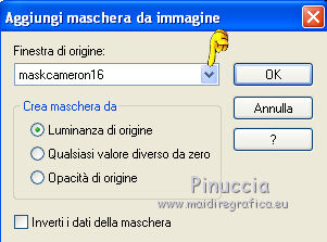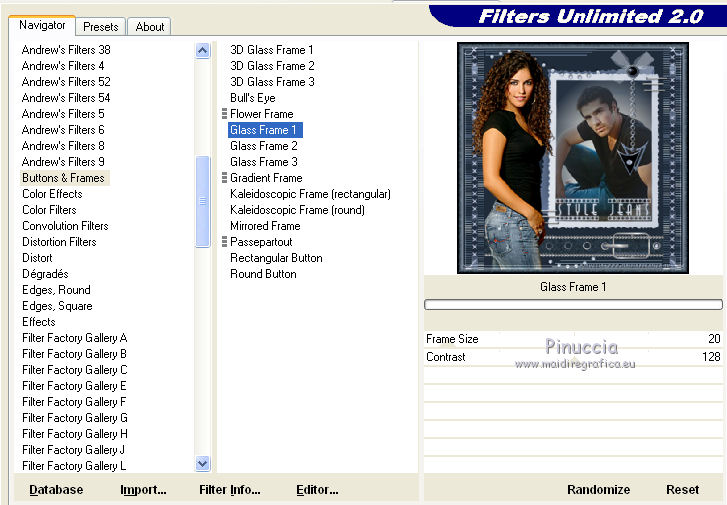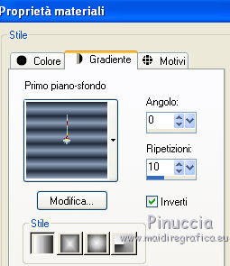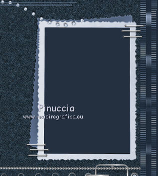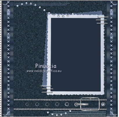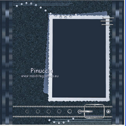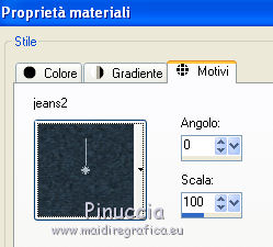 Apri la maschera in PSP e minimizzala con il resto del materiale. 1. Imposta il colore di primo piano con #1f2b39. Apri una nuova immagine trasparente 500 x 500 pixels, e riempila con il colore di primo piano.2. Passa il colore di primo piano a Motivi e seleziona il motivo jeans2. ![]() Apri una nuova immagine trasparente 400 x 500 pixels, e riempila con il motivo jeans2.3. Modifica>Copia. Torna alla prima immagine (500 x 500) e vai a Modifica>Incolla come nuovo livello. 4. Imposta il colore di sfondo con #8fa0bb. Il colore di primo piano è già correttamente impostato con #1f2b39. Passa il colore di primo piano a Gradiente Lineare, con i seguenti settaggi. ![]() 5. Livelli>Nuovo livello raster. Riempi il nuovo livello con il gradiente.6. Livelli>Nuovo livello maschera>Da immagine. Apri il menu sotto la finestra di origine e vedrai la lista dei files aperti. Tra questi la maschera. Seleziona la maschera maskcameron16, con i seguenti settaggi: ![]() Livelli>Elimina e rispondi sì alla domanda unire la maschera nel livello corrente. ![]() Effetti>Effetti di bordo>Aumenta. Livelli>Unisci>Unisci gruppo. 7. Livelli>Unisci>Unisci visibile. 8. Apri il tube cadre e vai a Modifica>Copia. Torna al tuo lavoro e vai a Modifica>Incolla come nuovo livello. Spostalo un po' più a destra - vedi il risultato finale.9. Apri il tube deco1 e vai a Modifica>Copia. Torna al tuo lavoro e vai a Modifica>Incolla come nuovo livello. Spostalo in basso a destra.10. Livelli>Duplica. Immagine>Capovolgi. Sposta questo ornamento in alto a sinistra.11. Apri il tube ceinture, e vai a Modifica>Copia. Torna al tuo lavoro e vai a Modifica>Incolla come nuovo livello. Spostalo in basso, al centro del secondo quadro in jeans.![]() 12. Apri il tube broches e vai a Modifica>Copia. Torna al tuo lavoro e vai a Modifica>Incolla come nuovo livello. Spostalo sulla cornice in basso a sinistra.13. Livelli>Duplica. Immagine>Capovolgi. Sposta questo duplicato sulla cornice in alto a destra.![]() 14. Apri il tube deco2 e vai a Modifica>Copia. Torna al tuo lavoro e vai a Modifica>Incolla come nuovo livello. Spostalo a sinistra.15. Livelli>Duplica. Immagine>Rifletti. Se necessario, posizionalo correttamente al centro delle strisce.![]() 16. Apri il tube femme_jeans e vai a Modifica>Copia. Torna al tuo lavoro e vai a Modifica>Incolla come nuovo livello. Spostalo a sinistra.17. Apri il tube homme_jeans e vai a Modifica>Copia. Torna al tuo lavoro e vai a Modifica>Incolla come nuovo livello. Spostalo al centro della cornice.18. Apri il tube deco3 e vai a Modifica>Copia. Torna al tuo lavoro e vai a Modifica>Incolla come nuovo livello. Spostalo sulla cornice, a destra.![]() 19. Apri il tube texte_style_jeans e vai a Modifica>Copia. Torna al tuo lavoro e vai a Modifica>Incolla come nuovo livello. Spostalo in basso nella cornice.20. Livelli>Unisci>Unisci tutto (appiattisci). 21. Immagine>Aggiungi bordatura, 10 pixels, simmetriche, con un colore qualsiasi, purchè non presente nell'immagine. Seleziona questo bordo con la bacchetta magica , sfumatura e tolleranza 0,e riempilo con il motivo jeans2.Mantieni selezionato. 22. Effetti>Plugins>Filters Unlimited - Buttons and Frames - Glass Frame 1. ![]() Selezione>Deseleziona. Firma il tuo lavoro e salva in formato jpg. Se hai problemi o dubbi, o trovi un link non funzionante, o anche soltanto per un saluto, scrivimi. 29 Giugno 2011 |