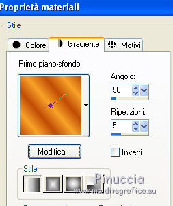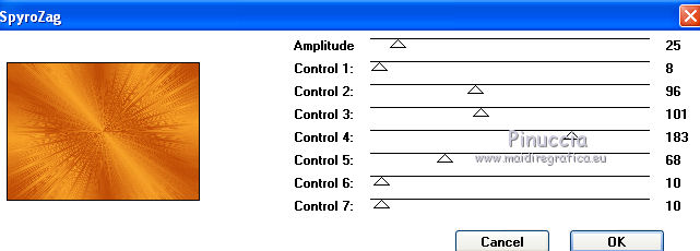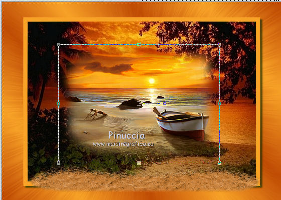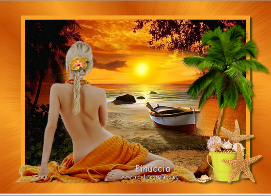 Apri tutto il materiale in PSP. 1. Imposta il colore di primo piano con #C04C06, e il colore di sfondo con #F8A228. Passa il colore di primo piano a Gradiente, stile Lineare. ![]() 2. Apri una nuova immagine trasparente 700 x 500 pixels, e riempila con il gradiente.3. Effetti>Plugins>Funhouse - Spyrozag. ![]() 4. Apri l'immagine sunset_beach e vai a Modifica>Copia. Torna al tuo lavoro e vai a Modifica>Incolla come nuovo livello. 5. Selezione>Seleziona tutto. Selezione>Mobile. Selezione>Immobilizza. Selezione>Modifica>Seleziona bordature selezione. ![]() 6. Livelli>Nuovo livello raster. Riempi la selezione con il colore di sfondo #F8A228.Selezione>Deseleziona. Livelli>Unisci>Unisci giù. 7. Effetti>Effetti 3D>Sfalsa ombra, con il colore nero. ![]() 8. Apri il tube sable e vai a Modifica>Copia. Torna al tuo lavoro e vai a Modifica>Incolla come nuovo livello. Spostalo in basso.9. Apri il tube Sunset Beach_Misted by JuztPlayin2_Kathy e vai a Modifica>Copia. Torna al tuo lavoro e vai a Modifica>Incolla come nuovo livello. Posiziona il tube come nell'esempio.![]() 10. Apri il tube Element13 e vai a Modifica>Copia. Torna al tuo lavoro e vai a Modifica>Incolla come nuovo livello. Spostalo a destra.11. Effetti>Effetti 3D>Sfalsa ombra, con il colore nero. ![]() 12. Apri il tube tubeclaudiaviza-mujer735 e vai a Modifica>Copia. Torna al tuo lavoro e vai a Modifica>Incolla come nuovo livello. Spostalo a sinistra.13. Apri il tube sceau_plage e vai a Modifica>Copia. Torna al tuo lavoro e vai a Modifica>Incolla come nuovo livello. Spostalo in basso a destra.14. Effetti>Effetti 3D>Sfalsa ombra, con il colore nero. ![]() 15. Apri il tube Element34 e vai a Modifica>Copia. Torna al tuo lavoro e vai a Modifica>Incolla come nuovo livello. Spostalo sopra il sole esistente.![]() 16. Apri il tube Element6 e vai a Modifica>Copia. Torna al tuo lavoro e vai a Modifica>Incolla come nuovo livello. Spostalo al centro.17. Effetti>Effetti 3D>Sfalsa ombra, con il colore nero. ![]() 18. Livelli>Unisci>Unisci tutto (appiattisci). 19. Immagine>Aggiungi bordatura, 10 pixels, simmetriche, con il colore #F8A228. Firma il tuo lavoro e salva in formato jpg. Se hai problemi o dubbi, o trovi un link non funzionante, o anche soltanto per un saluto, scrivimi. 23 Giugno 2012 |