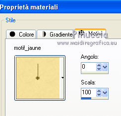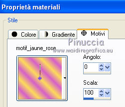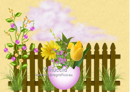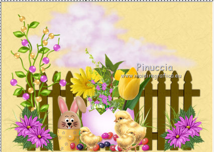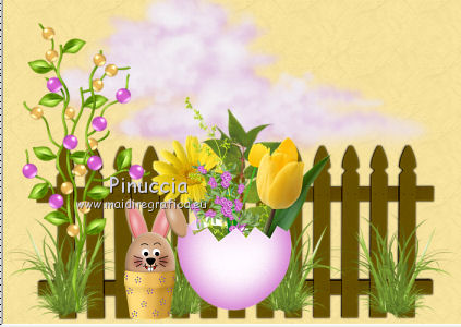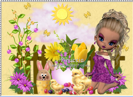 Apri tutto il materiale in PSP, compresi i motivi che ritroverai nella lista dei motivi disponibili quando ti serviranno. 1. Apri una nuova immagine trasparente 700 x 500 pixels. Passa il colore di primo piano a Motivi e seleziona il motivo "motif jaune". ![]() Riempi l'immagine trasparente con questo motivo.2. Apri il tube pinksinglecloud_bylnc e vai a Modifica>Copia. Torna al tuo lavoro e vai a Modifica>Incolla come nuovo livello. Spostalo in alto al centro, contro il bordo.3. Apri il tube sax_zaun e vai a Modifica>Copia. Torna al tuo lavoro e vai a Modifica>Incolla come nuovo livello. Spostalo in basso al centro.4. Apri il tube sax_Tall Grass-3 e vai a Modifica>Copia. Torna al tuo lavoro e vai a Modifica>Incolla come nuovo livello. Spostalo in basso.5. Apri il tube sax_blumenei e vai a Modifica>Copia. Torna al tuo lavoro e vai a Modifica>Incolla come nuovo livello. Spostalo in basso al centro.6. Apri il tube FM-Sweet-Easter-Element-70 e vai a Modifica>Copia. Torna al tuo lavoro e vai a Modifica>Incolla come nuovo livello. Spostalo in basso a sinistra.![]() 7. Apri il tube FM-Sweet-Easter-Element-11 e vai a Modifica>Copia. Torna al tuo lavoro e vai a Modifica>Incolla come nuovo livello. Spostalo accanto all'uovo.![]() 8. Apri il tube FM-Sweet-Easter-Element-5 e vai a Modifica>Copia. Torna al tuo lavoro e vai a Modifica>Incolla come nuovo livello. Spostalo in basso.9. Apri il tube sm_easterbeauty1_5 e vai a Modifica>Copia. Torna al tuo lavoro e vai a Modifica>Incolla come nuovo livello. Spostalo in basso a destra.10. Apri il tube sax_eier e vai a Modifica>Copia. Torna al tuo lavoro e vai a Modifica>Incolla come nuovo livello. Spostalo in basso al centro.11. Apri il tube LD_poussins e vai a Modifica>Copia. Torna al tuo lavoro e vai a Modifica>Incolla come nuovo livello. Sposta i pulcini davanti all'uovo.![]() 12. Apri il tube Easter Eggs Hunt_Butterfly_Scrap and Tubes e vai a Modifica>Copia. Torna al tuo lavoro e vai a Modifica>Incolla come nuovo livello. Sposta le farfalle in alto a destra.13. Apri il tube Easter Eggs Hunt_Sun_Scrap and Tubes e vai a Modifica>Copia. Torna al tuo lavoro e vai a Modifica>Incolla come nuovo livello. Spostalo in alto.14. Apri il tube sm_easterbeauty1_5 e vai a Modifica>Copia. Torna al tuo lavoro e vai a Modifica>Incolla come nuovo livello. Sposta il tube a destra.Nella paletta dei livelli porta questo livello sotto il livello delle piccole uova. ![]() 15. Livelli>Unisci>Unisci tutto (appiattisci). 16. Immagine>Aggiungi bordatura, 2 pixels, simmetriche, con il colore #D861CE. Immagine>Aggiungi bordatura, 7 pixels, simmetriche, con il colore #FFDE5A. Immagine>Aggiungi bordatura, 2 pixels, simmetriche, con il colore #D861CE. Immagine>Aggiungi bordatura, 20 pixels, simmetriche, con il colore #FFDE5A. Seleziona questo bordo con la bacchetta magica ![]() Cambia il motivo di primo piano con motif_jaune_rose. ![]() Riempi la selezione con questo motivo.17. Immagine>Aggiungi bordatura, 2 pixels, simmetriche, con il colore #D861CE. Firma il tuo lavoro e salva in formato jpg. Se hai problemi o dubbi, o trovi un link non funzionante, o anche soltanto per un saluto, scrivimi.