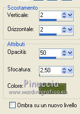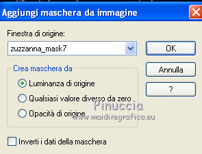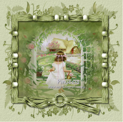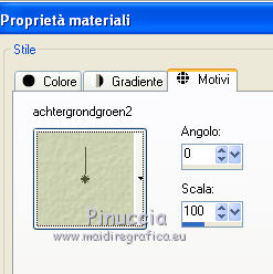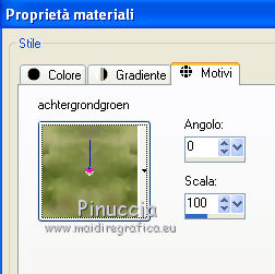 Apri la maschera in PSP e minimizzala con il resto del materiale. 1. Apri una nuova immagine trasparente 500 x 500 pixels. 2. Passa il colore di primo piano a Motivi, apri il menu e nella lista vedrai anche tutti i files aperti. Seleziona il motivo "achtergrond" con i seguenti settaggi. ![]() Riempi l'immagine trasparente con questo motivo.3. Livelli>Nuovo livello raster. Cambia il motivo di primo piano e imposta "achtergrond2" con gli stessi settaggi. ![]() Riempi il nuovo livello con questo motivo.4. Livelli>Nuovo livello maschera>Da immagine. Apri il menu sotto la finestra di origine e vedrai la lista dei files aperti. Tra questi la maschera. Seleziona la maschera zuzzanna_mask7, con i seguenti settaggi: ![]() Livelli>Elimina e rispondi sì alla domanda unire la maschera nel livello corrente. ![]() Livelli>Unisci>Unisci gruppo. 5. Effetti>Effetti 3D>Sfalsa ombra, con il colore #576623. ![]() 6. Apri il tube nai_kinder013 e vai a Modifica>Copia. Torna al tuo lavoro e vai a Modifica>Incolla come nuovo livello. 7. Apri il tube "frame_spring" e vai a Modifica>Copia. Torna al tuo lavoro e vai a Modifica>Incolla come nuovo livello. Posiziona la cornice,in modo che l'immagine si trovi correttamente al centro. ![]() 8. Apri il tube "deco_spring1" e vai a Modifica>Copia. Torna al tuo lavoro e vai a Modifica>Incolla come nuovo livello. Spostalo in alto a sinistra.9. Apri il tube "flower_spring" e vai a Modifica>Copia. Torna al tuo lavoro e vai a Modifica>Incolla come nuovo livello. Spostalo nell'angolo in basso a destra.10. Apri il tube bow_spring e vai a Modifica>Copia. Torna al tuo lavoro e vai a Modifica>Incolla come nuovo livello. Spostalo nell'angolo in alto a destra.11. Apri il tube papillon_spring e vai a Modifica>Copia. Torna al tuo lavoro e vai a Modifica>Incolla come nuovo livello. Spostalo in basso a sinistra.12. Apri il tube texte_printemps e vai a Modifica>Copia. Torna al tuo lavoro e vai a Modifica>Incolla come nuovo livello. Spostalo dove preferisci.13. Livelli>Unisci>Unisci tutto (appiattisci). 14. Selezione>Seleziona tutto. Selezione>Modifica>Contrai - 5 pixels. Selezione>Inverti. 15. Imposta il colore di primo piano con #e8ebd9, e riempi il bordo con questo colore.16. Effetti>Effetti 3D>Smusso a incasso. ![]() Selezione>Deseleziona. 17. Immagine>Aggiungi bordatura, 2 pixels, simmetriche, con il colore #576623. Firma il tuo lavoro e salva in formato jpg. Se hai problemi o dubbi, o trovi un link non funzionante, o anche soltanto per un saluto, scrivimi. 31 Luglio 2011 |