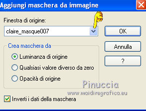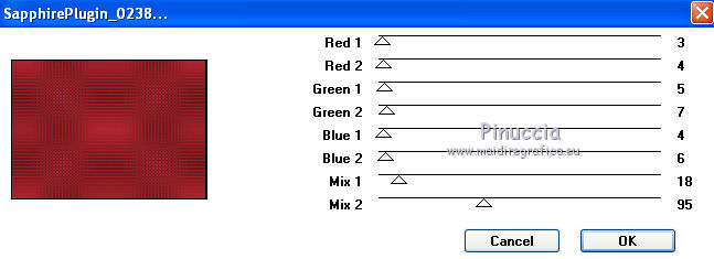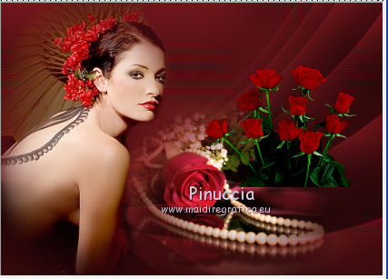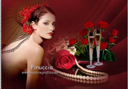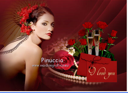 Apri la maschera in PSP e minimizzala con il resto del materiale. 1. Apri una nuova immagine trasparente 700 x 500 pixels. 2.Imposta il colore di primo piano con #501619, e il colore di sfondo con #c72934. 3. Passa il colore di primo piano a Gradiente lineare. ![]() Riempi l'immagine trasparente con il gradiente.4. Regola>Sfocatura>Sfocatura gaussiana - raggio 15. ![]() 5. Livelli>Duplica. Immagine>Rifletti. Abbassa l'opacitā di questo livello al 50%. 6. Livelli>Unisci>Unisci visibile. 7. Effetti>Plugins>Sapphire Filter 03 - sapphire Plugin0238. ![]() 8. Livelli>Nuovo livello raster. Riempi con il colore nero.9. Livelli>Nuovo livello maschera>Da immagine. Apri il menu sotto la finestra di origine e vedrai la lista dei files aperti. Seleziona la maschera claire_masque007 con i seguenti settaggi: ![]() Livelli>Elimina e rispondi sė alla domanda Unire la maschera nel livello corrente. ![]() Livelli>Unisci>Unisci gruppo. 10. Effetti>Effetti 3D>Sfalsa ombra, con il colore nero. ![]() 11. Apri il tube carolaine_women e vai a Modifica>Copia. Torna al tuo lavoro e vai a Modifica>Incolla come nuovo livello. Spostalo a sinistra.12. Apri il tube JLrosepearl e vai a Modifica>Copia. Torna al tuo lavoro e vai a Modifica>Incolla come nuovo livello. Spostalo a destra accanto alla donna.![]() 13. Apri il tube ldd-redroses e vai a Modifica>Copia. Torna al tuo lavoro e vai a Modifica>Incolla come nuovo livello. Spostalo accanto al tube precedente.![]() 14. Apri il tube JLchampagneflutes e vai a Modifica>Copia. Torna al tuo lavoro e vai a Modifica>Incolla come nuovo livello. Sposta i bicchieri davanti alle rose.![]() 15. Apri il tube briefpapier1401 e vai a Modifica>Copia. Torna al tuo lavoro e vai a Modifica>Incolla come nuovo livello. Spostalo davanti ai bicchieri.![]() 16. Apri il tube dentelle_rouge_ŠLea e vai a Modifica>Copia. Torna al tuo lavoro e vai a Modifica>Incolla come nuovo livello. 17. Apri texte_time_to_loveŠLea e vai a Modifica>Copia. Torna al tuo lavoro e vai a Modifica>Incolla come nuovo livello. Spostalo in alto sopra le rose.18. Livelli>Unisci>Unisci tutto (appiattisci). 19. Immagine>Aggiungi bordatura, 2 pixels, simmetriche, con il colore scuro. Immagine>Aggiungi bordatura. 2 pixels, simmetriche, con il colore chiaro. Immagine>Aggiungi bordatura, 2 pixels, simmetriche, con il colore scuro. 20. Firma il tuo lavoro e salva in formato jpg. Se hai problemi o dubbi, o trovi un link non funzionante, o anche soltanto per un saluto, scrivimi.