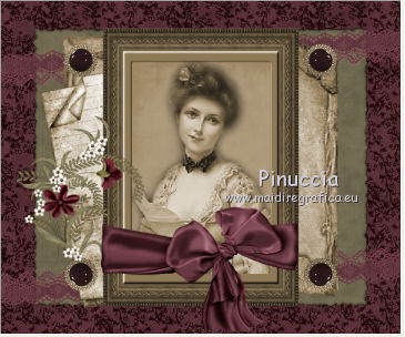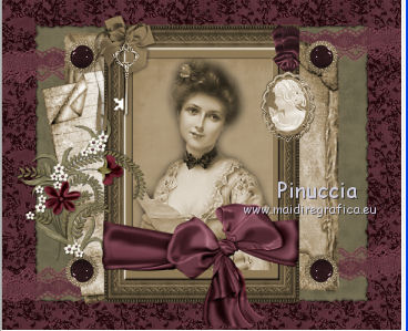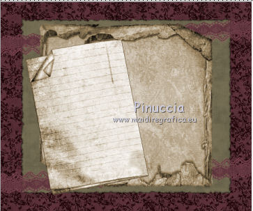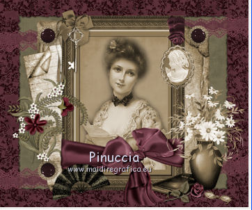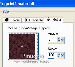 Apri tutto il materiale in PSP. 1. Apri una nuova immagine trasparente 600 x 500 pixels. 2. Passa il colore di primo piano a Motivi. Apri il menu e, nella lista dei motivi disponibili, vedrai tutti i files aperti in PSP. Seleziona Yvette_KindaVintage_Paper5 con i seguenti settaggi. ![]() 3. Riempi l'immagine trasparente con questo motivo.4. Apri il tube frame_vintage3 e vai a Modifica>Copia. Torna al tuo lavoro e vai a Modifica>Incolla come nuovo livello. 5. Apri il tube dentelle_vintage e vai a Modifica>Copia. Torna al tuo lavoro e vai a Modifica>Incolla come nuovo livello. 6. Spostalo un po' più in alto.![]() 7. Livelli>Duplica. Immagine>Rifletti. Immagine>Capovolgi. 8. Apri il tube Yvette_KindaVintage_Book2 e vai a Modifica>Copia. Torna al tuo lavoro e vai a Modifica>Incolla come nuovo livello. 9. Apri il tube Yvelle_KindaVintage_Book e vai a Modifica>Copia. Torna al tuo lavoro e vai a Modifica>Incolla come nuovo livello. 10. Spostalo a sinistra, come nell'esempio.![]() 11. Apri il tube frame_vintage e vai a Modifica>Copia. Torna al tuo lavoro e vai a Modifica>Incolla come nuovo livello. 12. Apri il tube femme_vintage e vai a Modifica>Copia. Torna al tuo lavoro e vai a Modifica>Incolla come nuovo livello. 13. Apri il tube Yvette_KindaVintage_Wrap2 e vai a Modifica>Copia. Torna al tuo lavoro e vai a Modifica>Incolla come nuovo livello. 14. Spostalo in basso come nell'esempio.![]() 15. Apri il tube bouton_vintage_lea e vai a Modifica>Copia. Torna al tuo lavoro e vai a Modifica>Incolla come nuovo livello. 16. Spostalo in alto a sinistra, come nell'esempio.![]() 17. Effetti>Plugins>Simple - Top Left mirror. 18. Apri il tube Yvette_KindaVintage_Flower 2 e vai a Modifica>Copia. Torna al tuo lavoro e vai a Modifica>Incolla come nuovo livello. 19. Spostalo a sinistra, come nell'esempio.![]() 20. Effetti>Effetti 3D>Sfalsa ombra, con il colore nero. ![]() 21. Apri il tube Cle_vintage_lea e vai a Modifica>Copia. Torna al tuo lavoro e vai a Modifica>Incolla come nuovo livello. 22. Spostalo a sinistra della cornice.![]() 23. Apri il tube camey_vintage_lea e vai a Modifica>Copia. Torna al tuo lavoro e vai a Modifica>Incolla come nuovo livello. 24. Spostalo a destra della cornice.![]() 25. Apri il tube Yvette_KindaVintage_Fan2 e vai a Modifica>Copia. Torna al tuo lavoro e vai a Modifica>Incolla come nuovo livello. 26. Spostalo in basso, come nell'esempio.![]() 27. Apri il tube deco_floral_vintage e vai a Modifica>Copia. Torna al tuo lavoro e vai a Modifica>Incolla come nuovo livello. 28. Spostalo in basso a destra.![]() 29. Effetti>Effetti 3D>Sfalsa ombra, con i settaggi precedenti. ![]() 30. Livelli>Unisci>Unisci tutto (appiattisci). 31. Immagine>Aggiungi bordatura, 10 pixels, simmetriche, con un colore qualsiasi. Seleziona questo bordo con la bacchetta magica , sfumatura e tolleranza 0.32. Apri il tube frame_vintage2 e vai a Modifica>Copia. Torna al tuo lavoro e vai a Modifica>Incolla nella selezione. 33. Effetti>Effetti 3D>Smusso a incasso. ![]() 34. Selezione>Deseleziona. 35. Aggiungi il tuo nome e/o il tuo watermark su un nuovo livello. 36. Livelli>Unisci>Unisci tutto e salva in formato jpg. Se hai problemi o dubbi, o trovi un link non funzionante, o anche soltanto per un saluto, scrivimi.