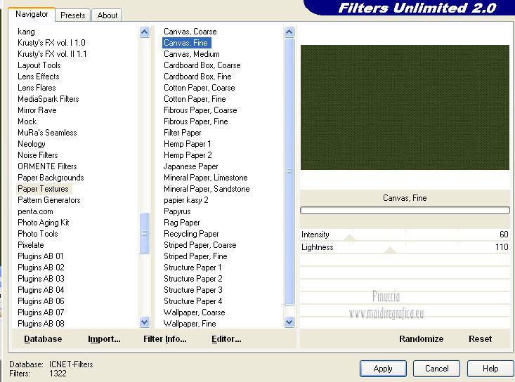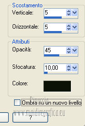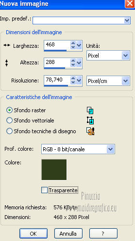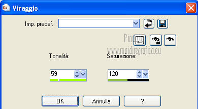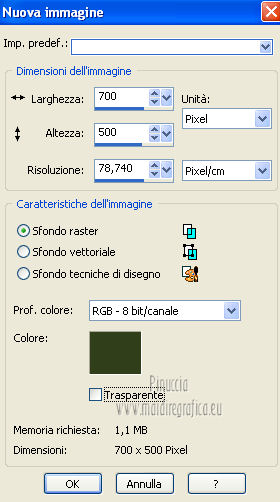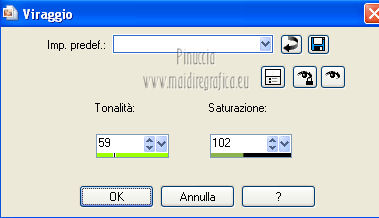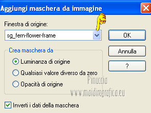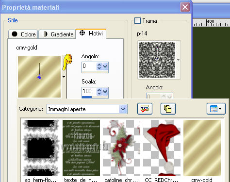 Apri la maschera in PSP e minimizzala con il resto del materiale. 1. Apri una nuova immagine 700 x 500 colore di sfondo #313f1b. ![]() 2. Livelli>Nuovo livello raster. Passa il colore di primo piano a Motivi, apri il menu e seleziona - nella categoria Immagini aperte - il motivo cmv-gold. ![]() Riempi il livello con il motivo oro.3. Livelli>Nuovo livello maschera>Da immagine. Apri il menu sotto la finestra di origine e vedrai la lista dei files aperti. Seleziona la maschera sg_fern-flower-frame. ![]() Livelli>Elimina, e rispondi sì alla domanda Unire la maschera nel livello corrente. ![]() Livelli>Unisci>Unisci gruppo. 4. Regola>Tonalità e saturazione>Viraggio. ![]() 5. Effetti>Effetti 3D>Sfalsa ombra, con il colore #0f1309. ![]() 6. Effetti>Effetti di bordo>Aumenta - 2 volte. 7. Apri il tube frame_dentelle e vai a Modifica>Copia. Torna al tuo lavoro e vai a Modifica>Incolla come nuovo livello. Effetti>Effetti di bordo>Aumenta - 2 volte. 8. Effetti>Effetti 3D>Sfalsa ombra, con i settaggi precedenti. ![]() Primo quadro 9. Apri una nuova immagine 530 x 3501 pixels, colore #313f1b. ![]() 10. Imposta il colore di primo piano con #9eaf78, e il colore di sfondo con #313f1b. Selezione>Seleziona tutto. Selezione>Modifica>Contrai - 2 pixels. Riempi con il colore di primo piano #9eaf78.Selezione>Modifica>Contrai - 30 pixels. Riempi con il colore di sfondo #313f1b4.Selezione>Modifica>Contrai - 2 pixels. Premi sulla tastiera il tasto CANC. Selezione>Inverti. 11. Effetti>Effetti 3D>Smusso a incasso. ![]() Selezione>Deseleziona. 12. Modifica>Copia. Torna al tuo lavoro di partenza e vai a Modifica>Incolla come nuovo livello. 13. Effetti>Effetti 3D>Sfalsa ombra, con il colore #0f1309. ![]() Secondo quadro 14. Apri una nuova immagine 468 x 288 - colore #313f1b. ![]() 15. Imposta il colore di primo piano con il colore bianco. Selezione>Seleziona tutto. Selezione>Modifica>Contrai - 2 pixels. Riempi con il colore di bianco di primo piano.Selezione>Modifica>Contrai - 2 pixels. Riempi con il colore di sfondo #313f1b.Selezione>Modifica>Contrai - 2 pixels. 16. Effetti>Plugins>Filters Unlimited 2.0 - Paper Textures - Canvas,Fine. ![]() 17. Regola>Tonalità e saturazione>Viraggio. ![]() Selezione>Deseleziona. 18. Modifica>Copia. Torna al tuo lavoro di partenza e vai a Modifica>Incolla come nuovo livello. 19. Effetti>Effetti 3D>Sfalsa ombra, con il colore #0f1309. ![]() 20. Apri il tube floral_MB_34 e vai a Modifica>Copia. Torna al tuo lavoro e vai a Modifica>Incolla come nuovo livello. Spostalo a sinistra.21. Apri il tube cajoline_chgristmasflower e vai a Modifica>Copia. Torna al tuo lavoro e vai a Modifica>Incolla come nuovo livello. Sposta anche questo tube a sinistra.22. Apri il tube floral_MB_08 e vai a Modifica>Copia. Torna al tuo lavoro e vai a Modifica>Incolla come nuovo livello. Spostalo nell'angolo in basso a destra.23. Apri il tube CC_REDChrist_santahat e vai a Modifica>Copia. Torna al tuo lavoro e vai a Modifica>Incolla come nuovo livello. Spostalo nell'angolo in alto a destra.24. Effetti>Effetti 3D>Sfalsa ombra, con il colore #0f1309. ![]() 25. Apri il tube "texte_de_noel" e vai a Modifica>Copia. Torna al tuo lavoro e vai a Modifica>Incolla come nuovo livello. Spostalo al centro della cornice.26. Livelli>Unisci>Unisci tutto. Immagine>Aggiungi bordatura, 2 pixels, simmetriche, con il colore #a2b37b. Firma il tuo lavoro e salva in formato jpg. Se hai problemi o dubbi, o trovi un link non funzionante, o anche soltanto per un saluto, scrivimi. 2 Dicembre 2012 |