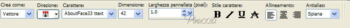 19. Attiva lo strumento testo, font AbouTFace33 ttext, dimensione 42, pennellata 1, vettore, antialias spiana, colore nero, colore di primo piano nero, colore di sfondo nullo.