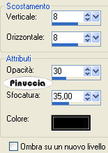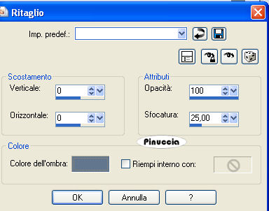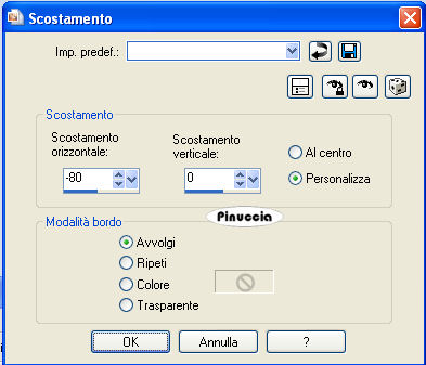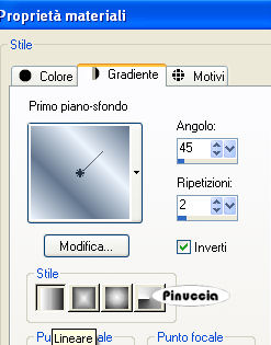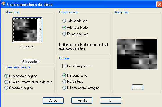 qui puoi trovare qualche risposta ai tuoi dubbi. Se l'argomento che ti interessa non è presente, ti prego di segnalarmelo. Occorrente: Materiale qui Il tube è di Jet. Filtri: Penta.com qui Metti la maschera nella cartella Maschere e apri il resto del materiale in PSP. ![]() 1. Apri una nuova immagine trasparente 400 x 500 pixels. 2. Imposta il colore di primo piano con il colore scuro #62768e, Imposta il colore di sfondo con il colore chiaro #ecf3fc. 3. Riempi l'immagine trasparente con il colore chiaro #ecf3fc.4. Livelli>nuovo livello raster. 5. Riempi con il colore scuro #62768e.6. Livelli>Carica/Salva maschera>Carica maschera da disco. Cerca e carica la maschera Susan15. ![]() 7. Livelli>Unisci>Unisci gruppo. 8. Apri il tube jet-woman8-augustus-2007 e vai a Modifica>Copia. 9. Torna al tuo lavoro e vai a Modifica>Incolla come nuovo livello. 10. Sposta il tube un po' più in basso contro il bordo.11. Effetti>Effetti 3D>Sfalsa ombra: ![]() 12. Livelli>Unisci>Unisci tutto. 13. Immagine>Aggiungi bordatura, 2 pixels, simmetriche, con il colore scuro. 14. Immagine>Aggiungi bordatura, 2 pixels, simmetriche, con il colore chiaro. 15. Immagine>Aggiungi bordatura, 2 pixels, simmetriche, con il colore scuro. 16. Selezione>Seleziona tutto. 17. Immagine>Aggiungi bordatura, 15 pixels, simmetriche, con il colore chiaro. 18. Selezione>inverti. 19. Passa il colore di primo piano a Gradiente di primo piano/sfondo, stile lineare: ![]() 20. Riempi il bordo con il gradiente.21. Effetti>Effetti di distorsione>Vento, da destra, intensità 100. ![]() 22. Ripeti l'Effetto Vento da sinistra: ![]() 23. Effetti>Effetti di bordo>Aumenta. 24. Selezione>Deseleziona. 25. Immagine>Aggiungi bordatura, 2 pixels, simmetriche, con il colore scuro. 26. Immagine>Aggiungi bordatura, 2 pixels, simmetriche, con il colore chiaro. 27. Immagine>Aggiungi bordatura, 2 pixels, simmetriche, con il colore scuro. 28. Immagine>Ridimensiona, all'80%, tutti i livelli selezionato, ricampionamento bicubica. ![]() 29. Modifica>Copia. 30. Apri una nuova immagine trasparente 700 x 500 pixels. 31. Riempi l'immagine trasparente con il colore chiaro.32. Livelli>Nuovo livello raster. 33. Riempi con il colore scuro.34. Livelli>Carica/Salva maschera>Carica maschera da disco. La maschera Susan15 è ancora presente. Devi soltanto cliccare Carica. 35. Livelli>Unisci>Unisci gruppo. 36. Modifica>Incolla come nuovo livello (hai ancora in memoria l'immagine copiata al punto 29). 37. Effetti>Effetti 3D>Sfalsa ombra: ![]() 38. Attiva il livello inferiore. 39. Apri SE_doodleART_3.psp e vai a Modifica>Copia. 40. Torna al tuo lavoro e vai a Modifica>Incolla come nuovo livello. Non spostare l'immagine. 41. Effetti>Effetti di immagine>Scostamento. ![]() 42. Effetti>Effetti 3D>Sfalsa ombra: ![]() 43. Livelli>Duplica. 44. Immagine>Rifletti. 45. Attiva il livello superiore. 46. Apri SE_doodleART_small e vai a Modifica>Copia. 47. Torna al tuo lavoro e vai a Modifica>Incolla come nuovo livello. Non spostare l'immagine. 48. Effetti>Effetti di immagine>Scostamento: ![]() 49. Livelli>Duplica. 50. Immagine>Rifletti. 51. Livelli>Unisci>Unisci tutto. 52. Immagine>Aggiungi bordatura, 2 pixels, simmetriche, con il colore scuro. 53. Immagine>Aggiungi bordatura, 2 pixels, simmetriche, con il colore chiaro. 54. Immagine>Aggiungi bordatura, 2 pixels, simmetriche, con il colore scuro. 55. Selezione>Seleziona tutto. 56. Immagine>Aggiungi bordatura, 35 pixels, simmetriche, con un colore qualsiasi. 57. Selezione>inverti. 58. Riempi con il gradiente del punto 19.![]() 59. Effetti>Plugins>Penta.com - Dot and cross: ![]() 60. Effetti>Effetti 3D>Ritaglio, con i seguenti settaggi, con il colore scuro. ![]() 61. Selezione>Inverti. 62. Effetti>Effetti 3D>SFalsa ombra: ![]() 63. Ripeti l'Effetto Sfalsa ombra, cambiando verticale e orizzontale con -8. 64. Selezione>Deseleziona. 65. Immagine>Aggiungi bordatura, 2 pixels, simmetriche, con il colore chiaro. Aggiungi il tuo nome e/o il tuo watermark e salva in formato jpg. ![]() ![]() Se hai problemi o dubbi, o trovi un link non funzionante, o anche soltanto per un saluto, scrivimi 30 Marzo 2009 |