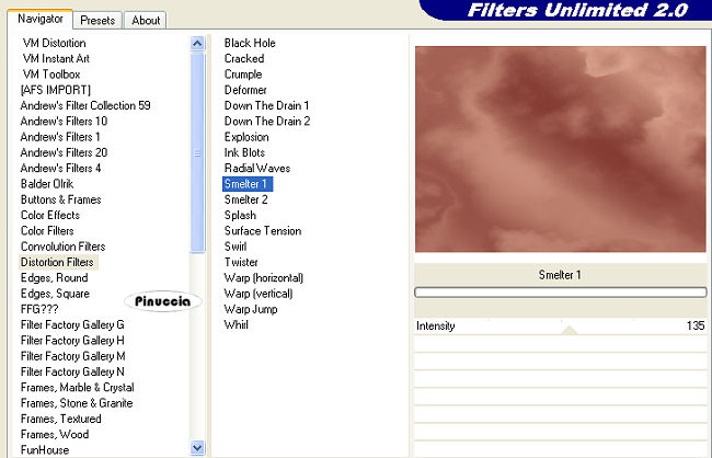 7. Effetti>Plugins>Filters Unlimited 2.0 - Distortion Filter - Smelter 1, con i settaggi standard (Intensity 135).