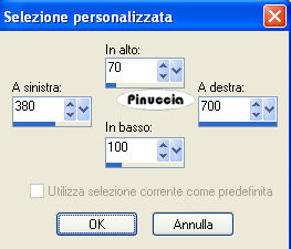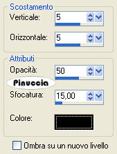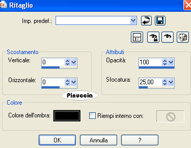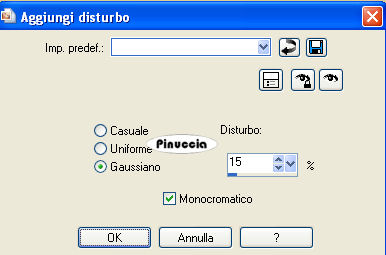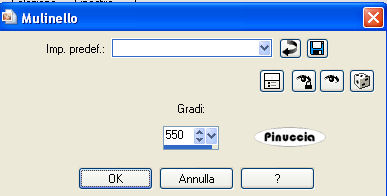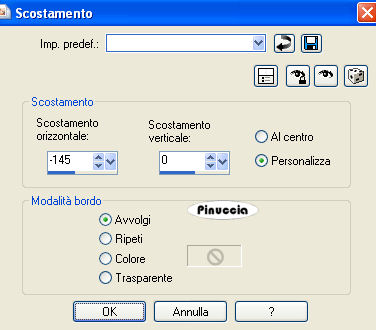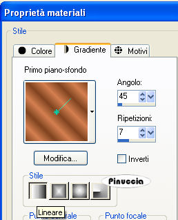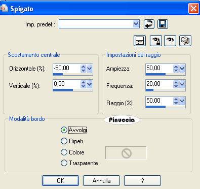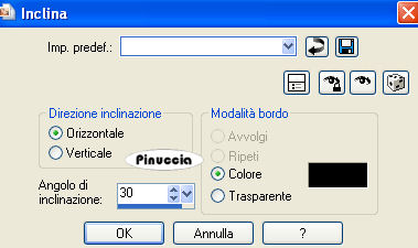 1. Apri una nuova immagine trasparente 700 x 500 pixels. 2. Imposta il colore di primo piano con il colore scuro #7f4320, e il colore di sfondo con il colore chiaro #d47f50. 3. Riempi l'immagine trasparente con il colore scuro.4. Effetti>Plugins>Graphics Plus - Cross Shadow. ![]() 5. Effetti>Effetti di distorsione>Mulinello. ![]() 6. Effetti>Effetti di distorsione>Spigato: ![]() Metti da parte questa immagine per il momento. 7. Apri una nuova immagine trasparente 350 x 400 pixels. Ripeti i punti 3, 4, 5 e 6. 8. Apri il tube tailouana_femme7 e vai a Modifica>Copia. Torna al tuo lavoro (350x400) e vai a Modifica>Incolla come nuovo livello. Sposta il tube un po' più in basso.9. Livelli>Unisci>Unisci tutto. 10. Immagine>Aggiungi bordatura, 2 pixels, simmetriche, con il colore chiaro. 11. Modifica>Copia. 12. Attiva l'immagine che hai messo da parte prima e vai a Modifica>Incolla come nuovo livello. Attenzione!! non spostare l'immagine. 13. Livelli>Duplica - 2 volte. 14. Attiva il livello Raster 2 (l'immagine originale). 15. Effetti>Effetti di distorsione>Vento - da destra, intensità 80. ![]() 16. Regola>Messa a fuoco>Metti a fuoco. 17. Attiva il livello della prima copia. Ripeti l'Effetto Vento, ma questa volta da sinistra. ![]() 18. Regola>Messa a fuoco>Metti a fuoco. 19. Chiudi il livello inferiore di sfondo. Livelli>Unisci>Unisci visibile. Riapri il livello inferiore e rimani posizionato sul livello superiore (Uniti). 20. Effetti>Effetti di immagine>Scostamento: ![]() 21. Effetti>Effetti 3D>Sfalsa ombra. ![]() Ripeti l'Effetto Sfalsa ombra, cambiando verticale e orizzontale con -5. 22. Livelli>Nuovo livello raster. Attiva lo strumento Selezione ,clicca sull'icona Selezione personalizzata ![]() e imposta i seguenti settaggi: ![]() Riempi la selezione con il colore chiaro.23. Selezione>Modifica>Contrai - 2 pixels. Premi sulla tastiera il tasto CANC. 24. Selezione>Deseleziona. 25. Effetti>Effetti 3D>Sfalsa ombra. ![]() 26. Effetti>Effetti di distorsione>Vento - da destra, intensità 100. ![]() 27. Livelli>Duplica. 28. Attiva lo strumento Spostamento ![]() e, tenendo premuto il tasto ctrl (se stai usando PSP X), o il tasto della maiuscola (se stai usando PSP 9), premi 4 volte sulla tastiera la freccia giù. sull'uso delle frecce della tastiera abbinato allo strumento Spostamento vedi qui 29. Livelli>Duplica. 30. Ripeti il passo 28. E dovresti avere questo: ![]() 31. Apri rw_autumnsarrival e vai a Modifica>Copia. Torna al tuo lavoro e vai a Modifica>Incolla come nuovo livello. Sposta il tube un po' più in basso e a destra.![]() 32. Attiva il livello Uniti. 33. Attiva lo strumento Selezione a mano libera , da punto a punto,e seleziona la parte dello sfondo visibile sul libro: ![]() 34. Premi sulla tastiera il tasto CANC. 35. Selezione>Deseleziona. 36. Apri "autumn leaves". Seleziona una foglia e vai a Modifica>Copia. Torna al tuo lavoro e vai a Modifica>Incolla come nuovo livello. Posiziona la foglia come preferisci.Ripeti se vuoi aggiungere un'altra foglia. 37. Se vuoi, Aggiungi il tuo nome e/o il tuo watermark. 38. Livelli>Unisci>Unisci tutto. 39. Immagine>Aggiungi bordatura, 2 pixels, simmetriche, con il colore chiaro. 40. Selezione>Seleziona tutto. Immagine>Aggiungi bordatura, 35 pixels, simmetriche, con il colore scuro. Selezione>Inverti. 41. Cambia i settaggi del gradiente. ![]() 42. Riempi la selezione con il gradiente.43. Effetti>Effetti geometrici>Inclina. ![]() 44. Selezione>Deseleziona. 45. Seleziona con la bacchetta magica le parti nere.![]() 46. Riempi: ![]() con il colore di sfondo. 47. Regola>Aggiungi/Rimuovi disturbo>Aggiungi disturbo. ![]() 48. Effetti>Plugins>FM Tile Tools - Blend Emboss, con i settaggi standard ![]() 49. Selezione>Seleziona tutto. Selezione>Modifica>Contrai - 35 pixels. Selezione>Inverti. 50. Effetti>Effetti 3D>Ritaglio: ![]() 51. Selezione>Deseleziona. 52. Immagine>Aggiungi bordatura, 2 pixels, simmetriche, con il colore chiaro. Salva in formato jpg.