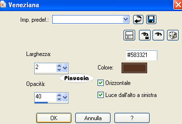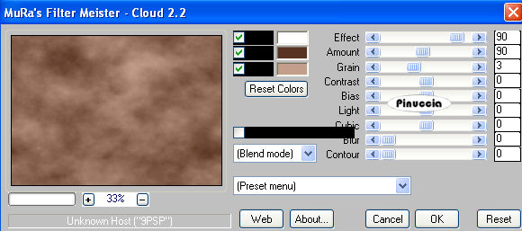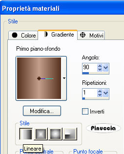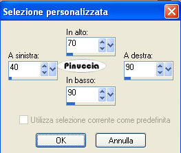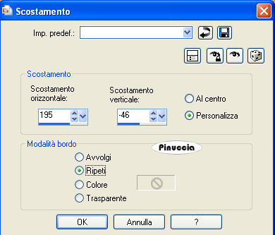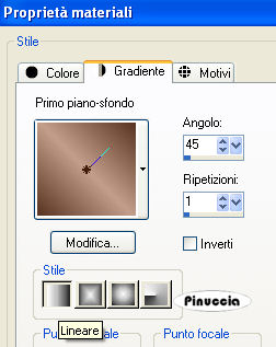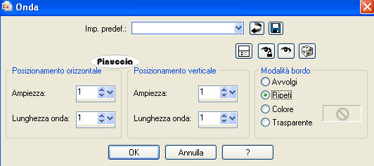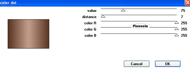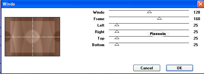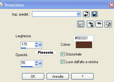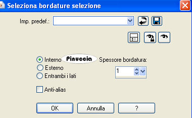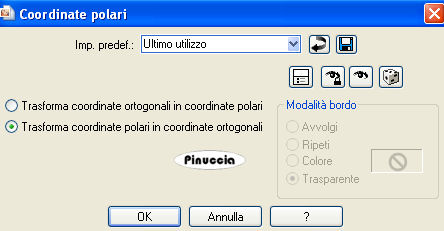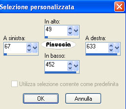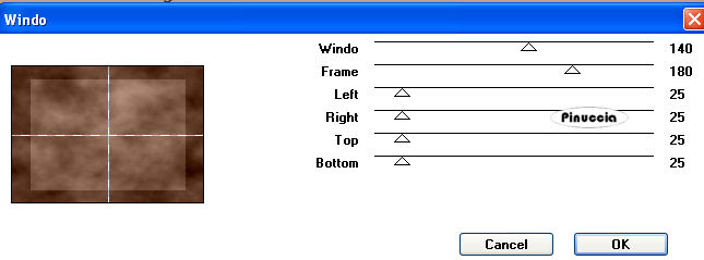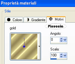 qui puoi trovare qualche risposta ai tuoi dubbi. Se l'argomento che ti interessa non è presente, ti prego di segnalarmelo. Occorrente: Materiale qui Filtri: Mura's Meister - Cloud qui Mocks - Windo qui Simple qui Penta.com - Color dot qui Apri i tubes in PSP e minimizzali nella tua area di lavoro. ![]() 1. Apri una nuova immagine trasparente 700 x 500 pixels. 2. Imposta il colore di primo piano con il colore scuro #583321. 3. Imposta il colore di sfondo con il colore chiaro #c39e8a. 4. Passa il colore di primo piano a Gradiente di primo piano/sfondo, stile lineare, con i seguenti settaggi: ![]() 5. Riempi l'immagine trasparente con il gradiente.6. Regola>Sfocatura>Sfocatura gaussiana - raggio 30. ![]() 7. Effetti>Plugins>Mura's Meister - Cloud: ricorda che questo filtro lavora con i lavori impostati nella paletta dei materiali, ma tiene in memoria il primo settaggio dall'apertura del programma. Quindi se hai già usato il filtro, per essere sicuro di avere impostati i colori corretti premi il tasto Reset. Premere successivamente il tasto Reset serve per cambiare casualmente (ragione per la quale il tuo risultato non potrà essere uguale al mio esempio), l'aspetto delle nuvole. ![]() 8. Effetti>Plugins>Mock - Windo: ![]() 9. Attiva lo strumento Bacchetta magica ![]() e seleziona i bordi interni creati dal filtro. Lo spazio è piccolo e difficile da riempire. Per vedere meglio, ingrandisci l'immagine attivando lo zoom o usando la rotellina del mouse.10. Passa il colore di primo piano a Motivi e seleziona un motivo oro. ![]() se non hai un motivo oro clicca qui Riempi il bordino con il motivo oro.![]() 11. Selezione>Deseleziona. 12. Livelli>Nuovo livello raster. 13. Selezione personalizzata ![]() ![]() 14. Riempi la selezione con il motivo oro.15. Selezione>Modifica>Contrai - 1 pixel. Riporta il colore di primo piano al colore scuro. 16. Riempi la selezione con il colore scuro #583321.17. Selezione>Modifica>Contrai - 5 pixels. Riporta il colore di primo piano al Motivo oro. 18. Riempi la selezione con il motivo oro.Riporta il colore di primo piano al gradiente del punto 4. ![]() 19. Selezione>Modifica>Contrai - 1 pixel. 20. Riempi con il gradiente.21. Regola>Sfocatura>Sfocatura gaussiana - raggio 20. ![]() 22. Effetti>Plugins>Penta.com - Color Dot: ![]() 23. Apri il tube Flying Free_Misted by Kathy_Kms e vai a Modifica>Copia. 24. Torna al tuo lavoro e vai a Modifica>Incolla nella selezione. 25. Selezione>Deseleziona. 26. Livelli>Unisci>Unisci tutto. 27. Selezione>Seleziona tutto. 28. Immagine>Aggiungi bordatura, 1 pixel, simmetriche, con un colore qualsiasi. 29. Selezione>Inverti. Riporta nuovamene il colore di primo piano al motivo oro. Ingrandisci l'immagine per vedere meglio il piccolo spazio. 30. Riempi la selezione con il motivo oro.31. Selezione>Deseleziona. 32. Immagine>Ridimensiona, all'80%, tutti i livelli selezionato, ricampionamento bicubica. ![]() Metti da parte questa immagine per il momento. 33. Apri una nuova immagine trasparente 700 x 500 pixels. Cambia i settaggi del gradiente. ![]() 34. Riempi l'immagine trasparente con il gradiente.35. Regola>Sfocatura>Sfocatura gaussiana - raggio 30. ![]() 36. Effetti>Effetti di trama>Veneziana, con il colore scuro #583321. ![]() 37. Effetti>Effetti di distorsione>Onda: ![]() 38. Effetti>Effetti di distorsione>Coordinate polari: ![]() 39. Effetti>Effetti di bordo>Aumenta. 40. Livelli>Duplica. 41. Immagine>Capovolgi. Abbassa l'opacità di questo livello al 50%. 42. Livelli>Unisci>Unisci visibile. 43. Effetti>Plugins>Penta.com - Color Dot, con i settaggi del punto 22. 44. Effetti>Plugins>Mock - Windo: ![]() 45. Attiva lo strumento Bacchetta magica e seleziona il bordo interno.46. Passa il colore di primo piano al Motivo oro e riempi la selezione con questo motivo.47. Selezione>Deseleziona. 48. Livelli>Nuovo livello raster. 49. Selezione personalizzata ![]() ![]() 50. Attiva l'immagine più piccola che hai messo da parte al punto 32 e vai a Modifica>Copia. 51. Torna al tuo lavoro e vai a Modifica>Incolla nella selezione. 52. Selezione>Deseleziona. 53. Regola>Messa a fuoco>Metti a fuoco. 54. Effetti>Effetti 3D>Sfalsa ombra: ![]() 55. Ripeti l'Effetto Sfalsa ombra, cambiando verticale e orizzontale con -5. 56. Livelli>Nuovo livello raster. 57. Selezione personalizzata ![]() ![]() 58. Passa il colore di primo piano a Gradiente con i settaggi del punto 1: ![]() Riempi la selezione con il gradiente.59. Effetti>Effetti di trama>Veneziana, con il colore scuro #583321: ![]() 60. Effetti>Effetti di bordo>Aumenta. 61. Selezione>Modifica>Seleziona bordature selezione: ![]() 62. Passa nuovamente il colore di primo piano al Motivo oro e riempi la selezione con il motivo oro.![]() 63. Selezione>Deseleziona. 64. Effetti>Plugins>Simple - Top left mirror. 65. Apri Autumn_Whispers e vai a Modifica>Copia. 66. Torna al tuo lavoro e vai a Modifica>Incolla come nuovo livello. 67. Effetti>Effetti di immagine>Scostamento: ![]() 68. Livelli>Duplica. 69. Regola>Sfocatura>Sfocatura gaussiana - raggio 20. ![]() 70. Livelli>Disponi>Sposta giù. 71. Livelli>Unisci>Unisci tutto. 72. Selezione>Seleziona tutto. 73. Immagine>Aggiungi bordatura, 1 pixel, simmetriche, con un colore qualsiasi. 74. Selezione>Inverti. 75. Riempi la selezione con il motivo oro.76. Selezione>Seleziona tutto. 77. Immagine>Aggiungi bordatura, 5 pixels, simmetriche, con il colore scuro #583321. 78. Selezione>Seleziona tutto. 79. Immagine>Aggiungi bordatura, 1 pixel, simmetriche, con un colore qualsiasi. 80. Selezione>Inverti. 81. Riempi la selezione con il motivo oro.82. Selezione>Deseleziona. 83. Regola>Luminosità e contrasto>Nitidezza: ![]() Aggiungi il tuo nome e/o il tuo watermark e salva in formato jpg. ![]() Se hai problemi o dubbi, o trovi un link non funzionante, o anche soltanto per un saluto, scrivimi 30 Marzo 2009 |