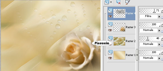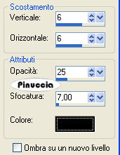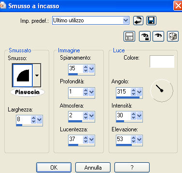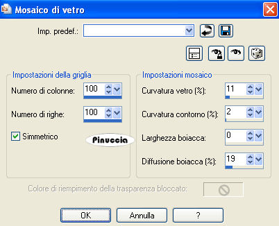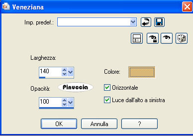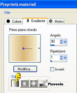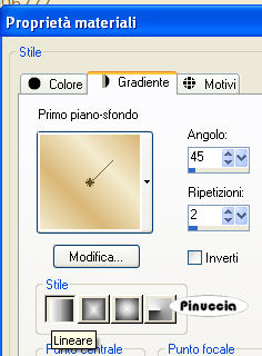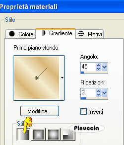 qui puoi trovare qualche risposta ai tuoi dubbi. Se l'argomento che ti interessa non è presente, ti prego di segnalarmelo. Occorrente: Materiale qui I tubes che ho usato sono di Kat, Marif, Sandi e Gina. Filtri: FM Tile Tools - Blend Emboss qui Apri il font e minimizzalo nella tua area di lavoro. Lo troverai nella lista dei font disponibili quando ti servirà. ![]() 1. Apri una nuova immagine trasparente 700 x 500 pixels. Imposta il colore di primo piano con il colore chiaro #f3ecd0. Imposta il colore di sfondo con il colore scuro #d9b777. Passa il colore di primo piano a Gradiente di primo piano/sfondo, stile lineare, con i seguenti settaggi: ![]() Riempi l'immagine trasparente con il gradiente.2. Livelli>Nuovo livello raster. Selezione>Seleziona tutto. Apri il tube mistedrose03 e vai a Modifica>Copia. Torna al tuo lavoro e vai a Modifica>Incolla nella selezione. Selezione>Deseleziona. 3. Effetti>Effetti di immagine>Motivo unico, con i settaggi standard. ![]() 4. Regola>Sfocatura>Sfocatura da movimento. ![]() 5. Effetti>Plugins>FM Tile Tools - Blend Emboss, con i settaggi standard. ![]() 6. Ripeti l'Effetto Blend Emboss. 7. Nella paletta dei livelli abbassa l'opacità di questo livello tra il 30 e il 40%, come ti sembra meglio. 8. Apri il tube Kat_0516l e vai a Modifica>Copia. Torna al tuo lavoro e vai a Modifica>Incolla come nuovo livello. 9. Immagine>Ruota per gradi - 25 gradi a destra. ![]() Sposta il tube nell'angolo in basso a destra.10. Apri il tube Marif_2006_octobr_misted_decor078 e vai a Modifica>Copia. Torna al tuo lavoro e vai a Modifica>Incolla come nuovo livello. Sposta il tube un po' più in alto a destra.Nella paletta dei livelli cambia la modalità di miscelatura di questo livello in Filtra, o Luce diffusa (come ti sembra meglio), e abbassa l'opacità tra il 70 e l'80%. ![]() 11. Apri il tube MomentIntime_MistedByGini_06-06-06.e vai a Modifica>Copia. Torna al tuo lavoro e vai a Modifica>Incolla come nuovo livello. Spostalo a sinistra, non troppo vicino al bordo.![]() 12. Livelli>Nuovo livello raster. Attiva lo strumento Selezione ![]() clicca sull'icona Selezione personalizzata ![]() e imposta i seguenti settaggi: ![]() 13. Cambia i settaggi del gradiente. ![]() Riempi la selezione con il gradiente.Selezione>Deseleziona. 14. Effetti>Effetti di trama>Mosaico di vetro: ![]() 15. Effetti>Effetti di bordo>Aumenta. (se stai usando colori scuri salta questo passaggio). 16. Livelli>Duplica. Immagine>Rifletti. A questo punto, controlla se tutto è a posto. Se vuoi, puoi ancora spostare i tubes per sistemarli meglio, e, ancora, puoi decidere se vuoi cambiare le impostazioni di modalità di miscelatura e opacità, come ti sembra meglio. ![]() 17. Chiudi il colore di primo piano, e imposta il colore di sfondo con #d9b777. Attiva lo strumento Testo , font Scriptina, crea come vettore, dimensione 48 (o 60 se stai usando PSP X),e scrivi un testo sull'immagine. 18. Livelli>Converti in livello raster. 19. Effetti>Effetti 3D>Sfalsa ombra, con i seguenti settaggi, colore #644c1e: ![]() 20. Apri il tube Butterfly e vai a Modifica>Copia. Torna al tuo lavoro e vai a Modifica>Incolla come nuovo livello. Posiziona la farfalla dove preferisci.21. Livelli>Unisci>Unisci tutto. 22. Immagine>Aggiungi bordatura, 1 pixel, simmetriche, con il colore scuro #d9b777. 23. Cambia i settaggi del gradiente. ![]() 24. Selezione>Seleziona tutto. 25. Immagine>Aggiungi bordatura, 25 pixels, simmetriche, con un colore qualsiasi. 26. Selezione>inverti. 27. Riempi la selezione con il gradiente.28. Effetti>Effetti di trama>Veneziana, con il colore scuro #d9b777: ![]() 29. Effetti>Effetti di bordo>Aumenta di più. (salta questo passaggio se stai usando colori scuri). 30. Effetti>Effetti 3D>Smusso a incasso: ![]() 31. Selezione>Inverti. 32. Effetti>Effetti 3D>Sfalsa ombra, con il colore nero. ![]() Ripeti l'Effetto Sfalsa ombra, cambiando verticale e orizzontale con -6. 33. Selezione>Deseleziona. 34. Immagine>Aggiungi bordatura, 1 pixel, simmetriche, con il colore scuro #d9b777. Aggiungi il tuo nome e/o il tuo watermark e salva in formato jpg. ![]() Per questo esempio ho usato tubes di Monique e Luz Cristina. ![]() ![]() ![]() Le vostre versioni. Grazie ![]() Gianni ![]() Se hai problemi o dubbi, o trovi un link non funzionante, o anche soltanto per un saluto, scrivimi 30 Marzo 2009 |