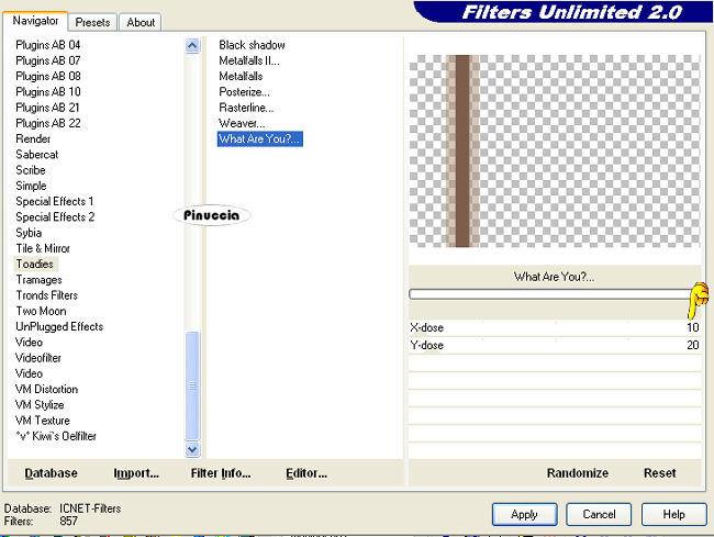 qui puoi trovare qualche risposta ai tuoi dubbi. Se l'argomento che ti interessa non è presente, ti prego di segnalarmelo. Questo tutorial è stato scritto con PSP X2, ma può essere eseguito anche con le altre versioni di PSP. Per tradurlo, ho usato PSP X. Occorrente: Materiale qui Una volta scompattato lo zip, troverai quattro cartelle: ![]() 1. Platjes: Immagini, da aprire in PSP. 2. Selecties: Selezioni da mettere nella cartella Selezioni. 3. Tubes, da aprire in PSP. 4. Voorinstelling Perspective Shadow: preset per il filtro Eye Candy 5 Impact: da mettere nella cartella del filtro: Setting>Shadow Il tube della donna è di Patries e il tube del vaso è di Lori. Filtri: Filters Unlimited 2.0 qui Funhouse qui Alien Skin Eye Candy 5 Impact qui VanDerLee - Unplugged-X qui Toadies qui Mura's Meister - Perspective Tiling qui L&K landsiteofwonders - Zitah qui
