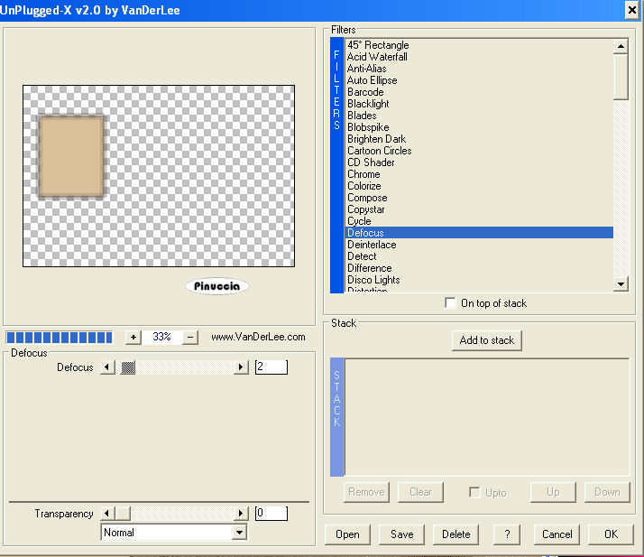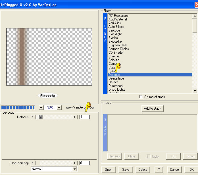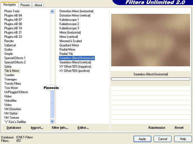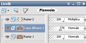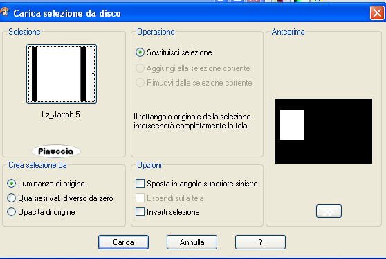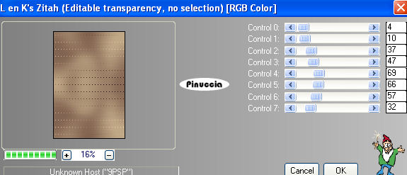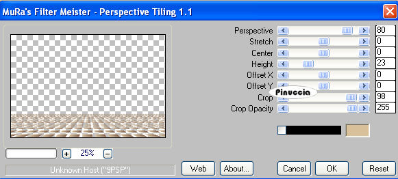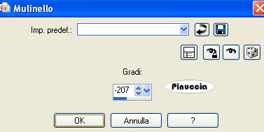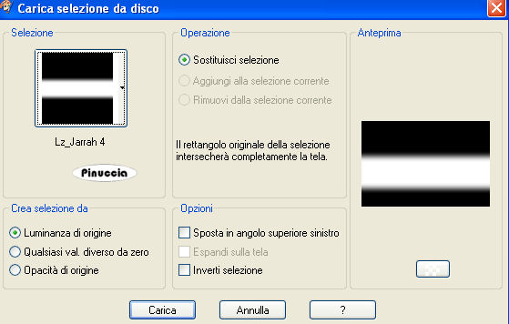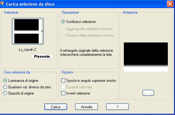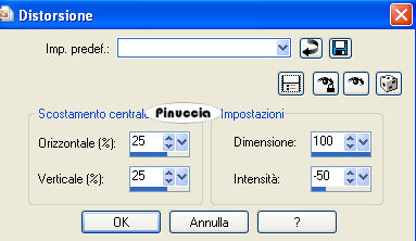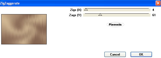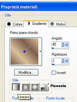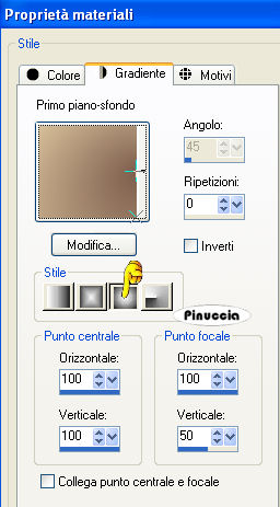 1. Apri una nuova immagine trasparente 900 x 600 pixels. 2. Imposta il colore di primo piano con il colore scuro #7d5e4d, e il colore di sfondo con il colore chiaro #d8c09a. 3. Passa il colore di primo piano a Gradiente, stile lineare: ![]() 4. Riempi l'immagine trasparente con il gradiente.5. Effetti>Effetti di distorsione>Distorsione: ![]() 6. Effetti>Effetti di distorsione>Mulinello. ![]() 7. Regola>Sfocatura>Sfocatura gaussiana - raggio 40. ![]() 8. Effetti>Plugins>Funhouse - Zigzaggerate: ![]() 9. Effetti>Plugins>Filters Unlimited - Tile&Mirror - Seamless Blend (horizontal). ![]() 10. Livelli>Duplica. 11. Immagine>Ruota a destra. se stai usando PSP 9: Regola>Ruota>90 gradi in senso orario 12. Effetti>Plugins>L&K - Zitah: ![]() 13. Immagine>Ruota a sinistra. se stai usando PSP 9: Immagine>Ruota>90 gradi in senso antiorario. 14. Abbassa l'opacità di questo livello al 75%. ![]() 15. Livelli>Nuovo livello raster. 16. Selezione>Carica/Salva selezione>Carica selezione da disco. Cerca e carica la selezione Lz_Jarra1. ![]() Riporta il colore di primo piano da gradiente al colore scuro #7d5e4d. Riempi la selezione con questo colore.17. Selezione>Deseleziona. 18. Effetti>Effetti di bordo>Aumenta di più. 19. Effetti>Plugins>Filters Unlimited - Toadies - What are you? - X-dose a 10. ![]() 20. Effetti>Plugins>VanDerLee - Unplugged-X, imposta Defocus, con i seguenti settaggi. ![]() 21. Effetti>Effetti di bordo>Aumenta di più. 22. Livelli>Duplica. Livelli>Unisci>Unisci giù. Cambia la modalità di miscelatura di questo livello in Moltiplica, lascia l'opacità al 100%. ![]() 23. Livelli>Duplica. Immagine>Rifletti. Livelli>Unisci>Unisci giù. 24. Sullo stesso livello. Selezione>Carica/Salva selezione>Carica selezione da disco. Cerca e carica la selezione Lz_Jarra2. ![]() 25. Premi sulla tastiera due volte il tasto CANC. 26. Mantieni selezionato e attiva il livello Copia di Raster 1. ![]() Premi due volte sulla tastiera il tasto CANC. 27. Selezione>Deseleziona. 28. Attiva il livello superiore. Livelli>Nuovo livello raster. Selezione>Carica/Salva selezione>Carica selezione da disco. Cerca e carica la selezione Lz_Jarra3. ![]() 29. Cambia i settaggi del gradiente, stile sprazzo di luce. ![]() 30. Riempi la selezione con il gradiente.31. Selezione>Deseleziona. 32. Effetti>Effetti di bordo>Aumenta. 33. Effetti>Plugins>Mura's Meister - Perspective Tiling: ![]() 34. Effetti>Plugins>Alien Skin Eye Candy 5 Impact - Perspective Shadow: seleziona il preset Lz-Jarrah 1 e clicca ok. ![]() nella mia schermata le impostazioni si trovano nella parte inferiore, perchè le ho richiamate dalla cartella del tutorial. Se le avessi salvate nella cartella del filtro, si troverebbero nella parte superiore. Vedi la scheda del filtro qui 35. Sullo stesso livello: Selezione>Carica/Salva selezione>Carica selezione da disco. Cerca e carica la selezione Lz_Jarra4. ![]() 36. Premi sulla tastiera due volte il tasto CANC. 37. Selezione>Deseleziona. 38. Abbassa l'opacità di questo livello al 50%. 39. Livelli>Duplica. 40. Abbassa l'opacità di questo livello al 30% e cambia la modalità di miscelatura in Indebolisci. ![]() 41. Apri il tube Lz Herfst e vai a Modifica>Copia. Torna al tuo lavoro e vai a Modifica>Incolla come nuovo livello. Sposta il tube un po' più in alto.42. Cambia la modalità di miscelatura di questo livello in Luminanza (esistente), e abbassa l'opacità al 50%. 43. Effetti>Effetti di bordo>Aumenta. 44. Livelli>Nuovo livello raster. Selezione>Carica/Salva selezione>Carica selezione da disco. Cerca e carica la selezione Lz_Jarra5. ![]() 45. Riporta il colore di primo piano da gradiente al colore scuro #7d5e4d, per fare questo apri il menu nella paletta del colore di primo piano e clicca sull'icona corrispondente. ![]() Riempi la selezione con questo colore.46. Selezione>Modifica>Contrai - 5 pixels. ![]() 47. Riempi la selezione con il colore chiaro di sfondo #d8c09a.48. Selezione>Deseleziona. 49. Effetti>Plugins>VanDerLee - Unplugged-X - mantieni Defocus e porta il settaggio a 2. ![]() 50. Effetti>Effetti di bordo>Aumenta. 51. Livelli>Duplica. Livelli>Unisci>Unisci giù. 52. Livelli>Duplica. Immagine>Rifletti. Livelli>Unisci>Unisci giù. 53. Attiva lo strumento Bacchetta magica ![]() ![]() e clicca sul rettangolo a sinistra per selezionarlo. Apri "Plaatje 1" e vai a Modifica>Copia. Torna al tuo lavoro e vai a Modifica>Incolla nella selezione. selezione>Deseleziona. 54. Seleziona con la bacchetta magica Apri "Plaatje 2" e vai a Modifica>copia. Torna al tuo lavoro e vai a Modifica>Incolla nella selezione. Selezione>Deseleziona. 55. Apri il tube "1Patries_Brownlace&blondmodel-18-11-08" e vai a Modifica>Copia. Torna al tuo lavoro e vai a Modifica>Incolla come nuovo livello. Sposta il tube un po' più a sinistra.56. Effetti>Plugins>Alien Skin Eye Candy 5 Impact - Perspective Shadow, seleziona il preset Lz-Jarrah2 e clicca ok. ![]() 57. Apri il tube Orchids_vaas e vai a Modifica>Copia. Torna al tuo lavoro e vai a Modifica>Incolla come nuovo livello. Sposta il tube a destra, vedi il mio esempio.58. Effetti>Plugins>Alien Skin Eye Candy 5 Impact - Perspective Shadow, seleziona nuovamente il preset Lz-Jarrah 2 e clicca ok. 59. Immagine>Aggiungi bordatura, 1 pixel, simmetriche selezionato, con il colore scuro #7d5e4d. 60. Immagine>Aggiungi bordatura, simmetriche non selezionato, con il colore chiaro #d8c09a. ![]() 61. Immagine>Aggiungi bordatura, simmetriche non selezionato, con il colore scuro #7d5e4d superiore e inferiore 3 pixels. ![]() 62. Immagine>Aggiungi bordatura, simmetriche non selezionato, con il colore chiaro #d8c09a, superiore e inferiore 1 pixel. 63. Immagine>Aggiungi bordatura, simmetriche non selezionato, con il colore scuro #7d5e4d, superiore e inferiore 30 pixels. 64. Seleziona i bordi superiore e inferiore con la bacchetta magica ![]() 65. Immagine>Ruota a destra. 66. Effetti>Plugins>L&K - Zitah, con i settaggi precedenti. 67. Immagine>Ruota a sinistra. 68. Effetti>Effetti 3D>Ritaglio. ![]() 69. Regola>M