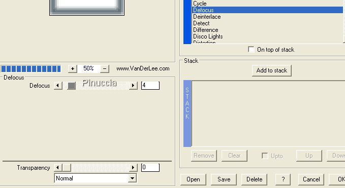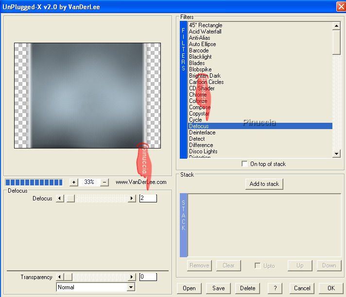 23. Effetti>Plugins>VanDerLee - Unplugged-X, seleziona Defocus, imposta il settaggio a 2, e clicca ok: