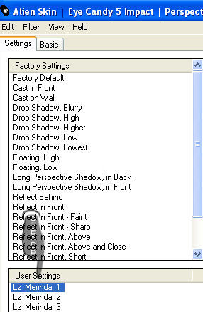 .Voorinstellingen Shadow, sono le impostazioni predefinite del filtro Alien Skin Eye Candy 5 Impact, Perspective Shadow, da mettere nella cartella Settings>Shadows del filtro.