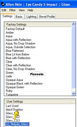 3. Lz_Miriyan Voorinstelling Glass (preset da copiare nella cartella del filtro: Alien Skin Eye Candy 5 Impact>Settings>Glass. Se preferisci, puoi importare direttamente il preset da questa cartella, quando ti servirà. Vedi la scheda del filtro qui e come importare un preset qui.