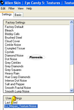 5. Lz_Miriyan Voorinstelling Texture Noise (preset da copiare nella cartella del filtro Alien skin Eye Candy 5 Textures>Settings>TextureNoise (come sopra).