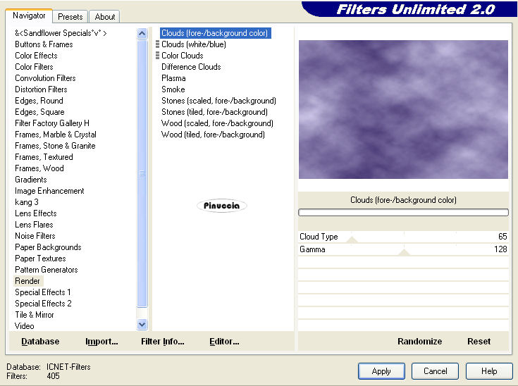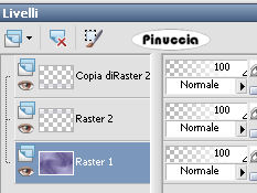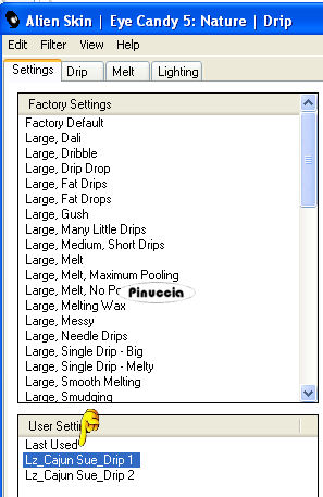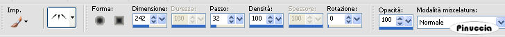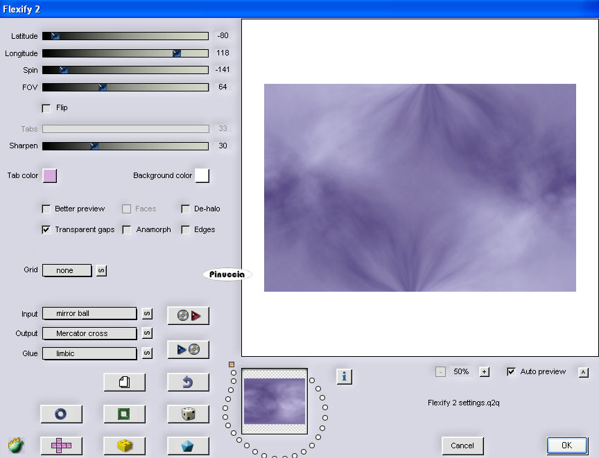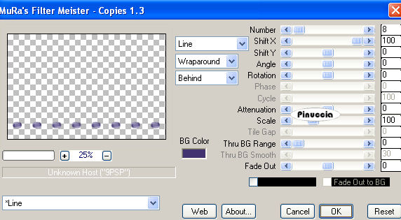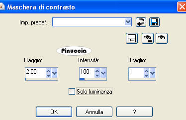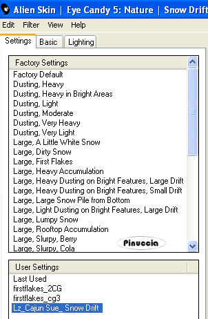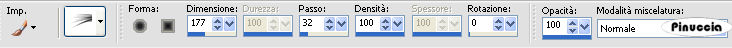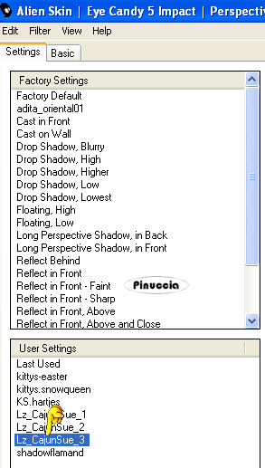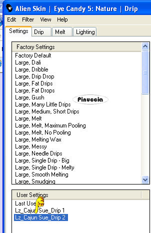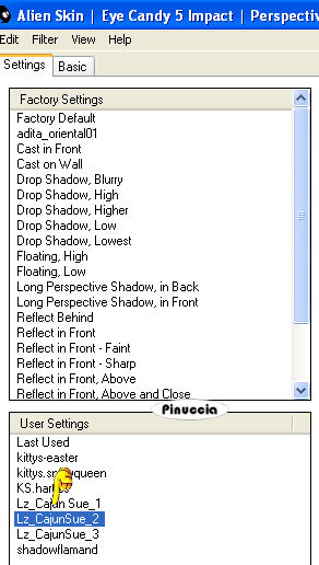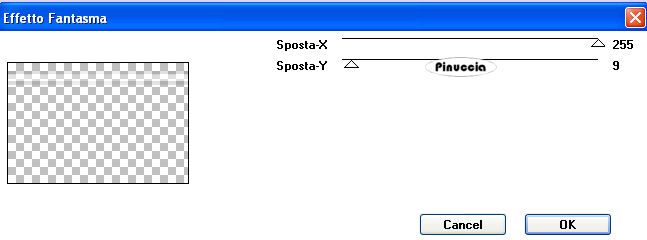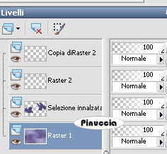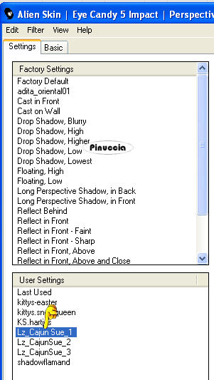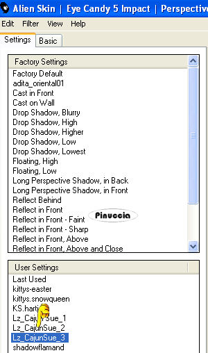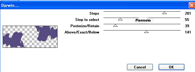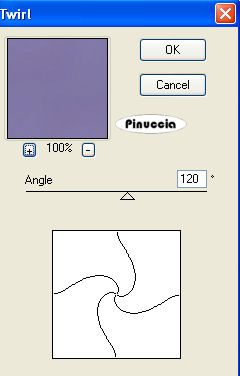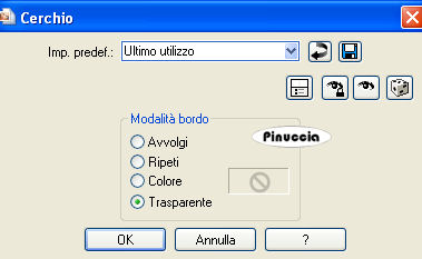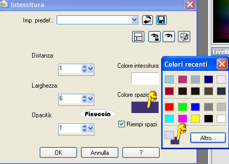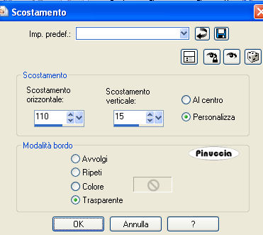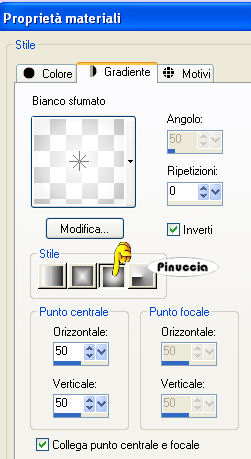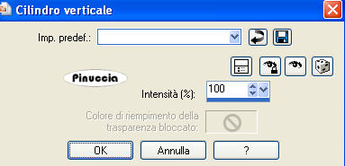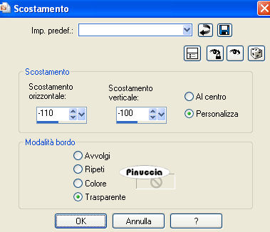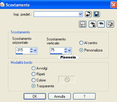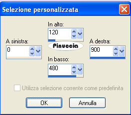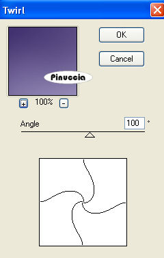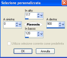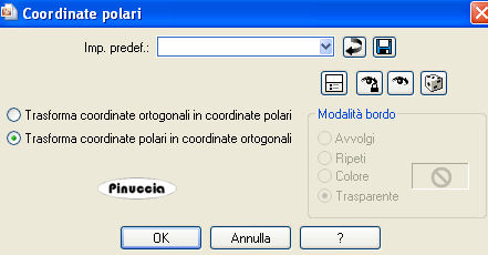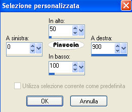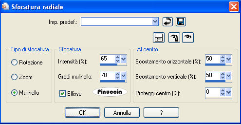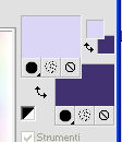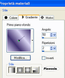 Preparazione. Imposta il colore di primo piano con il colore chiaro #dbd6f4, e il colore di sfondo con il colore scuro #423270. Passa il colore di primo piano a Gradiente lineare: ![]() 1. Apri una nuova immagine trasparente 900 x 600 pixels. 2. Riempi l'immagine trasparente con il gradiente.3. Effetti>Effetti di distorsione>Coordinate polari. ![]() 4. Effetti>Plugins>Distort - Twirl. ![]() 5. Regola>Sfocatura>Sfocatura radiale. ![]() 6. Livelli>Duplica. 7. Effetti>Plugins>Filters Unlimited 2.0 - Render (fore-/background color). ![]() 8. Nella paletta dei livelli abbassa l'opacità di questo livello al 65%. ![]() 9. Livelli>Unisci>Unisci giù. 10. Effetti>Plugins>Flaming Pear - Flexify 2. ![]() 11. Effetti>Plugins>Distort - Twirl. ![]() 12. Livelli>Nuovo livello raster. 13. Attiva lo strumento Selezione ,clicca sull'icona Selezione personalizzata ![]() e imposta i seguenti settaggi: ![]() 14. Cambia i settaggi del gradiente e seleziona il gradiente Bianco sfumato, con i seguenti settaggi: se stai usando PSP X2, il corrispondente gradiente è Corel_06_028 (sulle diverse denominazioni degli strumenti nelle varie versioni di PSP, vedi qui) ![]() 15. Riempi la selezione con il gradiente.16. Selezione>Deseleziona. 17. Effetti>Effetti di distorsione>Vento - da destra, intensità 100. ![]() 18. Effetti>Plugins>It@lian Editors - Effetto Fantasma. ![]() 19. Ripeti ancora una volta l'Effetto Fantasma, con gli stessi settaggi (Modifica>Ripeti Effetto Fantasma). 20. Effetti>Effetti di bordo>Aumenta di più. 21. Effetti>Effetti di trama>Intessitura, colore intessitura: bianco; colore spazio #423270. ![]() 22. Livelli>Duplica. 23. Abbassa l'opacità di questo livello al 65%. ![]() 24. Livelli>Unisci>Unisci giù. 25. Livelli>Duplica. 26. Immagine>Capovolgi. Se tutto è andato bene, dovresti avere questo. ![]() Attiva il livello inferiore. ![]() 27. Selezione personalizzata ![]() ![]() 28. Selezione>Innalza selezione a livello. Mantieni selezionato. 29. Effetti>Plugins>Toadies - Darwin. ![]() Se stai usando altri colori, sperimenta le impostazioni più adatte. Alla fine, il risultato dovrebbe essere questo. ![]() 30. Effetti>Effetti di trama>Incannicciato, con il colore bianco. ![]() Mantieni selezionato. Attiva nuovamente il livello inferiore. ![]() 31. Effetti>Plugins>Alien Skin Eye Candy 5 Nature - Snow Drift. Seleziona il preset Lz_Cajun Sue_Snow Drift e clicca ok. se hai copiato il preset nella cartella del filtro, lo troverai nella sezione superiore, se lo hai importato lo troverai nella sezione inferiore. ![]() 32. Regola>Messa a fuoco>Maschera di contrasto ![]() 33. Selezione>Deseleziona. 34. Livelli>Unisci>Unisci visibile. ![]() 35. Finestra>Duplica, minimizza l'originale e lavora sulla copia. 36. Effetti>Effetti geometrici/Cerchio. ![]() 37. Immagine>Ridimensiona, al 7%, tutti i livelli selezionato. ![]() 38. Effetti>Effetti geometrici>Cilindro verticale. ![]() 39. Effetti>Plugins>Alien Skin Eye Candy 5 Impact - Glass. Seleziona il prest Lz_Cajun Sue_Glass e clicca ok. ![]() 40. Modifica>Copia. 41. Torna al tuo lavoro originale (900x600) e vai a Modifica>Incolla come nuovo livello. 42. Effetti>Effetti di immagine>Scostamento. ![]() 43. Effetti>Plugins>Mura's Meister - Copies. ![]() 44. Effett>Plugins>Alien skin Eye Candy 5 Impact - Perspective Shadow. Seleziona il preset Lz_Cajun Sue_1 e clicca ok. ![]() 45. Finestra>Duplica, minimizza l'originale e lavora sulla copia. 46. Apri il tube Chrismist_sepia_roses e vai a Modifica>Copia. 47. Torna alla copia del tuo lavoro e vai a Modifica>Incolla come nuovo livello. Il tube è già correttamente posizionato. Non occorre spostarlo. 48. Livelli>Unisci>Unisci tutto. 49. Immagine>Ridimensiona, al 16%, tutti i livelli selezionato. ![]() 50. Immagine>Aggiungi bordatura, 1 pixel, simmetriche, con il colore scuro #423270. 51. Immagine>Aggiungi bordatura, 5 pixels, simmetriche, con il colore chiaro #dbd6f4. 52. Immagine>Aggiungi bordatura, 1 pixel, simmetriche, con il colore scuro #423270. 53. Modifica>Copia. 54. Torna al tuo lavoro originale (900x600 pixels) e vai a Modifica>Incolla come nuovo livello. 55. Effetti>Effetti di immagine>Scostamento. ![]() 56. Livelli>Duplica. 57. Immagine>Ridimensiona, all'80%, tutti i livelli non selezionato. ![]() 58. Effetti>Effetti di immagine>Scostamento. ![]() 59. Livelli>Duplica. 60. Immagine>Ridimensiona, all'80%, tutti i livelli non selezionato. ![]() 61. Effetti>Effetti di immagine>Scostamento. ![]() 62. Livelli>Unisci>Unisci giù. 63. Ripeti Livelli>Unisci>Unisci giù, e avrai i tre quadri in un unico livello. 64. Effetti>Plugins>Alien Skin Eye Candy 5 Nature - Drip, seleziona il preset Lz_Cajun Sue_Drip1 e clicca ok. ![]() 65. Effetti>Plugins>Alien Skin Eye Candy 5 Impact - Perspective Shadow, seleziona il preset lz_cajun Sue_2 e clicca ok. ![]() 66. Livelli>Nuovo livello raster. 67. Selezione personalizzata ![]() ![]() Riporta il colore di primo piano al colore chiaro. ![]() 68. Riempi la selezione con il colore chiaro di primo piano.per vedere meglio lo spazio da selezionare, attiva lo strumento Zoom o usa la rotellina del mouse per ingrandire l'immagine69. Selezione>Deseleziona. 70. Effetti>Effetti 3D>Smusso a incasso. ![]() 71. Effetti>Plugins>Alien Skin Eye Candy 5 Nature - Drip, seleziona il preset Lz_Cajun Sue_Drip 2 e clicca ok. ![]() 72. Effetti>Effetti 3D>Sfalsa ombra. ![]() Dovresti avere questo. ![]() 73. Livelli>Nuovo livello raster. 74. Attiva lo strumento Pennello ![]() cerca e seleziona il pennello Lz_Cajun Sue_1. ![]() Applica il pennello sotto il quadretto più piccolo, cliccando con il tasto sinistro del mouse per usare il colore chiaro di primo piano #dbd6f4. ![]() 75. Effetti>Plugins>Alien Skin Eye Candy 5 Impact - Perspective Shadow, seleziona il preset Lz_CajunSue_3 e clicca ok. ![]() 76. Livelli>Nuovo livello raster. 77. Cerca e seleziona il pennello Lz_Cajun Sue_2. ![]() Applica il pennello a destra, prima cliccando con il tasto sinistro del mouse per usare il colore chiaro di primo piano #