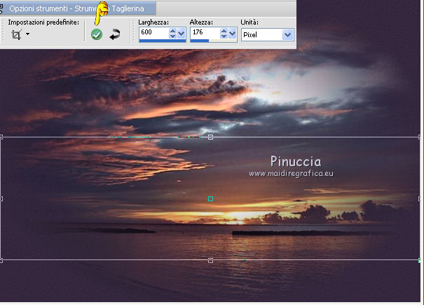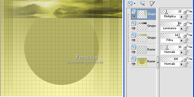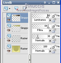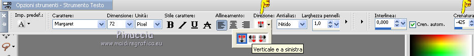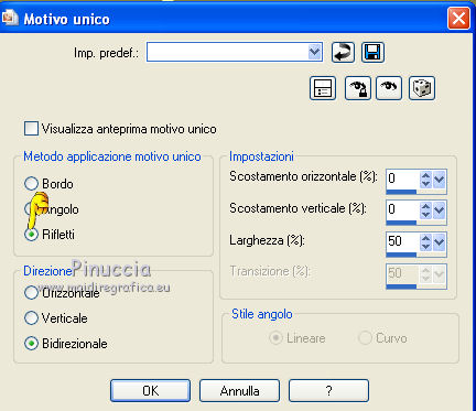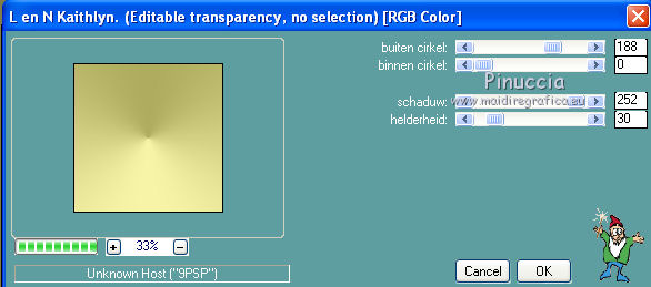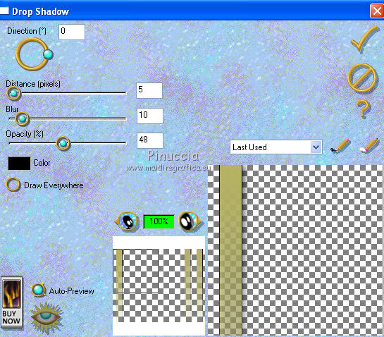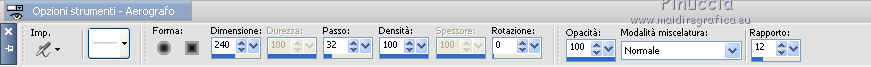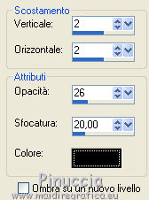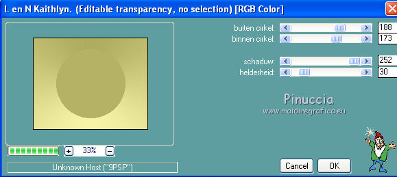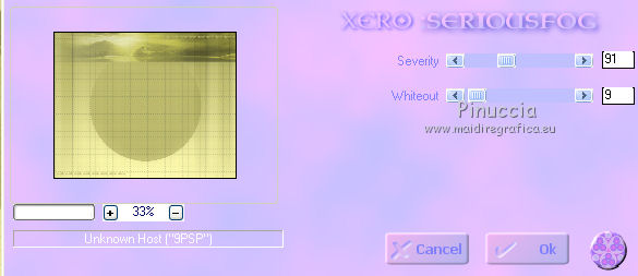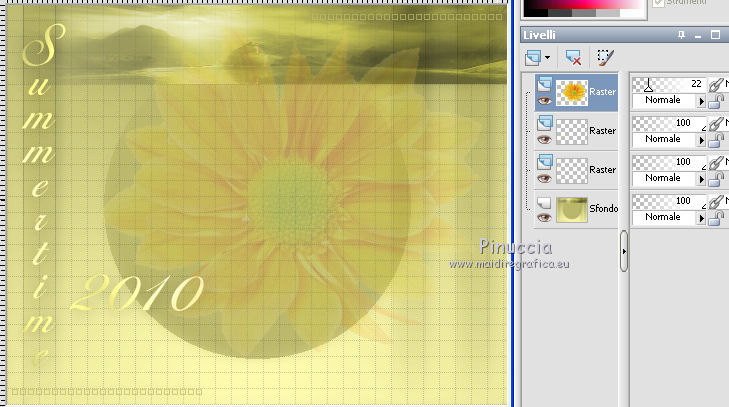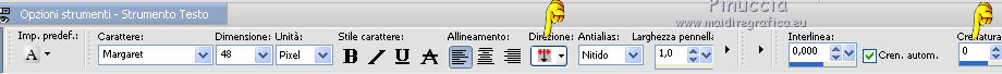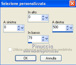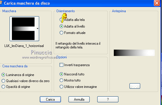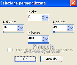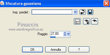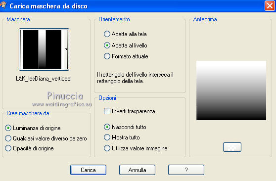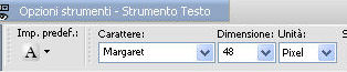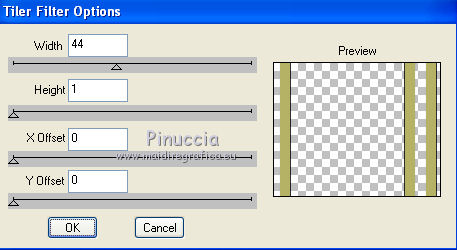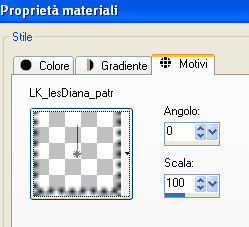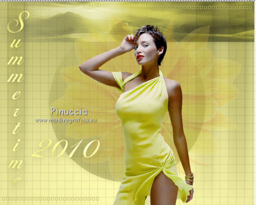 qui puoi trovare qualche risposta ai tuoi dubbi. Se l'argomento che ti interessa non è presente, ti prego di segnalarmelo. Questo tutorial è stato scritto e tradotto con PSP X. Occorrente: Materiale qui Filtri: DSB Flux qui Greg's Factory Output vol. II qui L&K Kaithlyn qui Eye Candy 3.1 qui Elles ha creato uno speciale script che trovi qui Grazie Elles (il suo sito non è più in rete). Metti le maschere nella cartella Maschere. Metti i pennelli nella cartella Pennelli. Apri il font e minimizzalo. Lo troverai nella lista dei font disponibili quando ti servirà. Apri il resto del materiale in PSP. Preparazione. Preparazione: Imposta il colore di primo piano con un colore medio (non troppo scuro scuro), preso dal tube. Io ho scelto #b5b266. ![]() 1. Apri una nuova immagine trasparente 500 x 400 pixels. 2. Riempila con il colore di primo piano.3. Effetti>Plugins>L&K Site of wonders>L&K Kaithlyn, con i seguenti settaggi: ![]() 4. Livelli>Nuovo livello raster. 5. Tra il materiale aperto in PSP hai l'immagine "L&K_lesDiana_patr". ![]() Passa il colore di primo piano a Motivi; apri il menu e, tra i motivi disponibili, troverai anche i files aperti. Seleziona l'immagine con i seguenti settaggi: ![]() 7. Riempi il livello con questo motivo.8. Nella paletta dei livelli abbassa l'opacità di questo livello al 30%. ![]() 9. Livelli>Nuovo livello raster. 10. Attiva lo strumento Selezione ,clicca sull'icona selezione personalizzata ,e imposta i seguenti settaggi. ![]() 11. Nella paletta dei materiali riporta il colore di primo piano a colore. ![]() e riempi la selezione con questo colore. Mantieni selezionato. 12. Livelli>Carica/Salva maschera>Carica maschera da disco: cerca e carica la maschera L&K_LesDiana_1_horizontaal: ![]() 13. Livelli>Unisci>Unisci gruppo. 14. Nella paletta dei livelli cambia la modalità di miscelatura in Filtra e abbassa l'opacità all'84%. ![]() 15. Mantieni ancora selezionato. 16. Livelli>Nuovo livello raster. 17. Apri la tua immagine di sfondo. Quella fornita per il tutorial - "landschape" - ha già le dimensioni corrette. 18. Se stai usando una tua immagine, attiva lo strumento Ritaglio ![]() seleziona una parte orizzontale, come nell'esempio. nella barra degli strumenti, puoi controllare la dimensione del ritaglio. ![]() 20. Clicca su Applica o fai doppio clic sull'immagine con il tasto sinistro del mouse. Modifica>Copia. Torna al tuo lavoro (l'immagine 500x400) e via a Modifica>Incolla>Incolla nella selezione. 21. Livelli>Carica/Salva maschera da disco: carica nuovamente la maschera L&K_lesDiana_2_horizontaal: ![]() Livelli>Unisci>Unisci gruppo. 22. Nella paletta dei livelli cambia la modalità di miscelatura in Luminanza (esistente) e abbassa l'opacità all'80%. ![]() 23. Selezione>Nessuna selezione. 24. Livelli>Nuovo livello raster. 25. Attiva nuovamente lo strumento Selezione ![]() selezione personalizzata ![]() e imposta i seguenti settaggi. ![]() 26. Riempi la selezione con il colore di primo piano.27. Selezione>Nessuna selezione. 28. Effetti>Effetti di bordo>Erodi. 29. Effetti>Plugins>dsb flux - Tiler, con i seguenti settaggi: ![]() 30. Livelli>Carica/Salva maschera>Carica maschera da disco: cerca e carica la maschera L&K_lesDiana_verticaal: ![]() 31. Livelli>Unisci>Unisci gruppo. 32. Nella paletta dei livelli cambia la modalità di miscelatura in Moltiplica e abbassa l'opacità al 28%. ![]() 33. Effetti>Plugins>Eye Candy 3.1 - Drop Shadow: ![]() 34. Livelli>Nuovo livello raster. 35. Attiva lo strumento Aerografo ![]() cerca e seleziona il pennello L&K_lesDiana_blokjes: ![]() 36. Applica il pennello con il colore di primo piano in alto a destra. ![]() e poi in basso a sinistra. ![]() 37. . Livelli>Unisci>Unisci tutto. 38. Effetti>Plugins>Xero - Serious fog: io ho usato questi settaggi, ma i tuoi potrebbero essere differenti, fai delle prove per ottenere il miglior risultato: ![]() 39. Nella paletta dei materiali inverti i colori, cliccando sulla freccetta al centro delle palette: in tal modo avrai il colore di primo piano sarà impostato come colore di sfondo. ![]() 40. Chiudi il colore di primo piano. 41. Attiva lo strumento Testo , seleziona il font Margaret,crea comem vettore, direzione verticale, dimensione 72 (da regolare a seconda del testo e della versione di PSP che stai usando), pennellata 1. ![]() Attenzione: imposta la crenatura -425, per ridurre lo spazio tra le lettere. 42. Scrivi la lettera maiuscola S. 43. Diminuisci la dimensione del testo a 48-60 (a seconda se stai usando PSP 9 o PSP X), e scrivi il resto della parola (nel mio esempio "ummertime"). ![]() 44. Posiziona il testo come nel mio esempio. ![]() 45. Livelli>Converti in livello raster. 46. Effetti>Effetti 3D>Sfalsa ombra: ![]() 47. Effetti>Plugins>Greg's Factory Output vol. II - Pool Shadow. Sperimenta e scegli i settaggi adatti al tuo testo. 48. Attiva nuovamente lo strumento Testo ![]() riporta la direzione a orizzontale e la crenatura a 0, dimensione 72 (o di più, se stai usando PSP X) ![]() Scrivi 2010 e posizionalo. 49. Livelli>Converti in livello raster. 50. Effetti>Effetti 3D>Sfalsa ombra, con i settaggi precedenti. 51. Ripeti l'Effetto Greg Factory Output vol. II - Pool Shadow, con i settaggi precedenti. 52. Apri il tube AlexandreTube-Gerbera2.pspimage (il fiore). Questo tube ha la dimensione corretta. Se stai usando un tuo tube: Immagine>Ridimensiona, se e quanto necessario 53. Modifica>Copia. Torna al tuo lavoro e vai a Modifica>Incolla come nuovo livello. 54. Posiziona il tube come preferisci.55. Abbassa l'opacità di questo livello tra il 22 e il 30%. ![]() 56. Apri il tube yellow-NC.pspimage (la donna). Anche questo tube ha la dimensione corretta. Se stai usando un tuo tube: Immagine>Ridimensiona, se e quanto necessario 57. Modifica>Copia. Torna al tuo lavoro e vai a Modifica>Incolla come nuovo livello. 58. Posiziona il tube come nel mio esempio:![]() 59. Effetti>Effetti 3D>Sfalsa ombra, con i settaggi precedenti. 60. Immagine>Aggiungi bordatura, 1 pixel, simmetriche, con u