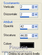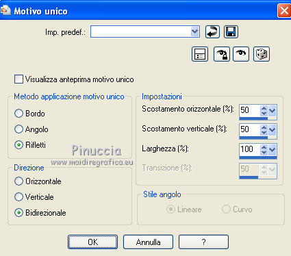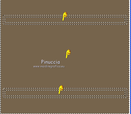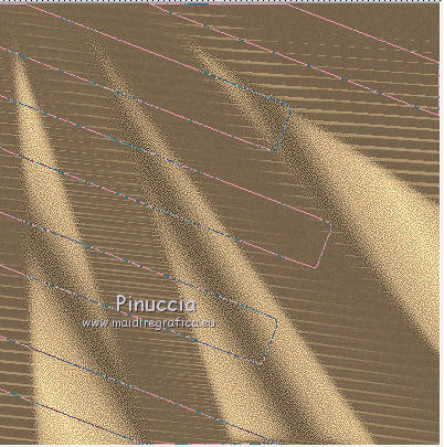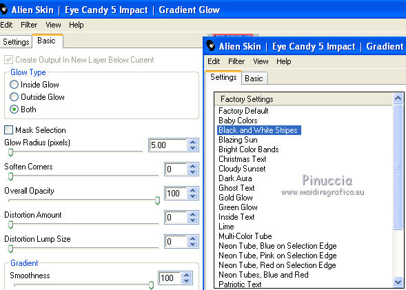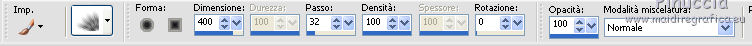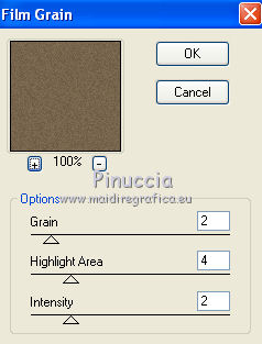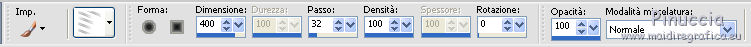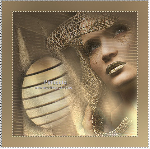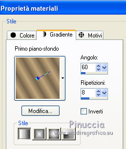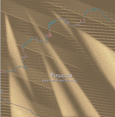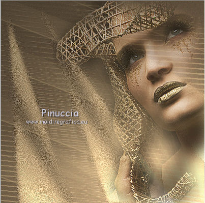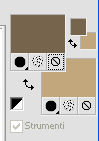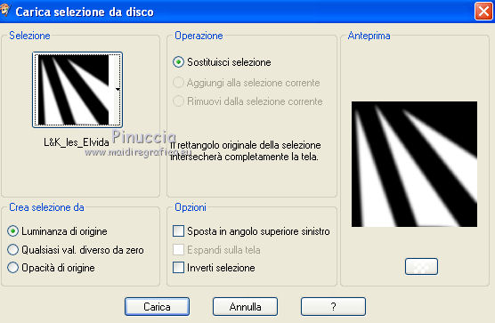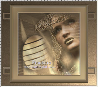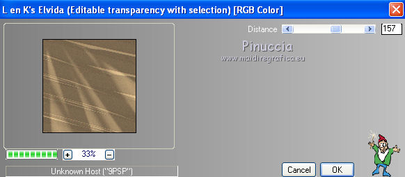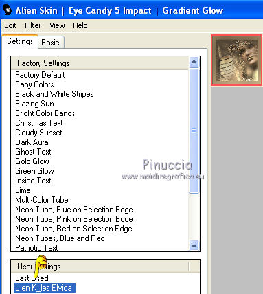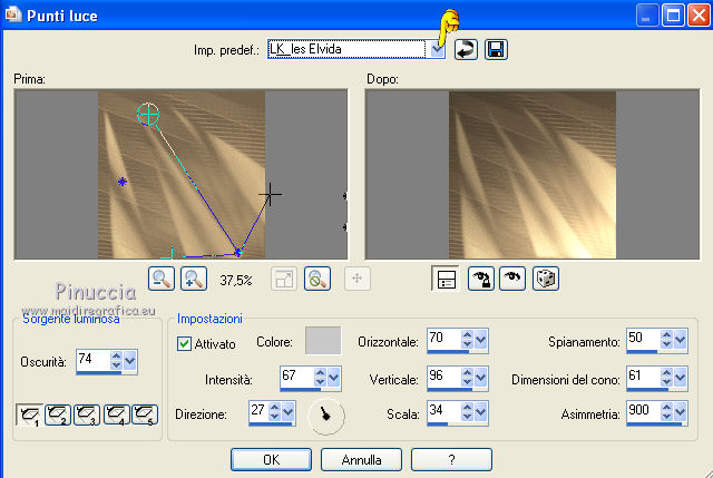 qui puoi trovare qualche risposta ai tuoi dubbi. Se l'argomento che ti interessa non è presente, ti prego di segnalarmelo. Questo tutorial è stato scritto e tradotto con Corel X, ma può essere realizzato anche con le altre versioni di PSP. Dalla versione X4, il comando Immagine>Rifletti è stato sostituito con Immagine>Capovolgi in orizzontale, e il comando Immagine>Capovolgi con Immagine>Capovolgi in verticale. Nelle versioni X5 e X6, le funzioni sono state migliorate rendendo disponibile il menu Oggetti. Con la nuova versione X7, sono tornati Rifletti>Capovolgi, ma con nuove varianti. Vedi la scheda sull'argomento qui Occorrente: Materiale qui Filtri: FM Tile Tools - Blend Emboss qui Alien Skin Eye Candy 5 Impact qui L & K Elvida qui Artistic - Film Grain qui Metti il preset L&K_lesElvida nella cartella del filtro: Alien Skin Eye Candy 5 Impact>Settings>Glow. Se preferisci, puoi importare il preset direttamente dalla cartella in cui hai scompattato il materiale. Vedi la scheda del filtro qui e come importare un preset in Eye Candy qui Metti i pennelli L&K_les_Elvida e L&K_les_Elvida_2, con i rispettivi Script, nella cartella Pennelli. Se hai problemi con i pennelli, vedi alcuni appunti qui Metti il Preset Lights_L&K_lesElvida nella cartella Impostazioni Predefinite. (Nello zip trovi il preset anche per l'uso in PSP 9) Metti le selezioni nella cartella Selezioni. Apri il resto del materiale in PSP. Preparazione. Scegli due colori dal tube, e imposta il colore di primo piano con il colore scuro (il mio #76644c), e il colore di sfondo con il colore chiaro (il mio #c2a77c). ![]() 1. Apri una nuova immagine trasparente 400 x 400 pixels, e riempila con il colore scuro di primo piano.2. Effetti>Plugins>Artistic - Film Grain. ![]() 3. Passa il colore di primo piano a Gradiente di primo piano/sfondo, ![]() 4. Selezione>Carica/Salva selezione>Carica selezione da disco. Cerca e carica la selezione L&K_les_Elvida. ![]() 5. Riempi la selezione con il gradiente.![]() 6. Mantieni selezionato. 7. Ancora una volta: Effetti>Plugins>Artistic - Film Grain, con gli stessi settaggi. 8. Selezione>Inverti. 9. Effetti>Plugins>L&K site of wonders - Elvida: ![]() 10. Di nuovo Selezione>Inverti. 11. Effetti>Effetti di bordo>Aumenta. 12. Selezione>Deseleziona. 13. Inverti i colori nella paletta dei materiali. ![]() 14. Attiva lo strumento Pennello , cerca e seleziona il pennello L&K_les_Elvida con i seguenti settaggi. ![]() 15. Applica il pennello con il colore di primo piano: ![]() 16. Cerca e seleziona il pennello L&K_les_Elvida 2: ![]() 17. Applica il pennello come mostrato nella schermata. ![]() 18. Effetti>Effetti di illuminazione>Punti luce. Cerca e seleziona il preset L&K les Elvida, e clicca ok. cambiando il valore di Oscurità puoi schiarire l'effetto che può essere differente a seconda dei colori che stai usando. Per questo, se stai usando altri colori, dovrai valutare il settaggio in base a questi ![]() Attenzione, se intendi realizzare lo script, fai una copia di questo sfondo usando la combinazione di tasti maiuscola+D e mettila da parte 19. Apri il tube L&K les Elvida meisje: (se vuoi usare un altro tube, deve avere un'altezza di 400 pixels). 20. Modifica>Copia. 21. Torna al tuo lavoro e vai a Modifica>Incolla come nuovo livello. 22. Sposta il tube a destra.se stai usando un altro tube, dovrai scegliere l'opacità più adatta ![]() 23. Apri il tube J&K les Elvida. (se stai usando altri colori: Regola>Tonalità e Saturazione>Viraggio, con i settaggi adatti ai tuoi colori. Sul Viraggio vedi qui). 24. Modifica>Copia. Torna al tuo lavoro e vai a Modifica>Incolla come nuovo livello. 25. Sposta il tube a sinistra.![]() 26. Immagine>Aggiungi bordatura, 1 pixel, simmetriche, con il colore chiaro di primo piano. 27. Modifica>Copia. 28. Immagine>Aggiungi bordatura, 35 pixels, simmetriche, con il colore scuro di sfondo. 29. Attiva lo strumento Bacchetta magica ![]() ![]() 30. Clicca sul bordo scuro per selezionarlo. 31. Modifica>Incolla nella selezione. 32. Regola>Sfocatura>Sfocatura gaussiana - raggio 70. ![]() 33. Mantieni selezionato. ![]() 34. Immagine>Aggiungi bordatura, 15 pixels, simmetriche, con il colore scuro. 35. Selezione>Inverti. 36. Effetti>Plugins>Alien Skin Eye Candy 5 Impact - Gradient Glow. seleziona il preset L&K les Elvida e ok. ![]() In caso di problemi nell'uso di questo preset, in alternativa: Settings: Black and White Stripes, con i settaggi standard. ![]() 38. Selezione>Deseleziona. 39. Immagine>Aggiungi bordatura, 1 pixel, simmetriche, con il colore nero. Metti da parte questo lavoro per il momento. 40. Apri una nuova immagine trasparente 620 x 550 pixels. Cambia i colori nella paletta dei materiali portando il colore scuro come colore di primo piano e il gradiente come colore di sfondo. ![]() 41. Riempi l'immagine trasparente con il colore scuro.Selezione>Carica/Salva selezione>Carica selezione da disco. Cerca e carica la selezione L&K les Elvida 2. ![]() 42. (attenzione, non devi riempire la selezione!!). Effetti>Plugins>Alien Skin Eye Candy 5 Impact - Gradient Glow. Preset L en K les Elvida e ok. 43. Selezione>Deseleziona. 44. Attiva lo strumento Bacchetta magica ![]() ![]() Clicca sui 3 punti indicati per selezionarli. ![]() 45. Effetti>Plugins>Artistic - Film Grain, con i settaggi precedenti. Mantieni selezionato. 46. Effetti>Plugins>FM Tile Tools - Blend Emboss, con i settaggi standard. ![]() Mantieni selezionato. 47. Effetti>Effetti di illuminazione>Punti luce, con i settaggi precedenti. 48. Selezione>Inverti. 49. Effetti>Effetti 3D>Sfalsa ombra. ![]() 50. Selezione>Deseleziona. 51. Di nuovo: Effetti>Plugins>Alien Skin Eye Candy 5 Impact - Gradient Glow, con i settaggi precedenti. 52. Attiva il lavoro che hai messo da parte al punto 39 e vai a Modifica>Copia. 53. Torna al tuo lavoro 620 x 500 pixels, e vai a Modifica>Incolla come nuovo livello. ![]() 54. Immagine>Aggiungi bordatura, 1 pixel, simmetriche, con il colore nero. Il lavoro è terminato. Non dimenticare di firmarlo