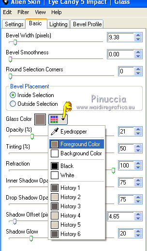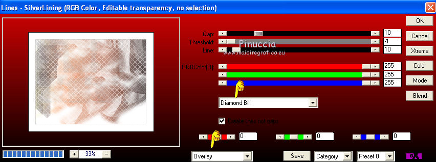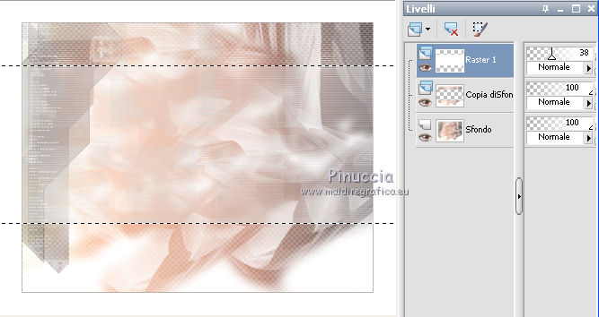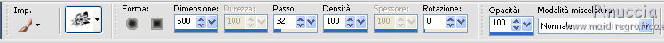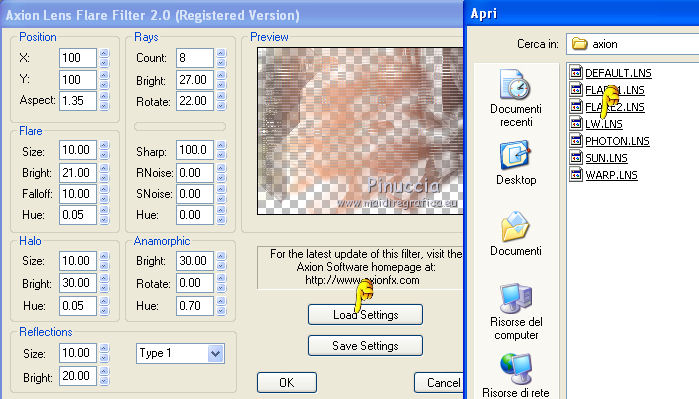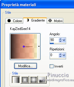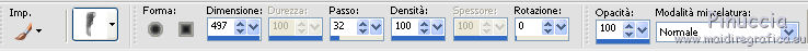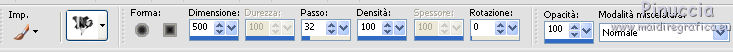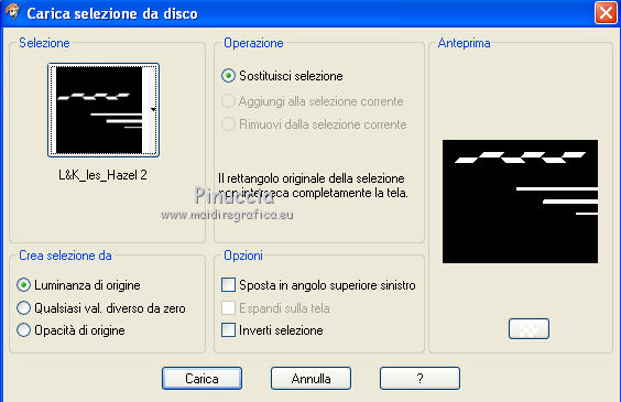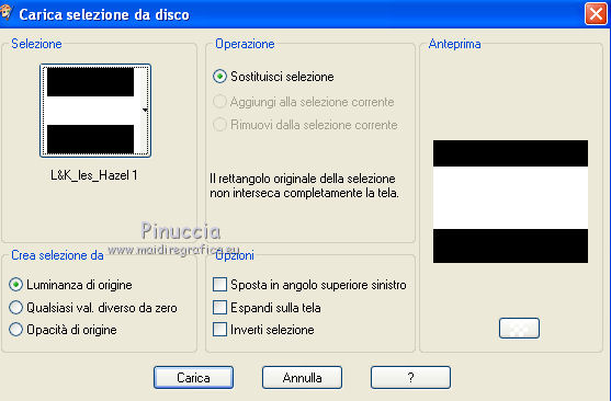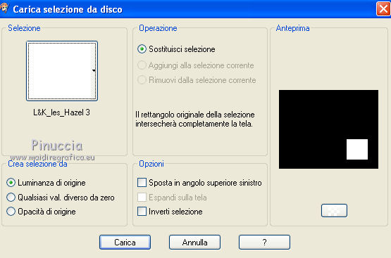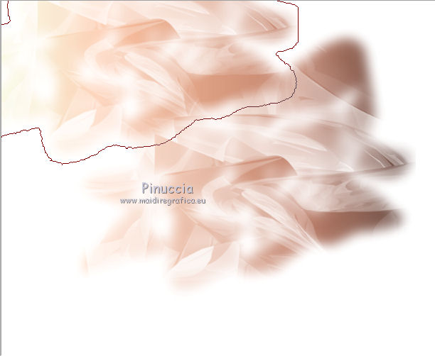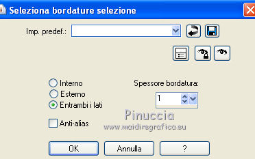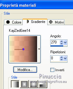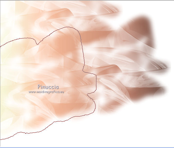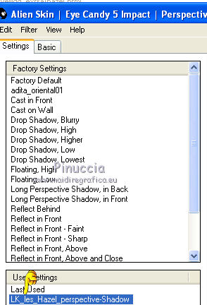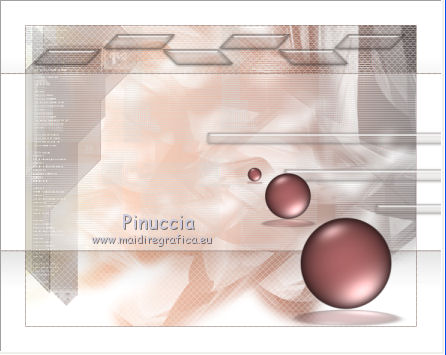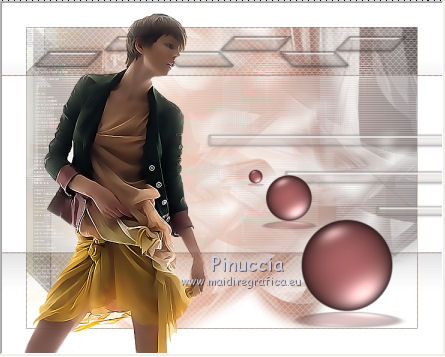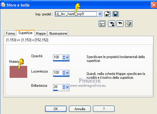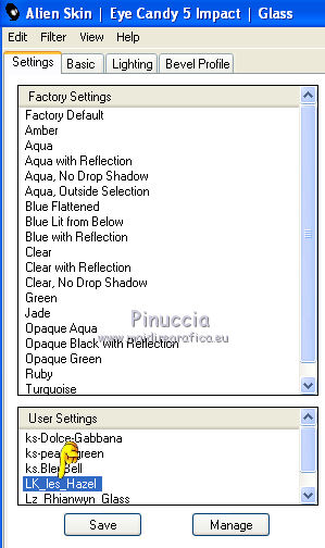 qui puoi trovare qualche risposta ai tuoi dubbi. Se l'argomento che ti interessa non è presente, ti prego di segnalarmelo. Questo tutorial è stato scritto e tradotto con PSP X. Occorrente: Materiale qui Filtri: Axion - Lens Flare qui AP 01 [Innovation] qui Eye Candy 3.1 qui Alien Skin Eye Candy 5 Impact qui Jetty ha creato uno speciale script che trovi qui Grazie Jetty (il suo sito non è più in rete) Metti il preset L&K_les_hazel Glass e L&K_les_hazel_perspective-Shadow nella cartella del filtro Alien Skin Eye Candy 5 Impact>Settings>Glass, e Alien Skin Eye Candy 5 Impact>Settings>Shadow. Se preferisci, puoi importarli, quando ti serviranno, direttamente dalla cartella in cui hai scompattato il materiale. Vedi la scheda del filtro qui e come importare un preset in Eye Candy qui Metti le selezioni nella cartella Selezioni. Metti il preset BallsAndBubbles L&K_les_Hazel nella cartella Impostazioni predefinite. Metti il gradiente Kayzedgee14 nella cartella Gradienti. Metti i pennelli nella cartella Pennelli. Imposta il colore di primo piano con un colore scuro scelto dal tuo tube (il mio #94817a), e il colore di sfondo con il bianco. ![]() Passa il colore di primo piano a Gradiente e scegli un gradiente con 2 o 3 colori abbinati alla tua immagine. Nel mio esempio ho usato il gradiente KayZedGee14. (assicurati che il colore scuro si trovi a destra, se così non fosse, cambia l'angolo a 90 ![]() 1. Apri una nuova immagine bianca 650 x 500 pixels. ![]() 2. Livelli>Nuovo livello raster (lavorerai su questo livello, fino a che non sarà scritto di aggiungerne un altro). 3. Attiva lo strumento Pennello ![]() cerca e seleziona il pennello L&K_les Hazel_1. ![]() applica il pennello come nell'esempio. ![]() 4. Applicalo ancora una volta in alto a sinistra. ![]() 5. Applica per la terza volta il pennello come nell'esempio. ![]() 6. Seleziona il pennello L&K_les Hazel_2. ![]() e applica il pennello come nell'esempio. ![]() 7. Seleziona il terzo pennello L&K_les Hazel_3. ![]() applica questo pennello come nell'esempio. ![]() 8. Ancora una volta: ![]() 9. Un'ultima volta, applica il pennello come nell'esempio. ![]() 10. Cambia i settaggi del gradiente in modo che il colore scuri si trovi a sinistra, portando l'angolo a 90. ![]() 11. Seleziona il pennello L&K_les Hazel_4. ![]() applica il pennello come nell'esempio. ![]() 12. Effetti>Plugins>Axion - Lens Flare. clicca su Load Settings e seleziona LW.LNS. ![]() 13. Duplica l'immagine usando la combinazione di tasti maiuscola+D e metti da parte la copia che ti servirà per lo sfondo, se vorrai realizzare lo script. 14. Torna al lavoro originale. Immagine>Aggiungi bordatura, 1 pixel, simmetriche, con il colore nero. 15. Immagine>Aggiungi bordatura, 40 pixels, simmetriche, con il colore bianco. 16. Livelli>Duplica. 17. Effetti>Plugins>AP 01[Innovation] - Lines SilverLining. 1.porta i colori RGB a 255 2.seleziona Diamond Bill 3.Seleziona Overlay e ok. ![]() 18. Selezione>Carica/Salva selezione>Carica selezione da disco. Cerca e carica la selezione L&K_les_Hazel_1. ![]() 19. Premi sulla tastiera il tasto CANC. Mantieni selezionato. 20. Inverti i colori nella paletta dei materiali in modo che il colore bianco passi a colore di primo piano. ![]() 21. Livelli>Nuovo livello raster. 22. Strumento Riempimento ![]() ![]() riempi la selezione con il colore bianco. 23. Nella paletta dei livelli abbassa l'opacità di questo livello al 38%. ![]() 24. Mantieni ancora selezionato. 25. Effetti>Plugins>Eye Candy 3.1 - Drop Shadow. ![]() 26. Mantieni ancora selezionato. 27. Livelli>Nuovo livello raster. 28. Selezione>Modifica>Seleziona bordature selezione, antialias non selezionato. ![]() 29. Inverti i colori cliccando sulla freccia tra le due palettine per portare il colore scuro a colore di primo piano. ![]() 30. Ingrandisci l'immagine attivando lo strumento Zoom o usando la rotellina del mouse,31. Riempi la selezione con il colore scuro.impostando la modalità dello Strumento Riempimento in modalità Nessuno, sarà sufficiente un solo clic per riempire entrambe le linee. ![]() 32. Selezione>Deseleziona. 33. Effetti>Plugins>AP 01[Innovation] - Lines SilverLining, con i settaggi precedenti. 34. Selezione>Carica/Salva selezione>Carica selezione da disco. Cerca e carica la selezione L&K_les_Hazel_2. ![]() 35. Effetti>Plugins>Alien Skin Eye Candy 5 Impact - Glass. Seleziona il preset LK_les_Hazel. Se stai usando altri colori, sotto Basic, imposta Glass color con il tuo colore di primo piano. ![]() ![]() 36. Selezione>Deseleziona. 37. Livelli>Disponi>Sposta giù. ![]() 38. Livelli>Unisci>Unisci tutto. 39. Livelli>Nuovo livello raster. 40. Selezione>Carica/Salva selezione>Carica selezione da disco. Cerca e carica la selezione L&K_les_Hazel_3. ![]() 41. Effetti>Effetti artistici>Sfere e bolle. seleziona il preset L&K_les Hazel (il preset creato con PSP 9 funziona anche con la X). Se stai usando altri colori, clicca con il tasto destro della palettina e scegli uno dei tuoi colori o il tuo gradiente. ![]() 42. Selezione>Deseleziona. 43. Effetti>Plugins>Alien Skin Eye Candy 5 Impact - Perspective Shadow, seleziona il preset LK_les_Hazel_perspective-shadow e ok. ![]() 44. Livelli>Duplica. 45. Immagine>Ridimensiona, al 50%, tutti i livelli non selezionato. ![]() 46. Livelli>Duplica. 47. Immagine>Ridimensiona, al 30%, tutti i livelli non selezionato. 48. Sposta le due sfere come preferisci (dipende dal tube che stai usando).![]() 49. Apri il tube Marif_2006_juillet_misted lady e vai a Modifica>Copia. 50. Torna al tuo lavoro e vai a Modifica>Incolla come nuovo livello. 51. Sposta il tube a sinistra.![]() 52. Livelli>Nuovo livello raster. 53. Selezione>Seleziona tutto. 54. Selezione>Modifica>Seleziona bordature selezione: ![]() Ingrandisci l'immagine per vedere meglio la selezione. 55. Riempi la selezione con il colore scuro.Selezione>Deseleziona. 56. Effetti>Plugins>AP01[Innovation] - Lines SilverLining, con i settaggi precedenti. 57. Aggiungi il tuo nome e/o il tuo watermark. 57. Liv