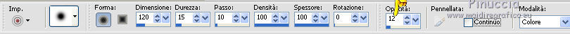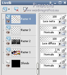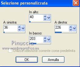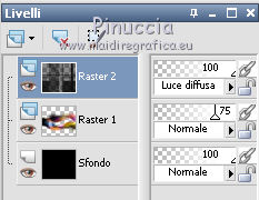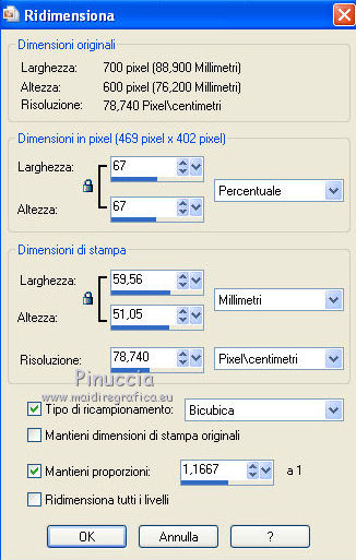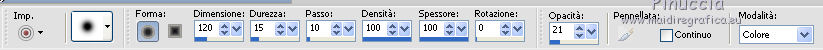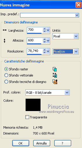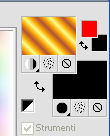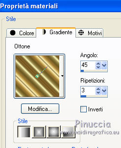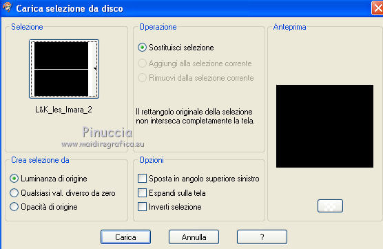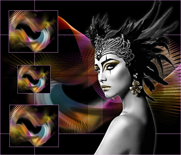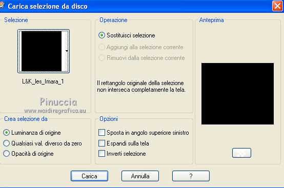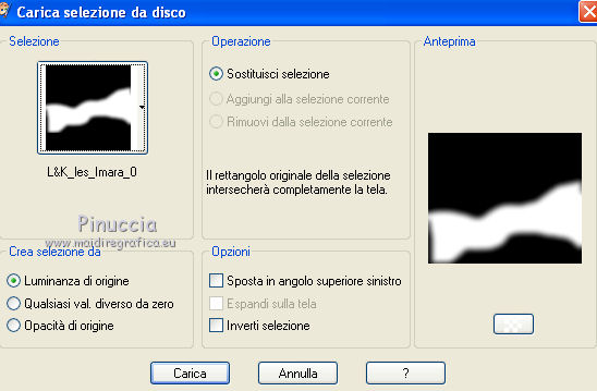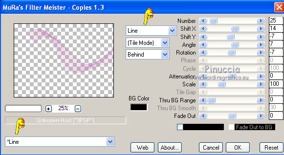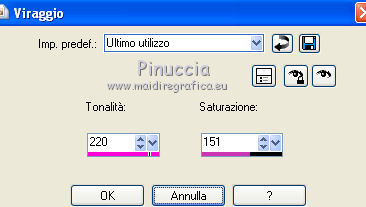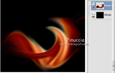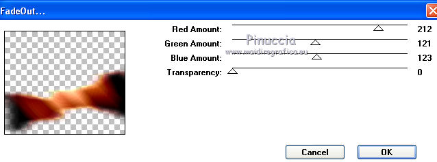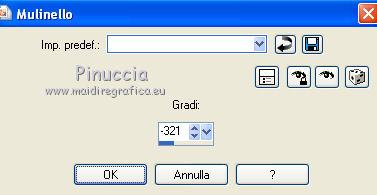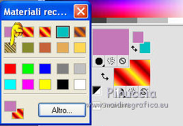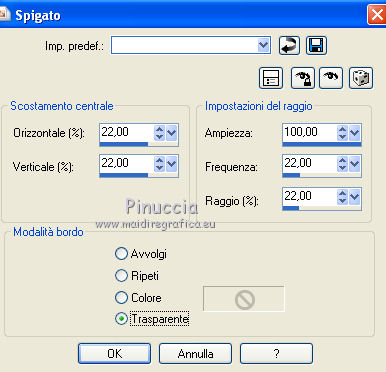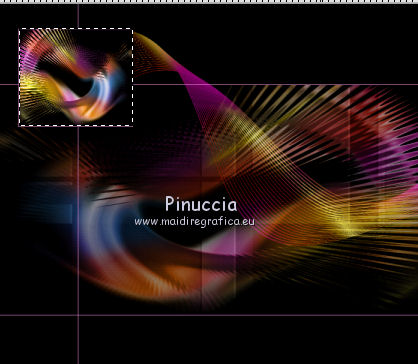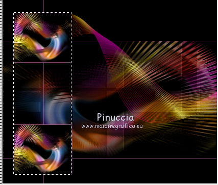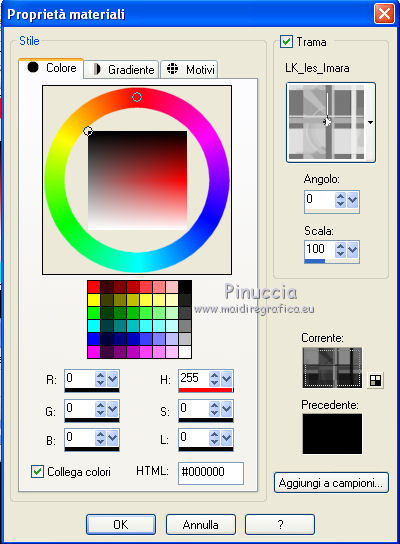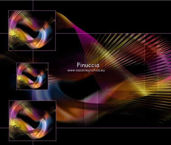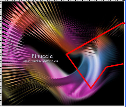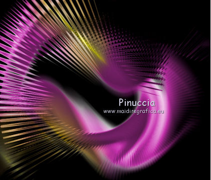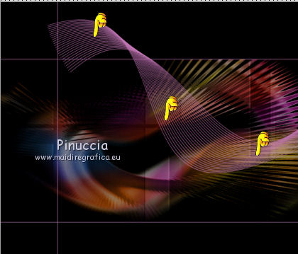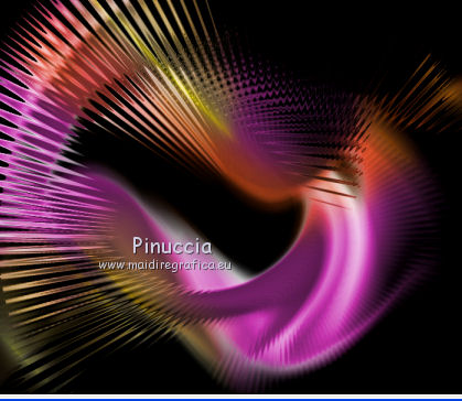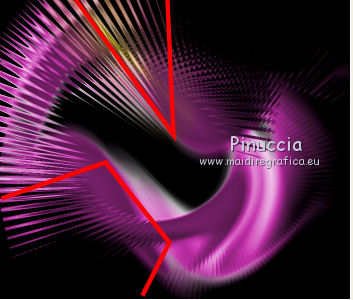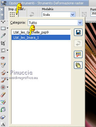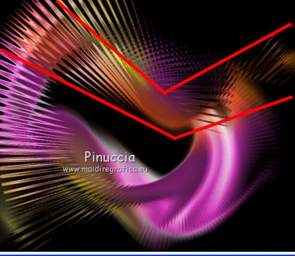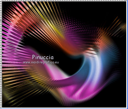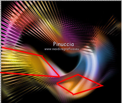qui puoi trovare qualche risposta ai tuoi dubbi. Se l'argomento che ti interessa non è presente, ti prego di segnalarmelo. Questo tutorial è stato scritto con PSP XI, ma può essere eseguito anche con le altre versioni di PSP. Per tradurlo ho usato PSP X. Occorrente: Materiale qui Il tube usato è di Mariel. Filtri: Crescent Moon qui Mura's Meister - Copies qui Lidy ha creato uno speciale script che trovi qui. Grazie Lidy. Metti i gradienti nella cartella Gradienti. Metti le selezioni nella cartella Selezioni. Metti la trama nella cartella Trame. Metti il preset L&K_les Imara nella cartella Impostazioni predefinite. Apri il resto del materiale in PSP. Passa il colore di primo piano a Gradiente, e seleziona il gradiente metallico Ottone (nelle versioni più recenti Corel_06_17), con i seguenti settaggi: ![]() Imposta il colore di sfondo con il colore nero. ![]() Queste impostazioni sono obbligatorie: se stai usando altri colori, dovrai colorizzare (sul Viraggio vedi qui). 1. Apri una nuova immagine NERA 700 x 600 pixels. ![]() 2. Livelli>Nuovo livello raster. 3. Selezione>Carica/Salva selezione>Carica selezione da disco. Cerca e carica la selezione L&K_les_imara_0. ![]() 4. Riempi ![]() la selezione con il gradiente. 5. Selezione>Deseleziona. 6. Regola>Sfocatura>Sfocatura da movimento. ![]() 7. Effetti>Effetti di distorsione>Vento - da destra, intensità 100. ![]() 8. Effetti>Plugins>Crescent Moon - Fade Out. ![]() 9. Effetti>Effetti di distorsione>Onda. ![]() 10. Livelli>Duplica. 11. Effetti>Effetti di distorsione>Mulinello: ![]() 12. Effetti>Effetti di distorsione>Spigato. ![]() 13. Livelli>Unisci>Unisci visibile. ![]() 14. Di nuovo: Livelli>Duplica. 15. Immagine>Rifletti. 16. Immagine>Capovolgi. 17. Effetti>Effetti di immagine>Scostamento. ![]() ![]() 18. Ancora: Effetti>Effetti di distorsione>Spigato, con i settaggi precedenti. 19. Livelli>Unisci>Unisci giù. Potrai cambiare più tardi con i colori che preferisci. Quello che segue è soltanto una guida, scegli i tuoi colori adattandoli al tuo tube. 20. Scegli un colore dalla tua immagine. Se il colore principale del tuo tube è l'arancio, non dovrai colorizzare. Regola>Tonalità e Saturazione>Viraggio, con i settaggi corrispondenti al tuo colore. I miei: ![]() 21. Attiva lo strumento Trasforma in destinazione con i seguenti settaggi:![]() 22. Il materiale di primo piano è ancora impostato con il gradiente metallico. Sei libero di scegliere il gradiente che preferisci. Passa il mouse tenendo premuto il tasto sinistro del mouse varie volte nell'area tra le righe rosse. Ripeti in basso a sinistra, come nell'esempio. ![]() ![]() 23. Cambia il materiale di primo piano con un altro gradiente (o con un colore pieno). Per il mio esempio ho scelto il gradiente The Great Pumpkin (i settaggi non sono importanti). ![]() Passa il mouse sull'area indicata tra le linee rosse. ![]() ![]() 24. Abbassa l'opacità dello strumento Trasforma in destinazione al 12%. ![]() 25. Cambia il colore di primo piano; per il mio esempio ho scelto un blue. ![]() 26. Ripeti la colorazione nell'area tra le linee rosse. ![]() ![]() 27. Cambia ancora una volta il materiale di primo piano, impostando il gradiente Paperdolldesign_084 (i settaggi non sono importanti). ![]() 28. Colora l'area tra le righe rosse. ![]() ![]() 29. Fai due copie di questa immagine usando la combinazione maiuscola+D. Una copia ti servirà come sfondo se vorrai realizzare lo script, e una copia ti servirà più tardi. Torna al tuo lavoro. 30. Premi il tasto D per attivare lo strumento Deformazione ![]() apri il menu dello strumento e seleziona il preset L&K_les_Imara_1. ![]() Non devi far altro. Clicca sulla manina per non visualizzare più la griglia.31. Immagine>Rifletti. 32. Abbassa l'opacità di questo livello tra il 70 e l'80% (dipende dai colori e dal tube che userai). 33. Livelli>Nuovo livello raster. 34. Inverti i materiali, in modo da avere il colore di primo piano impostato con il nero. qui seleziona Trama e imposta la trama L&K_les_Imara con i seguenti settaggi. ![]() 35. Riempi il livello con questo colore+trama.36. Nella paletta dei livelli cambia la modalità di miscelatura in Luce diffusa. ![]() 37. Ancora una volta tasto D sulla tastiera per attivare lo strumento Deformazione ![]() e seleziona di nuovo il preset L&K_les_Imara_1. 38. Passa il colore di primo piano con un altro colore abbinato al tuo lavoro, (per il mio esempio ho scelto il rosa #c478b7) e togli la selezione a Trama. ![]() 39. Livelli>Nuovo livello raster. 40. Selezione>Carica/Salva selezione>Carica selezione da disco. Cerca e carica la selezione L&K_les_imara_1. ![]() 41. Riempi la selezione con il colore di primo piano.Attiva lo strumento Zoom o usa la rotellina del mouse per ingrandire l'immagine,e visualizzare meglio lo spazio da riempire. ![]() 42. Livelli>Nuovo livello raster. 43. Selezione>Carica/Salva selezione>Carica selezione da disco. Cerca e carica la selezione L&K_les_imara_2. ![]() 44. Ancora una volta ingrandisci l'immagine, e Riempi la selezione con il colore di primo piano.45. Selezione>Deseleziona. 46. Effetti>Effetti di distorsione>Onda, con i settaggi precedenti. 47. Effetti>Plugins>Mura's Meister - Copies. ![]() 48. Attiva nuovamente lo strumento Trasforma in destinazione con i settaggi precedenti.49. Clicca con il tasto destro sulla palettina del colore di primo piano e ti apparirà la tabellina dei colori più recenti. Clicca sul gradiente metallico per selezionarlo. ![]() 50. Colora l'immagine con il gradiente nei punti indicati. ![]() 51. Nella paletta dei livelli cambia la modalità di miscelatura in Luce netta, o Filtra o Differenza (scegli la modalità che preferisci). ![]() Attiva una copia dell'immagine che hai minimizzato prima. ![]() 52. Immagine>Ridimensiona, al 27%, tutti i livelli selezionato. 53. Immagine>Aggiungi bordatura, 1 pixel, simmetriche, con un colore scelto dalle linee della selezione, nel mio caso il rosa. 54. Modifica>Copia. Se intendi realizzare lo script, salva que
