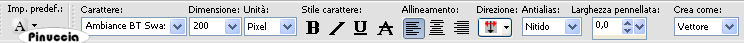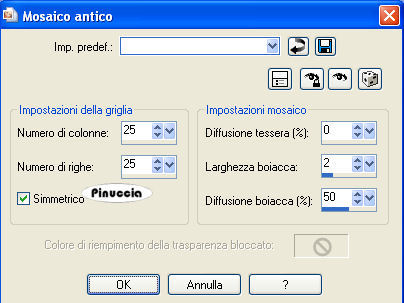 qui puoi trovare qualche risposta ai tuoi dubbi. Se l'argomento che ti interessa non è presente, ti prego di segnalarmelo. Questo tutorial è stato scritto in PSP X, ma può essere eseguito anche con le altre versioni di PSP. Occorrente: Materiale: qui (Attenzione: i livelli dei tubes sono chiusi) I tubes sono di Suzy Sgai Apri i tubes in PSP. Apri il font e minimizzalo nella tua area di lavoro. Lo troverai nella lista dei font disponibili quando ti servirà. Imposta il colore di sfondo con il nero e il colore di primo piano con il bianco. 1. Apri una nuova immagine BIANCA 650 x 500 pixels. Attiva il tube del viso "SS 829 Tube" e vai a Modifica>Copia. Torna al tuo lavoro e vai a Modifica>Incolla come nuovo livello. Sposta il tube a sinistra, contro il bordo.Livelli>Duplica. Regola>Sfocatura>Sfocatura gaussiana, raggio 20. ![]() Effetti>Effetti di trama>Mosaico antico, con i seguenti settaggi. ![]() Livelli>Disponi>Sposta giù. Livelli>Duplica. Immagine>Rifletti. 2. Attiva il livello superiore. Attiva lo strumento Testo ![]() Seleziona il font Ambiance BT Swash, con i seguenti settaggi. dimensione 200, pennellata 0, vettore: ![]() Scrivi la lettera S con il colore nero. Usa i nodi vettori per estendere la lettera per tutta la larghezza della tela. Livelli>Converti in livello raster. Cambia la modalità di miscelatura di questo livello in Sovrapponi. ![]() 3. Livelli>Nuovo livello raster. Selezione>Seleziona tutto. Riempi con il bianco.ricorda che hai il bianco impostato come colore di sfondo. Quindi, per riempire, devi cliccare con il tasto destro del mouse. Selezione>Modifica>Contrai di 10 pixels. Premi sulla tastiera il tasto CANC ![]() Selezione>Deseleziona. Livelli>Duplica. Immagine>Ridimensiona, all'80%, tutti i livelli non selezionato, per 2 volte. Immagine>Ruota per gradi - 90 gradi a sinistra: ![]() 4. Attiva lo strumento Bacchetta magica ![]() ![]() e clicca all'interno della cornice bianca per selezionarlo. Livelli>Nuovo livello raster. Selezione>Modifica>Espandi di 2 pixels. Riempi con un colore scuro scelto dall'immagine.Selezione>Deseleziona. Effetti>Effetti 3D>Sfalsa ombra, con i seguenti settaggi, colore nero. ![]() Livelli>Duplica. Immagine>Capovolgi. Livelli>Unisci>Unisci giù. Livelli>Disponi>Sposta giù. Cambia la modalità di miscelatura di questo livello in Scurisci. poichè il risultato non mi piaceva, ho preferito la modalità in Moltiplica ![]() 5. Attiva il tube della farfalla "SS 1476 Tube" e vai a Modifica>Copia. Torna al tuo lavoro. Posizionati sul livello superiore e vai a Modifica>Incolla come nuovo livello. Sposta il tube nell'angolo in basso a sinistra.Livelli>Duplica. Regola>Sfocatura>Sfocatura gaussiana, raggio 20. Effetti>Effetti di trama>Mosaico antico, con i settaggi precedenti. Livelli>Disponi>Sposta giù. Attiva il livello superiore della farfalla. Effetti>Effetti 3D>Sfalsa ombra, con i settaggi precedenti. 6. Livelli>Nuovo livello raster. Attiva lo strumento Selezione rettangolo,e traccia un rettangolo dove vuoi aggiungere il testo, vedi il mio esempio. Riempi la selezione con il bianco.Abbassa l'opacità di questo livello al 50%. Selezione>Deseleziona. 7. Attiva lo strumento Testo , e scrivi il tuo testo con il font usato prima, dimensione 72.Livelli>Converti in livello raster. Cambia la modalità di miscelatura di questo livello in Scurisci. nell'esempio sotto il titolo, ho saltato il passo 6 e cambiato la modalità di miscelatura del testo in Sovrapponi. L'esempio con i passaggi appena descritti è in fondo al tutorial. Aggiungi il tuo nome e/o il tuo watermark. Immagine>Aggiungi bordatura, 1 pixel, simmetriche, con un colore scuro scelto dall'immagine. Immagine>Aggiungi bordatura, 5 pixels, simmetriche, con il colore bianco. ![]() ![]() Se hai problemi o dubbi, o trovi un link non funzionante, o anche soltanto per un saluto, scrivimi. 30 Gennaio 2008 |