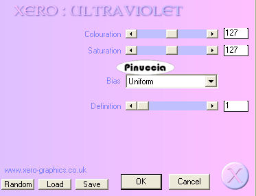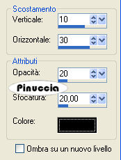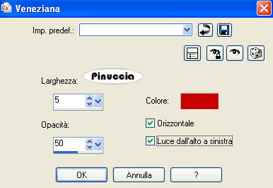 qui puoi trovare qualche risposta ai tuoi dubbi. Se l'argomento che ti interessa non è presente, ti prego di segnalarmelo. Questo tutorial è stato scritto con PSP X, ma può essere eseguito anche con le altre versioni di PSP. Occorrente: Materiale qui I tubes sono di Mariel Filtri: Xero - Ultraviolet qui Filters Unlimited 2.0 qui Apri il font e minimizzalo nella tua area di lavoro. Lo troverai nella lista dei font disponibili, quando ti servirà. Apri tutti i tubes in PSP. Imposta il colore di primo piano e il colore di sfondo con il bianco. 1. Apri una nuova immagine BIANCA 650 x 500 pixels. Attiva MarieL_2006_09Septembre_smoke14t, e vai a Modifica>Copia. Torna al tuo lavoro e vai a Modifica>Incolla come nuovo livello. Livelli>Duplica. Immagine>Rifletti. Livelli>Unisci>Unisci giù. Sposta questo livello in basso, ma senza toccare il bordo.Livelli>Duplica. Immagine>Capovolgi. 2. Attiva MarieL_2006_09Septembre_smoke11t, e vai a Modifica>Copia. Torna al tuo lavoro e vai a Modifica>Incolla come nuovo livello. Livelli>Duplica. Attiva MarieL_2006_11Novembre_color01t, e vai a Modifica>Copia. Torna al tuo lavoro e vai a Modifica>Incolla come nuovo livello. Sposta questo tube a sinistra,e abbassa l'opacità del livello all'87%. Attiva MarieL_2006_11Novembre_AdRo03t, e vai a Modifica>Copia. Torna al tuo lavoro e vai a Modifica>Incolla come nuovo livello. Sposta il tube a destra,e abbassa l'opacità del livello all'87%. Livelli>Unisci>Unisci tutto. Effetti>Plugins>Xero - Ultraviolet, con i settaggi standard. ![]() 3. Attiva MarieL_2006_09Septembre_GaHa02t, e vai a Modifica>Copia. Torna al tuo lavoro e vai a Modifica>Incolla come nuovo livello. Effetti>Effetti 3D>Sfalsa ombra, con i seguenti settaggi, colore nero: ![]() Ripeti l'Effetto Sfalsa ombra ancora una volta. Attiva MarieL_2006_11Novembre_SNM04t, e vai a Modifica>Copia. Torna al tuo lavoro e vai a Modifica>Incolla come nuovo livello. Sposta il tube in basso a destra.Effetti>Effetti 3D>Sfalsa ombra, con i settaggi precedenti, 2 volte. 4. Livelli>Nuovo livello raster. Attiva lo strumento Selezione , rettangolo,e traccia un rettangolo in basso (vedi il mio esempio). Riempi la selezione con il colore bianco.Selezione>Deseleziona. Effetti>Effetti di trama>Veneziana, con i seguenti settaggi: come colore scegli un marrone scuro: ![]() Abbassa l'opacità di questo livello al 50%. 5. Attiva lo strumento Testo ![]() seleziona il font Inspiration, con i seguenti settaggi: ![]() Scrivi il tuo testo. Livelli>Converti in livello raster. Effetti>Effetti 3D>Sfalsa ombra, con i seguenti settaggi, colore nero: ![]() Aggiungi il tuo nome e/o il tuo watermark. Livelli>Unisci>Unisci tutto. Effetti>Plugins>Filters Unlimited 2.0 - Buttons & Frames - Retangular Button, imposta Frame Size a 10, lascia il resto come sta, e clicca Apply. ![]() Effetti>Plugins>Xero - Ultraviolet, con i settaggi standard. Salva in formato jpg. ![]() Se hai problemi o dubbi, o trovi un link non funzionante, o anche soltanto per un saluto, scrivimi. 9 Gennaio 2008 |