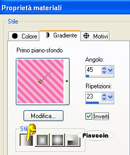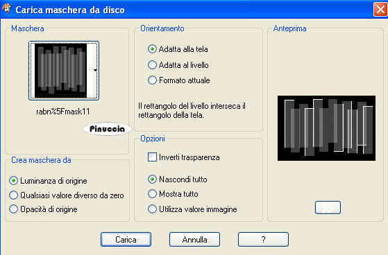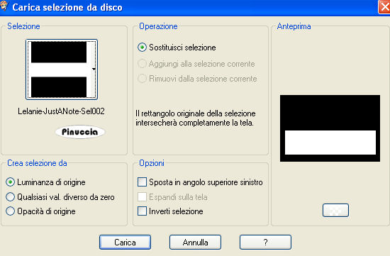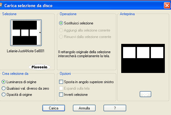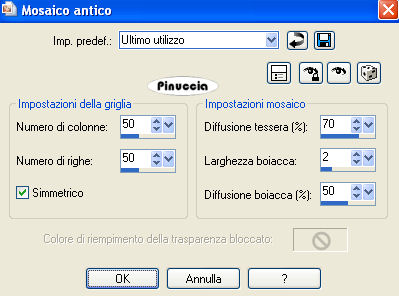 qui puoi trovare qualche risposta ai tuoi dubbi. Se l'argomento che ti interessa non è presente, ti prego di segnalarmelo. Questo tutorial è stato scritto in PSP X, ma può essere eseguito anche con le altre versioni di PSP. Occorrente: Materiale: qui Il tube è di Marif Filtro Graphics Plus qui Metti la maschera nella cartella Maschere. Metti le selezioni nella cartella Selezioni. Scegli due colori dal tube, uno scuro per il colore di sfondo e uno chiaro per il colore di primo piano. 1. Apri una nuova immagine BIANCA 664 x 444 pixels, e riempila con il colore scuro di sfondo.ricorda che, per riempire con il colore di sfondo, devi cliccare con il tasto destro del mouse. Selezione>Seleziona tutto. Selezione>Modifica>Contrai di 1 pixel. Riempi con il colore chiaro di primo piano.Selezione>Modifica>Contrai, di 2 pixels. Riempi con il colore scuro di sfondo.Selezione>Modifica>Contrai, di 2 pixels. Selezione>Innalza selezione a livello. 2. Livelli>Nuovo livello raster. Riempi questo livello con il colore chiaro di primo piano.Livelli>Carica/Salva maschera>Carica maschera da disco. Cerca e carica la maschera rabn%5Fmask11, con i seguenti settaggi: ![]() Livelli>Unisci>Unisci gruppo. Selezione>Deseleziona. Regola>Messa a fuoco>Metti a fuoco. Effetti>Plugins>Graphics Plus - Cross Shadow, con i settaggi standard. ![]() Livelli>Duplica. Livelli>Duplica. 3. Apri il tube di Marif. I livelli sono chiusi. Attiva il livello del tube e vai a Modifica>Copia. Non chiudere il tube, perchè ti servirà ancora. una piccola curiosità: puoi anche copiare il tube lasciando chiuso il livello. Potrai aprirlo dopo averlo incollato sul tuo lavoro. Torna al tuo lavoro e vai a Modifica>Incolla come nuovo livello. Sposta il tube a destra.Livelli>Disponi>Sposta giù. Ripeti 2 volte in modo che il livello del tube si trovi sotto il livello della maschera. ![]() Livelli>Duplica. Attiva il livello inferiore. Effetti>Effetti di distorsione>Vento - da destra, intensità 100. ![]() Ripeti l'Effetto vento: Modifica>Ripeti Vento. 4. Livelli>Duplica. Immagine>Rifletti. Livelli>Unisci>Unisci giù. Livelli>Duplica. Immagine>Capovolgi. Livelli>Unisci>Unisci giù. 5. Effetti>Effetti di trama>Mosaico antico, con i seguenti settaggi: ![]() Cambia la modalità di miscelatura di questo livello in Sovrapponi, e abbassa l'opacità al 50%. Effetti>Effetti di bordo>Aumenta. Attiva il livello originale del tube e cambia la modalità di miscelatura di questo livello in Luce diffusa. ![]() ![]() 6. Attiva il livello superiore. Livelli>Nuovo livello raster. Selezione>Carica/Salva selezione>Carica selezione da disco. Cerca e carica la selezione Lelanie-JustANote -Sel001: ![]() Riempi la selezione con il colore scuro di sfondo.Selezione>Modifica>Contrai di 3 pixels. Riempi con il colore chiaro di primo piano.Selezione>modifica>Contrai, di 3 pixels. Riempi con il colore scuro di sfondo.Selezione>Deseleziona. Regola>Messa a fuoco>Metti a fuoco, 2 volte. 7. Attiva lo strumento bacchetta magica ![]() ![]() clicca all'interno dei quadrati per selezionarli. Selezione>Innalza selezione a livello. Passa il colore di sfondo a Gradiente di primo piano/sfondo, stile lineare, con i seguenti settaggi: ![]() Riempi la selezione con il gradiente.Abbassa l'opacità al 21%, e cambia la modalità di miscelatura di questo livello in Luce netta, o la modalità che ritieni più adatti ai colori che hai usato. Effetti>Plugins>Graphics Plus - Cross Shadow, con i settaggi standard. Selezione>Deseleziona. 8. Attiva il livello inferiore dei blocchi (Raster 2) Effetti>Effetti 3D>Sfalsa ombra, con i seguenti settaggi, colore nero: ![]() 9. Attiva il livello superiore. Aggiungi nei quadrati il testo che preferisci. Io ho usato il font FFX Casual (che trovi nello zip), dimensione 72. Effetti>Plugins>Graphics Plus - Cross Shadow, con i settaggi standard. Ripeti l'Effetto Sfalsa ombra, con i settaggi precedenti. 10. Livelli>Nuovo livello raster. Selezione>Carica/Salva selezione>Carica selezione da disco. Cerca e carica la selezione Lelanie-JustANote-Sel002. ![]() Riempi la selezione con il colore scuro di sfondo.ricordati che hai ancora il gradiente come colore di sfondo. Riporta l'impostazione al colore scuro. Selezione>Modifica>Contrai di 3 pixels. Riempi con il colore chiaro di primo piano.Selezione>Modifica>Contrai, di 3 pixels. Riempi con il colore scuro di sfondo.Effetti>Effetti di trama>Veneziana, con i seguenti settaggi, colore nero: ![]() Selezione>Deseleziona. Effetti>Effetti 3D>Sfalsa ombra, con i settaggi precedenti. 11. Attiva nuovamente il tube e vai a Modifica>Copia. Torna al tuo lavoro e vai a Modifica>Incolla come nuovo livello. Immagine>Ridimensiona, al 90%, tutti i livelli non selezionato. Sposta il tube in basso, in modo da nascondere le braccia tagliate (vedi il mio esempio).Effetti>Effetti 3D>Sfalsa ombra, con i settaggi precedenti. Aggiungi il tuo nome e/o il tuo watermark. 12. Chiudi il livello di sfondo e posizionati su uno degli altri livelli. Livelli>Unisci>Unisci visibile. Rendi nuovamente visibile il livello di sfondo e rimani posizionato su questo livello. Selezione>Seleziona tutto. Selezione>Modifica>Contrai, di 5 pixels. Selezione>inverti. Attiva il livello superiore e premi una volta sulla tastiera il tasto CANC. Selezione>Deseleziona. Immagine>Aggiungi bordatura, 1 pixel, simmetriche, con il colore di sfondo. ![]() ![]() Se hai problemi o dubbi, o trovi un link non funzionante, o anche soltanto per un saluto, scrivimi. 30 Gennaio 2008 |