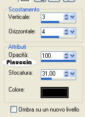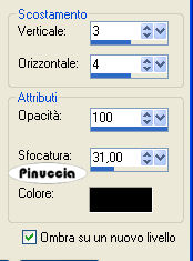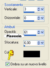Effetti>Effetti 3D>sfalsa ombra, con i seguenti settaggi, colore nero, ombra su nuovo livello selezionato.
