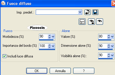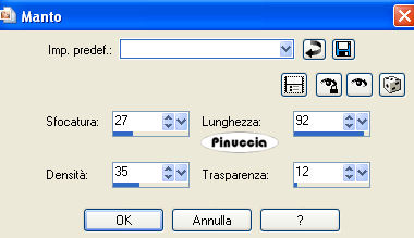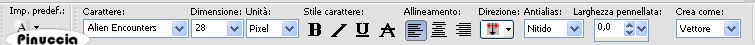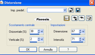 qui puoi trovare qualche risposta ai tuoi dubbi. Se l'argomento che ti interessa non è presente, ti prego di segnalarmelo. Questo tutorial è stato scritto con PSP X, ma può essere eseguito anche con le altre versioni di PSP. Occorrente: Materiale qui Metti la selezione nella cartella Selezioni. Apri il font e minimizzalo nella tua area di lavoro. Lo troverai nella lista dei font disponibili quando ti servirà. Imposta il colore di primo piano con #f08129, e il colore di sfondo con #cc0829. Apri una nuova immagine bianca 750 x 580 pixels. Apri l'immagine di sfondo "Image2", e vai a Modifica>Copia. Torna al tuo lavoro e vai a Modifica>Incolla come nuovo livello. Effetti>Effetti di trama>Manto, con i seguenti settaggi. ![]() Livelli>Duplica. Regola>Morbidezza>Fuoco diffuso, con i seguenti settaggi: ![]() Livelli>Nuovo livello raster. Passa il colore di primo piano a Gradiente di primo piano/sfondo, con i seguenti settaggi: ![]() Riempi il livello con il gradiente.Cambia la modalità di miscelatura di questo livello in Rafforza. Livelli>Duplica. Immagine>Ridimensiona, all'80%, tutti i livelli non selezionato. Selezione>Carica/Salva selezione>Carica selezione da disco. Cerca e carica la selezione "Lelanie_Renee_001": ![]() Selezione>Inverti. Premi sulla tastiera il tasto CANC ![]() Selezione>Deseleziona. Attiva lo strumento Spostamento e usa le frecce della tastiera per spostare il rettangolo a sinistra.(per il mio esempio, l'ho spostato fino al bordo). sull'uso delle frecce della tastiera abbinato allo strumento Spostamento, vedi qui Livelli>Duplica. Immagine>Rifletti. Livelli>Unisci>Unisci giù. Effetti>Effetti di distorsione>Distorsione, con i seguenti settaggi: ![]() Cambia la modalità di miscelatura di questo livello in Rafforza. nel mio esempio ho abbassato l'opacità del livello al 60%. Decidi tu se fare altrettanto. Livelli>Duplica. Immagine>Rifletti. Ancora Livelli>Duplica. Selezione>Seleziona tutto. Selezione>Mobile. Selezione>Immobilizza. Riempi con il colore di primo piano.Selezione>Modifica>Contrai - 5 pixels. Premi sulla tastiera il tasto CANC. Cambia la modalità di miscelatura di questo livello Filtra, se hai seguito il mio esempio, riporta l'opacità al 100%. Selezione>Deseleziona. Livelli>Duplica. Immagine>Rifletti. Livelli>Unisci>Unisci tutto. Apri il tube Jet-leaves1-oktober-2007, e vai a Modifica>Copia. Torna al tuo lavoro e vai a Modifica>Incolla come nuovo livello. E' già correttamente posizionato, non occorre spostarlo. Apri il tube della donna, e vai a Modifica>Copia. Torna al tuo lavoro e vai a Modifica>Incolla come nuovo livello. Immagine>Ridimensiona, al 90%, tutti i livelli non selezionato. Sposta il tube a sinistra, contro il bordo.Attiva il livello delle foglie. Livelli>Duplica. Livelli>Disponi>Porta in alto. Attiva lo strumento Selezione a mano libera , da punto a punto,e seleziona il pezzo di corda sopra il braccio. ![]() Selezione>Inverti. Premi sulla tastiera il tasto CANC. Attiva lo strumento Pennello "chiarisci/scurisci" ![]() e cancella attentamente sul lato sinistro un pezzetto di corda che deve diventare più scuro. per usare questo strumento, si usa il tasto sinistro del mouse per schiarire, e il tasto destro per scurire. ![]() Attiva lo strumento Testo ,seleziona il font Alien Encounters, con i seguenti settaggi: ![]() Inverti i colori di primo piano e di sfondo. Così avrai il colore scuro come colore di primo piano e il gradiente come colore di sfondo. Scrivi la prima lettera di un nome. Usa i nodi vettori per ingrandire la lettera. Livelli>Converti in livello raster. Scrivi il resto del testo e usa i nodi vettori per ingrandirlo. Livelli>Converti in livello raster. Posiziona il testo. Nella paletta dei livelli trascina i livelli del testo sotto il livello del tube con le foglie, e cambia la modalità di miscelatura di questi livelli in Indebolisci. Effetti>Effetti 3D>Sfalsa ombra, con i seguenti settaggi, ombra su nuovo livello selezionato. ![]() Cambia la modalità di miscelatura del livello dell'ombra in Moltiplica (puoi scegliere un'altra modalità, se ti sembra meglio). Livelli>Unisci>Unisci tutto. Livelli>Nuovo livello raster. Selezione>Seleziona tutto. Riempi il livello con il colore scuro.Selezione>Modifica>Contrai - 1 pixel. Premi sulla tastiera il tasto CANC. Aggiungi il tuo nome e/o il tuo watermark. Livelli>Unisci>Unisci tutto e salva in formato jpg. ![]() Se hai problemi o dubbi, o trovi un link non funzionante, o anche soltanto per un saluto, scrivimi. 20 Maggio 2008 |