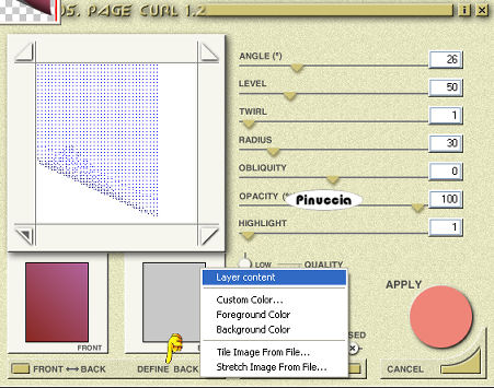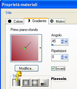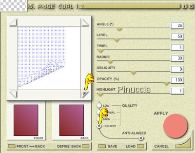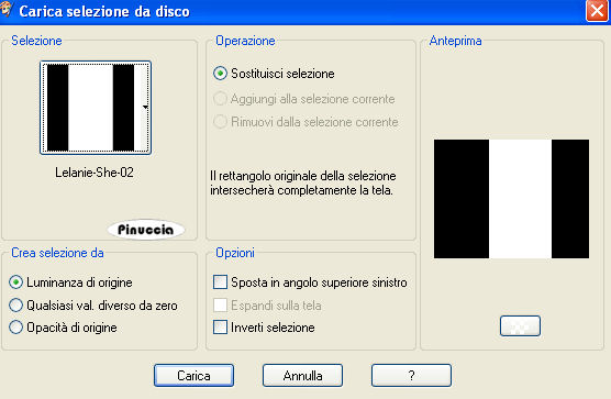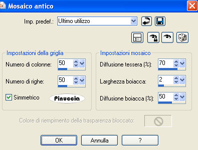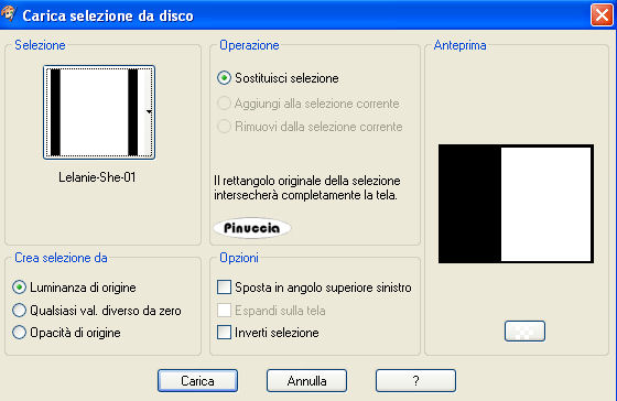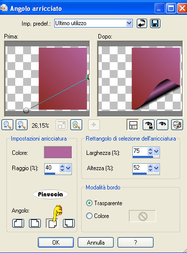 qui puoi trovare qualche risposta ai tuoi dubbi. Se l'argomento che ti interessa non è presente, ti prego di segnalarmelo. Questo tutorial è stato scritto e tradotto con PSP X, ma può essere eseguito anche con le altre versioni di PSP. Occorrente: Materiale qui Metti le Selezioni nella cartella Selezioni. Metti i pennelli nella cartella Pennelli. Attenzione, i pennelli sono entrambi composti da due files che non devono essere separati. Vedi alcuni appunti sui pennelli qui Filtro: AV Bros Pagecurl qui demo Apri i due tubes in PSP. Scegli due colori, e imposta il colore chiaro come colore di primo piano, e il colore scuro come colore di sfondo. Passa il colore di primo piano a Gradiente di primo piano/sfondo, con i seguenti settaggi: ![]() La scelta dei colori può cambiare notevolmente il risultato del tutorial. Sei libero di usare - anche nelle impostazioni dei vari effetti - anche colori diversi, per avere una resa migliore. 1. Apri una nuova immagine BIANCA 650 x 500 pixels. Attiva il tube di @nn del fiore (100407-photos...aristolochia), e vai a Modifica>copia. Torna alla tua immagine bianca e vai a Modifica>Incolla come nuovo livello. Attiva il tube di @nn della donna (160207 geneticmodification...), e vai a Modifica>Copia. Torna al tuo lavoro e vai a Modifica>Incolla come nuovo livello. Posiziona i due tubes adeguatamente,per controllare la posizione, vedi l'esempio finale. Posizionati sul livello superiore (spostando i tubes potresti trovarti su un altro livello). Livelli>Unisci>Unisci giù. Sposta il livello uniti completamente a destra.ho scritto correttamente "a destra" (non è una disattenzione). Non preoccuparti se nell'esempio vedi il tube a sinistra. , lo devi proprio mettere a destra. 2. Livelli>Duplica. Attiva il livello centrale. Regola>Sfocatura>Sfocatura radiale: ![]() Livelli>Duplica. Immagine>Rifletti. Livelli>Unisci>Unisci giù. 3. Livelli>Duplica. Effetti>Effetti di trama>Mosaico antico, con i seguenti settaggi. ![]() Cambia la modalità di miscelatura di questo livello con Colore (o, se preferisci, con una modalità che ti piace di più). Chiudi il livello del tube (il livello superiore) e posizionati su uno degli altri livelli. Livelli>Unisci>Unisci visibile. Riapri il livello del tube e posizionalo a sinistra.Effetti>Effetti 3D>Sfalsa ombra, con i seguenti settaggi, colore nero. ![]() Ripeti l'Effetto Sfalsa ombra, ma cambiando verticale con -2 e orizzontale 15. ![]() 4. Attiva il livello inferiore. Livelli>Nuovo livello raster. Selezione>Carica/Salva selezione>Carica selezione da disco. Cerca e carica la selezione Lelanie-She-01 op. ![]() Riempi la selezione con il gradiente.Selezione>Deseleziona. 5. Effetti>Plugins>AV Bros Page Curl 1.2, con i seguenti settaggi: dopo aver impostato i settaggi, clicca su Define Back e Layer content. ![]() Lascia selezionato Highest, imposta l'angolo inferiore destro e clicca Apply. ![]() L'esempio sotto è riferito al risultato con la demo del filtro. Se hai il filtro, non avrai le scritte della versione non registrata: ![]() *** Se non hai questo filtro, per ottenere approssimativamente un angolo simile a quello dell'esempio: Effetti>Effetti di immagine>Angolo arricciato, con il colore chiaro:*** ![]() Cambia la modalità di miscelatura di questo livello in Luce netta. 6. Livelli>Duplica. Ripeti Livelli>Duplica. Immagine>Rifletti. Selezione>Carica/Salva selezione>Carica selezione da disco. Cerca e carica la selezione Lelanie-She-02, e clicca ok. ![]() Premi sulla tastiera il tasto CANC ![]() Così sparirà il bordo che si vedeva sullo sfondo del tube. 7. Immagine>Aggiungi bordatura, 1 pixels, simmetriche, con il colore nero. Modifica>Copia. Immagine>Aggiungi bordatura, 20 pixels, simmetriche, con un colore qualsiasi, purchè contrastante. Seleziona il bordo con la bacchetta magica ![]() ![]() Modifica>Incolla nella selezione. Regola>Sfocatura>Sfocatura gaussiana, raggio 24. ![]() 8. Effetti>Effetti di trama>Intessitura, con i seguenti settaggi: colore intessitura: il colore chiaro; colore spazio: il colore scuro. ![]() Effetti>Plugins>Av Bros - Page Curl 1.2, con i settaggi precedenti. Se non hai il filtro: Effetti>Effetti di immagine>Angolo arricciato, con i settaggi precedenti. Non potrai selezionare la trasparenza perchè hai un unico livello. Ripeti l'Effetto AV Bros-Page curl 1.2, questa volta cliccando sull'angolo in alto a sinistra. Se non hai il filtro: Ripeti l'Effetto Angolo arricciato, selezionando l'angolo in alto a sinistra. Selezione>Deseleziona. 9. Seleziona con la bacchetta magica