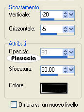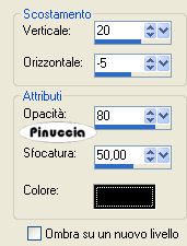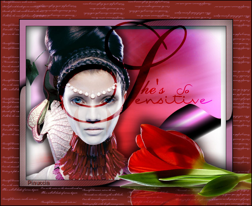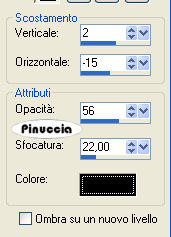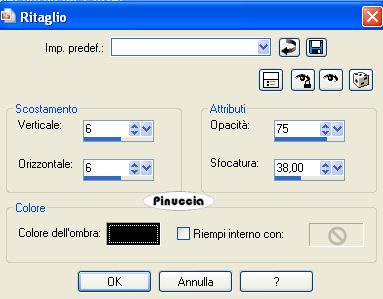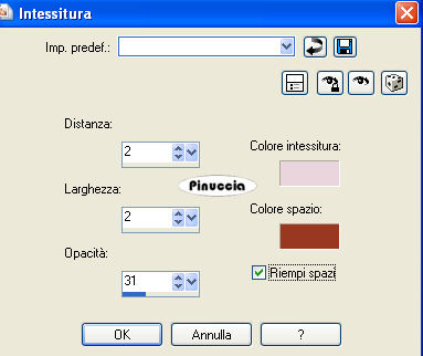 gli angoli in alto a sinistra e in basso a destra:se la selezione non prende tutto lo spazio dell'angolo arricciato, porta la tolleranza a 40, e anche più, decidi tu a seconda del risultato. Effetti>Effetti di trama>Veneziana, con i seguenti settaggi, con il colore chiaro: se l'effetto del colore chiaro non ti soddisfa, usa il colore scuro. ![]() Selezione>Deseleziona. 10. Selezione>Seleziona tutto. Selezione>Modifica>Contrai, di 20 pixels. Effetti>Effetti 3D>Ritaglio, con i seguenti settaggi. ![]() Selezione>Deseleziona. Immagine>Aggiungi bordatura, 2 pixels, simmetriche, con il colore nero. 11. Immagine>Aggiungi bordatura, 60 pixels, simmetriche, con il colore scuro. Seleziona questo bordo con la bacchetta magica ![]() Lvielli>nuovo livello raster. Attiva lo strumento Pennello ![]() Cerca e seleziona il pennello mcHT_06_SmallTekst01, e applicalo con il colore chiaro sul lato sinistro e in basso sul bordo. Selezione>Deseleziona. Livelli>Duplica. Immagine>Rifletti. Immagine>Capovolgi. 12. Attiva il tube del fiore rosso e vai a Modifica>Copia. Torna al tuo lavoro e vai a Modifica>Incolla come nuovo livello. Spostalo sul bordo interno della cornice.Livelli>Duplica. Immagine>Capovolgi. Livelli>Disponi>Sposta giù. Abbassa l'opacità di questo livello al 50%. Posiziona il fiore chiaro sotto l'altro tube in modo che sembri riflesso.13. Rimani sul livello inferiore e seleziona il bordo con la bacchetta magica ![]() Selezione>inverti. Effetti>Effetti 3D>Sfalsa ombra, con i seguenti settaggi, colore nero: ![]() Selezione>Deseleziona. Attiva il livello superiore (il fiore) e ripeti l'Effetto Sfalsa ombra, con i seguenti settaggi, colore nero: ![]() 14. Livelli>Nuovo livello raster. Attiva lo strumento Pennello ![]() Cerca e seleziona il pennello Lelanie-SHE-01 op, e applicalo una volta con il colore scuro. Vedi l'esempio finale per controllare la posizione. Effetti>Effetti di trama>Veneziana, con i settaggi precedenti. Cambia la modalità di miscelatura di questo livello in Rafforza. Aggiungi il tuo nome e/o il tuo watermark all'immagine. Immagine>Aggiungi bordatura, 2 pixels, simmetriche, con il colore nero. Immagine>Ridimensiona, al 90%, tutti i livelli selezionato. Salva in formato jpg. ![]() Se hai problemi o dubbi, o trovi un link non funzionante, o anche soltanto per un saluto, scrivimi. 21 Gennaio 2008 |