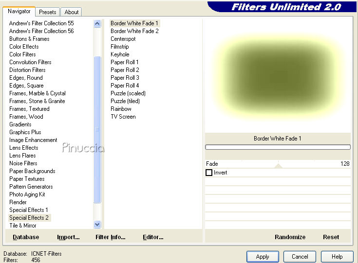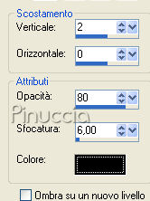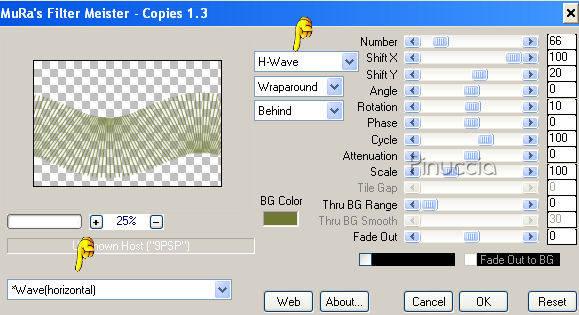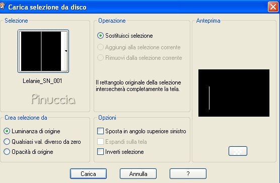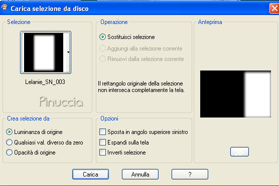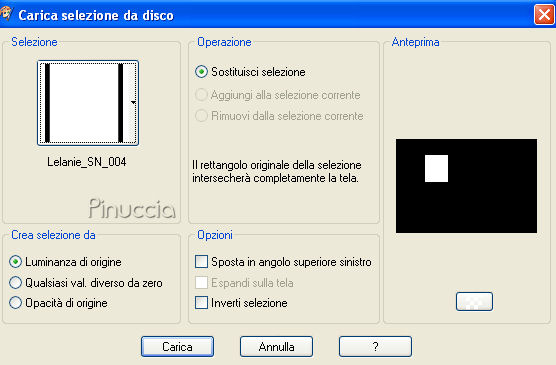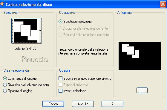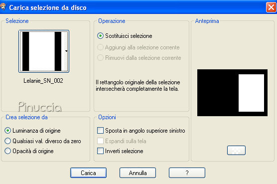 qui puoi trovare qualche risposta ai tuoi dubbi. Se l'argomento che ti interessa non è presente, ti prego di segnalarmelo. Questo tutorial è stato scritto con PSP X, ma può essere eseguito anche con le altre versioni di PSP. Occorrente: Materiale: Un'immagine, 8 Selezioni e 1 pennello qui Metti le Selezioni nella cartella Selezioni. Metti il pennello nella cartella Pennelli. Attenzione, il pennello è composto da due files che non devono essere separati. Vedi alcuni appunti sui pennelli qui Filtri: Filters Unlimited 2.0 qui Mura's Meister - Copies qui Preparazione: Apri l'immagine fornita. Questa immagine ha le dimensioni corrette per eseguire il tutorial: 267 pixels di larghezza e 400 di altezza. Se vuoi usare una delle tue immagini, mantieni queste dimensioni. Se usando Immagine>Ridimensiona, non riesci a mantenere le proporzioni, usa lo strumento Ritaglio ![]() Scegli dall'immagine un colore chiaro e un colore scuro. 1. Apri una nuova immagine BIANCA 750 x 500 pixels, e riempila con il colore scuro.Effetti>Plugins>Filters Unlimited 2.0 - Special Effects 2 - Border White Fade 1: ![]() 2. Livelli>Nuovo livello raster. Selezione>Carica/Salva selezione>Carica Selezione da disco. Cerca e carica la selezione "Lelanie_SN_001" e clicca ok. ![]() Riempi la selezione con il colore scuro.Selezione>Deseleziona. 3. Effetti>Plugins>Mura's Meister - Copies, con i seguenti settaggi: ![]() 4. Cambia la modalità di miscelatura di questo livello in Luce diffusa. Livelli>Duplica. Immagine>Capovolgi. Immagine>Rifletti. Cambia la modalità di miscelatura di questo livello in Sovrapponi. 5. Livelli>Nuovo livello raster. Selezione>Carica/Salva selezione>Carica Selezione da disco. Cerca e carica la selezione "Lelanie_SN_002" e clicca ok. ![]() Attiva l'immagine fornita, che ha le dimensioni 276x400 pixels, e vai a Modifica>Copia. Torna al tuo lavoro e vai a Modifica>Incolla nella selezione. Selezione>Deseleziona. 6. Livelli>Duplica. Attiva il livello inferiore dell'immagine (il livello originale). Effetti>Effetti di distorsione>Vento, da destra, intensità 100: ![]() Livelli>Duplica. Regola>Sfocatura>Sfocatura gaussiana, raggio 20. ![]() 7. Torna al livello sottostante (l'immagine alla quale hai applicato l'effetto Vento - Raster 2). Livelli>Duplica. Livelli>Disponi>Porta in alto. Selezione>Carica/Salva selezione>Carica Selezione da disco. Cerca e carica la selezione "Lelanie_SN_003" e clicca ok. ![]() Premi una volta sulla tastiera il tasto CANC ![]() Selezione>Deseleziona. 8. Rimani su questo livello. Livelli>Duplica. Immagine>Rifletti. Abbassa l'opacità di questo livello al 7%. Livelli>Duplica. Effetti>Effetti di distorsione>Vento, da sinistra, intensità 100: ![]() Livelli>Disponi>Sposta giù. Abbassa l'opacità di questo livello al 13% e cambia la modalità di miscelatura in Rafforza. Livelli>Unisci>Unisci tutto. 9. Livelli>Nuovo livello raster. Selezione>Carica/Salva selezione>Carica Selezione da disco. Cerca e carica la selezione "Lelanie_SN_004" e clicca ok. ![]() Attiva nuovamente l'immagine fornita. Attiva lo strumento Selezione , rettangolo,e seleziona una parte dell'immagine, il viso o quello che preferisci. Modifica>Copia. Torna al tuo lavoro e vai a Modifica>Incolla nella selezione. Selezione>Deseleziona. 10. Selezione>Carica/Salva selezione>Carica Selezione da disco. Cerca e carica la selezione "Lelanie_SN_005" e clicca ok. ![]() Torna all'immagine fornita. Selezione>Deseleziona, e seleziona un altro pezzetto dell'immagine.Modifica>Copia. Torna al tuo lavoro e vai a Modifica>Incolla nella selezione. Selezione>Deseleziona. 11. Selezione>Carica/Salva selezione>Carica Selezione da disco. Cerca e carica la selezione "Lelanie_SN_006" e clicca ok. ![]() Attiva nuovamente l'immagine fornita. Selezione>Deseleziona e seleziona un altro pezzetto dell'immagine.Modifica>Copia. Torna al tuo lavoro e vai a Modifica>Incolla nella selezione. Selezione>Deseleziona. 12. Livelli>Nuovo livello raster. Selezione>Carica/Salva selezione>Carica Selezione da disco. Cerca e carica la selezione "Lelanie_SN_007" e clicca ok. ![]() Riempi la selezione con il colore chiaro.Selezione>Modifica>Contrai, di 1 pixel. Premi sulla tastiera il tasto CANC. Selezione>Deseleziona. Regola>Messa a fuoco>Metti a fuoco, 2 volte. Effetti>Effetti 3D>Sfalsa ombra, con i seguenti settaggi, colore nero: ![]() 13. Immagine>Aggiungi bordatura, 1 pixel, simmetriche, con il colore scuro. Immagine>Aggiungi bordatura, 50 pixels, simmetriche, coni l colore bianco. 14. Selezione il bordo bianco con la bacchetta magica ![]() ![]() Selezione>Inverti. Selezione>Innalza selezione a livello. Selezione>Deseleziona. 15. Attiva il livello inferiore (lo sfondo) e riempi con il colore scuro.Effetti>Plugins>Filters Unlimited 2.0 - Special Effects - Border White Fade 1", e clicca Ok. 16. Livelli>Nuovo livello raster. Selezione>Carica/Salva selezione>Carica Selezione da disco. Cerca e carica la selezione "Lelanie_SN_008" e clicca ok. ![]() Riempi la selezione con il neroe abbassa l'opacità al 35%. Selezione>Deseleziona. 17. Attiva il livello superiore. Livelli>Nuovo livello raster. Attiva lo strumento Pennello ![]() cerca e seleziona il pennello "Lelanie_SN_Brush_001" e applicalo sull'immagine con il colore scuro. Livelli>Duplica. Cambia la modalità di miscelatura di questo livello in Luce diffusa. Livelli>Unisci>Unisci tutto (appiattisci). Immagine>Aggiungi bordatura, 1 pixel, simmetriche, con il colore scuro. Immagine>Aggiungi bordatura, 2 pixels, simmetriche, con il colore bianco. 18. Selezione>Seleziona tutto Immagine>Aggiungi bordatura, 1 pixel, simmetriche, con il colore scuro. Immagine>Aggiungi bordatura, 2 pixels, simmetriche, con il colore bianco. Selezione>Modifica>Contrai, di 52 pixels. Selezione>Innalza selezione a livello. 19. Posizionati sul livello di sfondo. Livelli>Nuovo livello raster. Riempi con il colore scuro.Selezione>Deseleziona. 20. Attiva il livello di sfondo. Livelli>Nuovo livello raster. Selezione>Carica/Salva selezione>Carica Sel