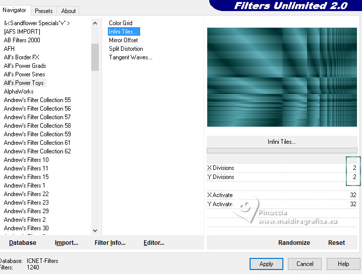5. Effects>Plugins>Filters Unlimited 2.0 - Alf's Power Toys - Infiniti Tiles.