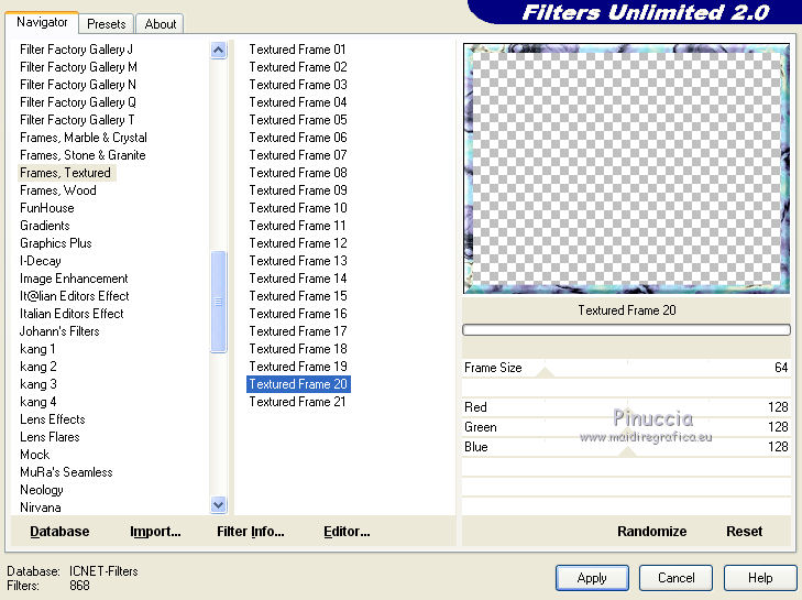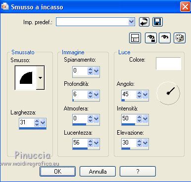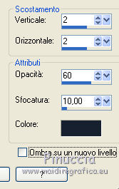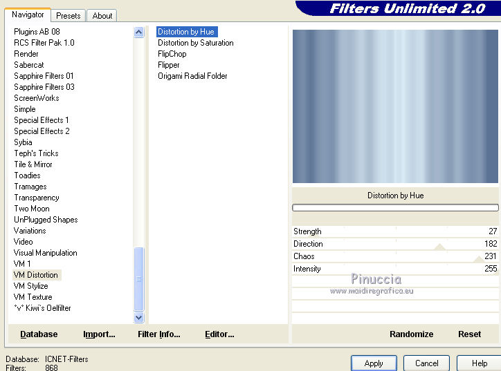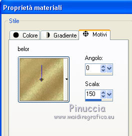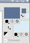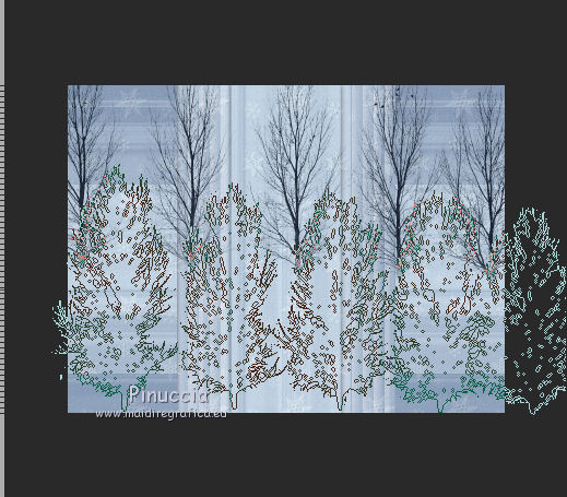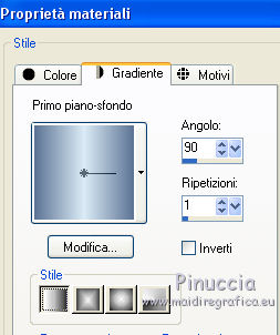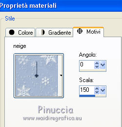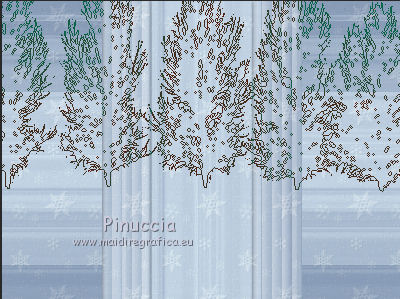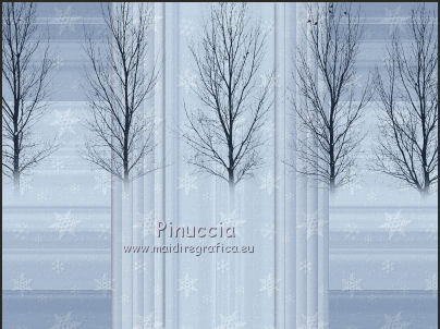 qui puoi trovare qualche risposta ai tuoi dubbi. Se l'argomento che ti interessa non è presente, ti prego di segnalarmelo. Questo tutorial è stato creato con PSP XII, ma può essere eseguito anche con le altre versioni di PSP. Dalla versione X4, il comando Immagine>Rifletti è stato sostituito con Immagine>Capovolgi in orizzontale, e il comando Immagine>Capovolgi con Immagine>Capovolgi in verticale. Nelle versioni X5 e X6, le funzioni sono state migliorate rendendo disponibile il menu Oggetti. Vedi la scheda sull'argomento qui Per tradurre questo tutorial ho usato PSP X. Occorrente. Materiale qui Il materiale utilizzato è di Libellule. Filtri: se hai problemi con il filtri consulta la mia sezione filtri qui Filters Unlimited 2.0 qui VM Distortion qui Alien Skin Eye Candy 5 Impact - Perspective Shadow qui I filtri della serie VM (Visman) si possono usare da soli o importati in Filters Unlimited (come fare vedi qui) Se un filtro fornito appare con questa icona ![]() Apri il pennello in PSP ed esportalo come Pennello personalizzato (File>Esporta>Pennello personalizzato...). Se il tuo PSP non supporta pennelli superiori a 500 pixels, prima di esportarlo, devi ridimensionarlo a 500 pixels. Vedi gli appunti sui pennelli qui Metti i motivi nella cartella Motivi. Se preferisci, puoi aprirli in PSP e minimizzarli. All'occorrenza, li troverai nella lista dei motivi disponibili. Metti la selezione nella cartella Selezioni. 1. Scegli tre colori dal tuo materiale. Serve un colore scuro, un colore chiaro e un colore medio. Questi i miei colori. ![]() Imposta il colore di primo piano con il colore medio #5c7395, e il colore di sfondo con il colore chiaro #dbecf6. ![]() Passa il colore di primo piano a Gradiente di primo piano/sfondo, stile Lineare. ![]() 2. Apri una nuova immagine trasparente 800 x 600 pixels, e riempila con il gradiente.3. Effetti>Plugins>VM Distortion - Distortion by Hue, 2 volte con i settaggi standard. ![]() Regola>Messa a fuoco>Metti a fuoco. 4. Livelli>Duplica. Immagine>Ruota per gradi - 90 gradi a sinistra. 5. Effetti>Effetti di immagine>Scostamento. ![]() Livelli>Duplica. Immagine>Rifletti. Livelli>Unisci>Unisci giù. 6. Effetti>Effetti 3D>Sfalsa ombra, con il tuo colore scuro. ![]() Ripeti l'Effetto Sfalsa ombra, cambiando verticale e orizzontale con -2. 7. Livelli>Nuovo livello raster. Passa il colore di primo piano a Motivi e seleziona la trama "neige". ![]() Riempi il livello con il motivo.Abbassa l'opacità di questo livello al 30%. 8. Attiva il livello inferiore Raster 1. Selezione>Carica/Salva selezione>Carica selezione da disco. Cerca e carica la selezione libellulegraphisme_ange_bleu. ![]() Selezione>Innalza selezione a livello. 9. Effetti>Effetti 3D>Sfalsa ombra, con il colore scuro. ![]() Ripeti l'Effetto Sfalsa ombra, cambiando verticale e orizzontale con -2. Selezione>Deseleziona. 10. Attiva nuovamente il livello Raster 1. Effetti>Effetti di trama>Veneziana. ![]() 11. Attiva nuovamente il livello superiore. Imposta il colore di primo piano con il colore scuro (#282139), e il colore di sfondo con il colore bianco. Livelli>Nuovo livello raster. Attiva lo strumento Pennello ![]() Cerca e seleziona il pennello libellulegraphisme_arbre, e mantieni i settaggi. ![]() Applica il pennello in alto a sinistra, cliccando due volte con il tasto sinistro del mouse, per usare il colore scuro di primo piano ![]() Dovresti avere questo. ![]() 12. Livelli>Nuovo livello raster. Applica nuovamente il pennello, cliccando questa volta con il tasto destro del mouse, per usare il colore bianco di sfondo. ![]() Se il tuo PSP non supporta pennelli superiori a 500 pixels, applica i pennelli con la dimensione massima e, dopo averlo applicato: Immagine>Ridimensiona, al 200%, tutti i livelli non selezionato, e dovresti avere pressappoco i pennelli come nel mio esempio. 13. Apri il tube paillettes.png e vai a Modifica>Copia. Torna al tuo lavoro e vai a Modifica>Incolla come nuovo livello. Livelli>Duplica. Immagine>Rifletti. 14. Apri il tube libellulegraphisme_ange_bleu.png e vai a Modifica>Copia. Torna al tuo lavoro e vai a Modifica>Incolla come nuovo livello. Immagine>Ridimensiona, quanto necessario, tutti i livelli non selezionato. Spostalo al centro, o dove preferisci.Effetti>Plugins>Alien Skin Eye Candy 5 Impact - Perspective Shadow. Seleziona il preset Drop Shadow,lowest e ok. ![]() 15. Livelli>Nuovo livello raster. Selezione>Seleziona tutto. Apri il tube flocons_neige.png e vai a Modifica>Copia. Torna al tuo lavoro e vai a Modifica>Incolla nella selezione. Selezione>Deseleziona. Livelli>Disponi>Sposta giù. 16. Immagine>Aggiungi bordatura, 2 pixels, simmetriche, con il colore #182130. Immagine>Aggiungi bordatura, 5 pixels, simmetriche, con il colore bianco. Attiva lo strumento Bacchetta magica , sfumatura e tolleranza 0,e clicca nel bordo bianco per selezionarlo. Passa il colore di primo piano a Motivi, e seleziona il motivo Belor. ![]() Riempi la selezione con il motivo oro.Effetti>Effetti 3D>Smusso a incasso. ![]() Selezione>Deseleziona. 17. Immagine>Aggiungi bordatura, 2 pixels, simmetriche, con il colore #182130. Immagine>Aggiungi bordatura, 25 pixels, simmetriche, con il colore bianco. Seleziona il bordo bianco con la bacchetta magica ![]() Selezione>Innalza selezione a livello. Effetti>Plugins>Filters Unlimited 2.0 - Frames Textured - Frame 20. ![]() Cambia la modalità di miscelatura di questo livello in Luce diffusa. Effetti>Effetti 3D>Smusso a incasso, con i settaggi precedenti. ![]() Selezione>Deseleziona. 18. Immagine>Aggiungi bordatura, 2 pixels, simmetriche, con il colore #182130. Immagine>Aggiungi bordatura, 5 pixels, simmetriche, con il colore bianco. Seleziona il bordo bianco con la bacchetta magica ![]() e riempilo con il motivo oro.Effetti>Effetti 3D>Smusso a incasso, con i settaggi precedenti. ![]() Selezione>Deseleziona. 19. Immagine>Aggiungi bordatura, 1 pixel, simmetriche, con il colore chiaro #dbecf6. Firma il tuo lavoro. Immagine>Ridimensiona, a 800 pixels di lar